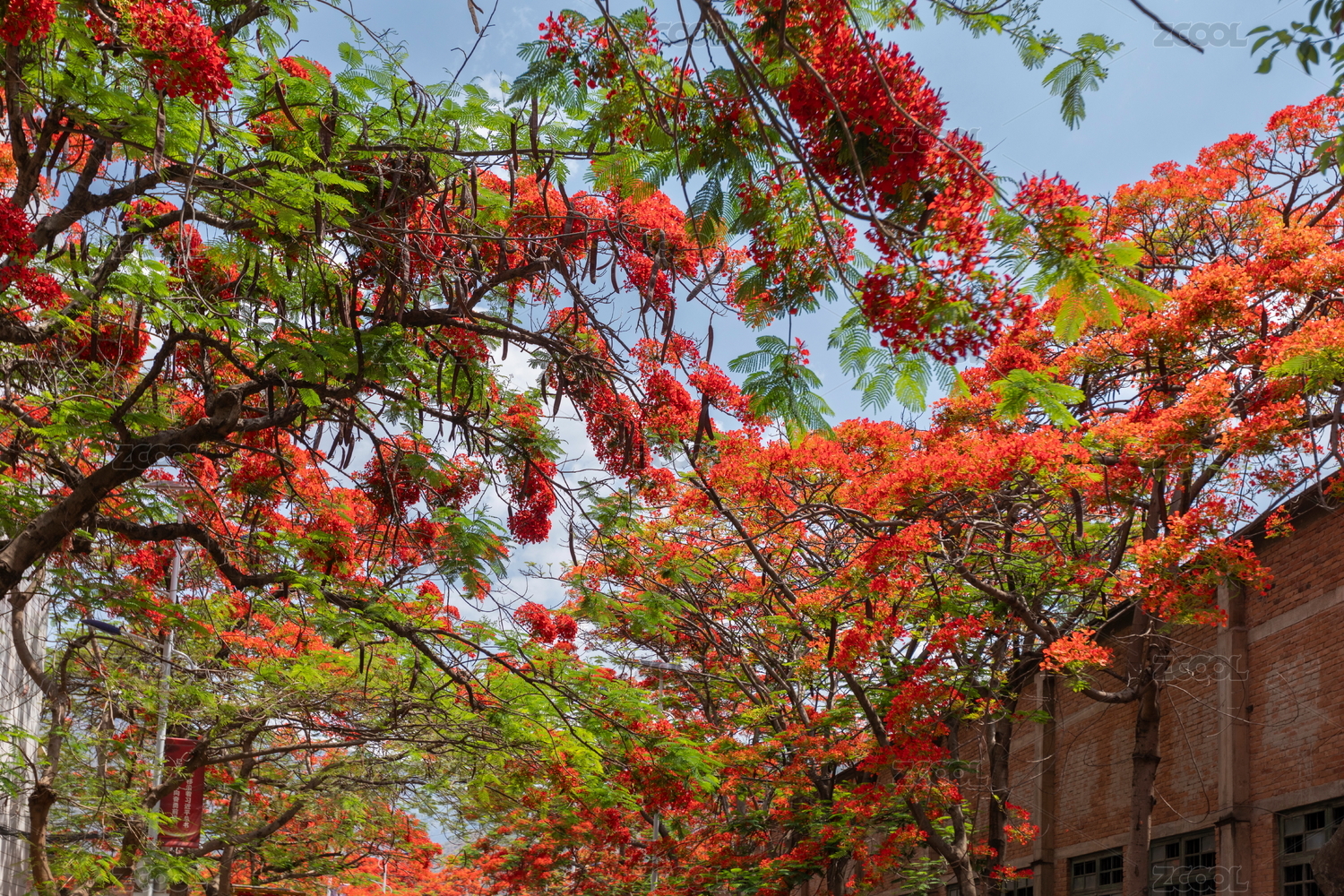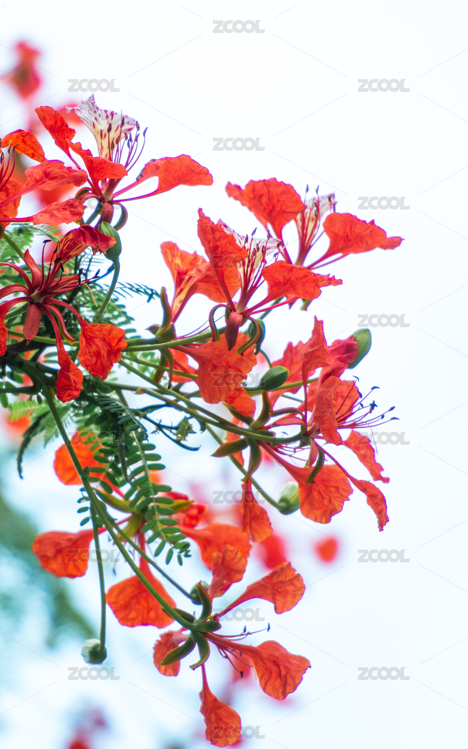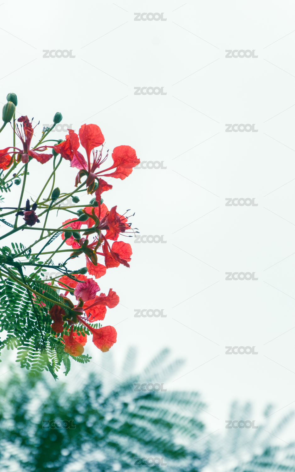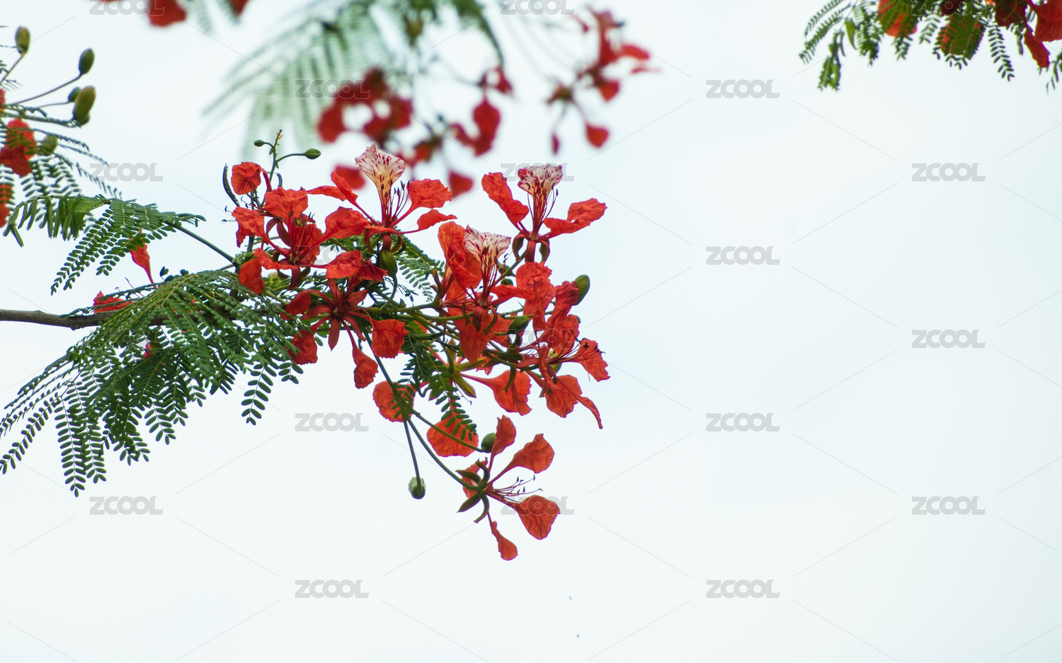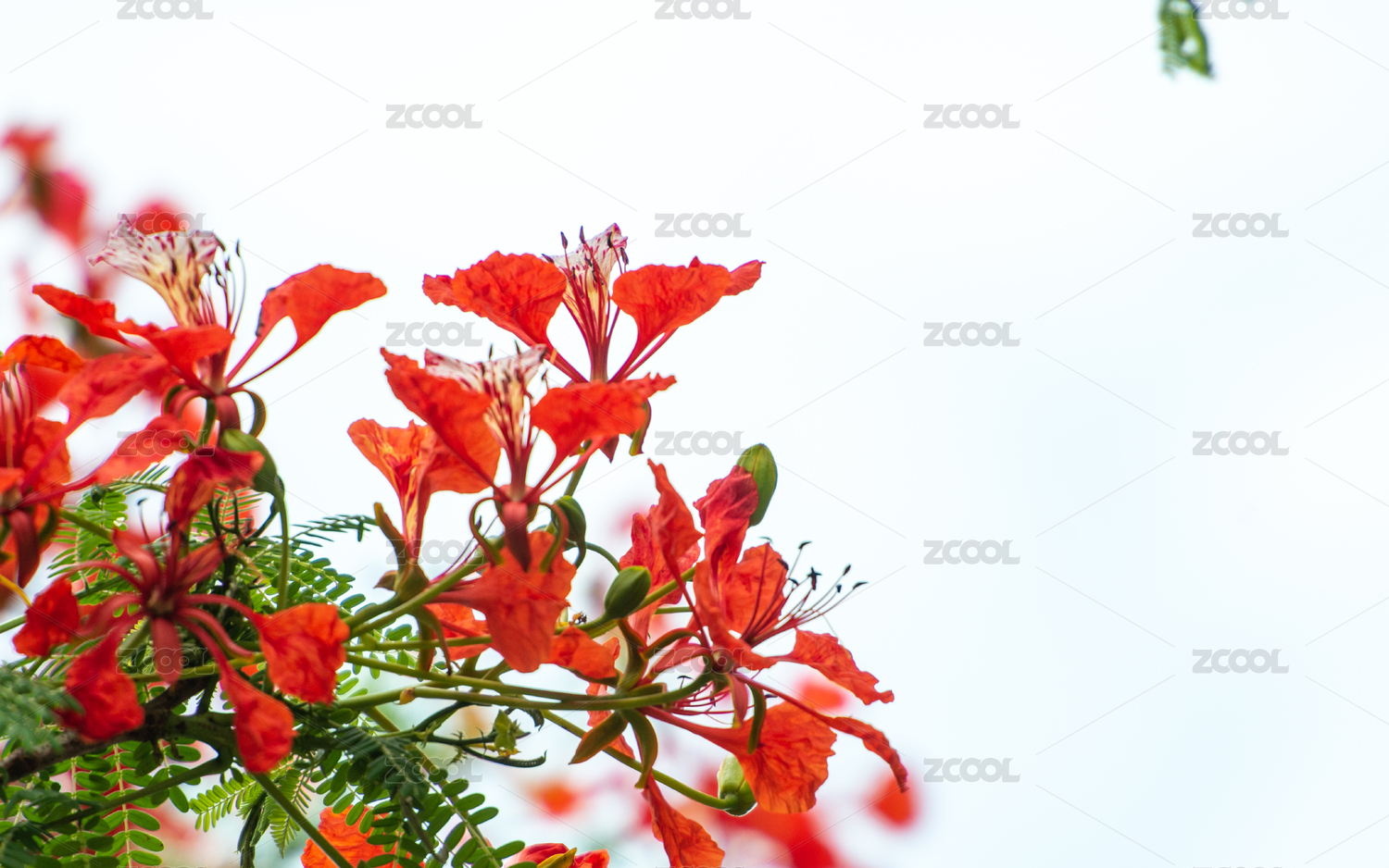 夏天盛開的紅艷艷的鳳凰花和綠葉背景