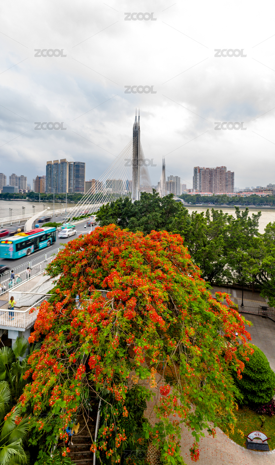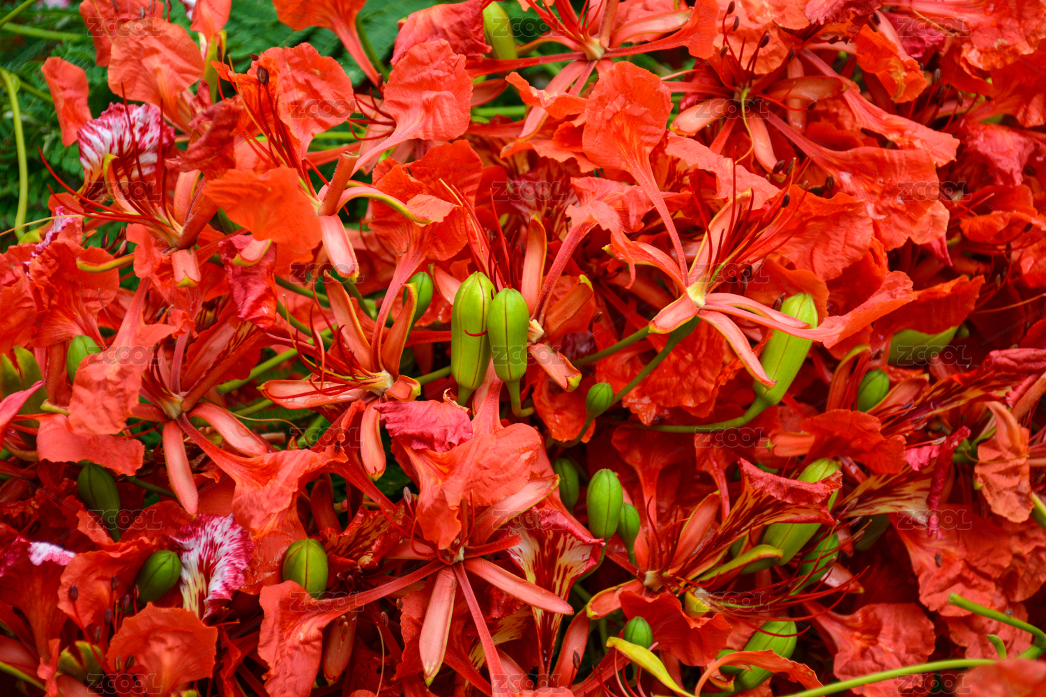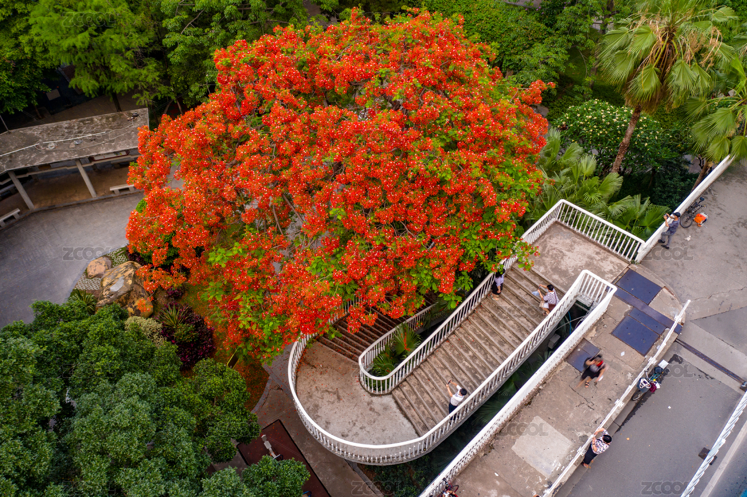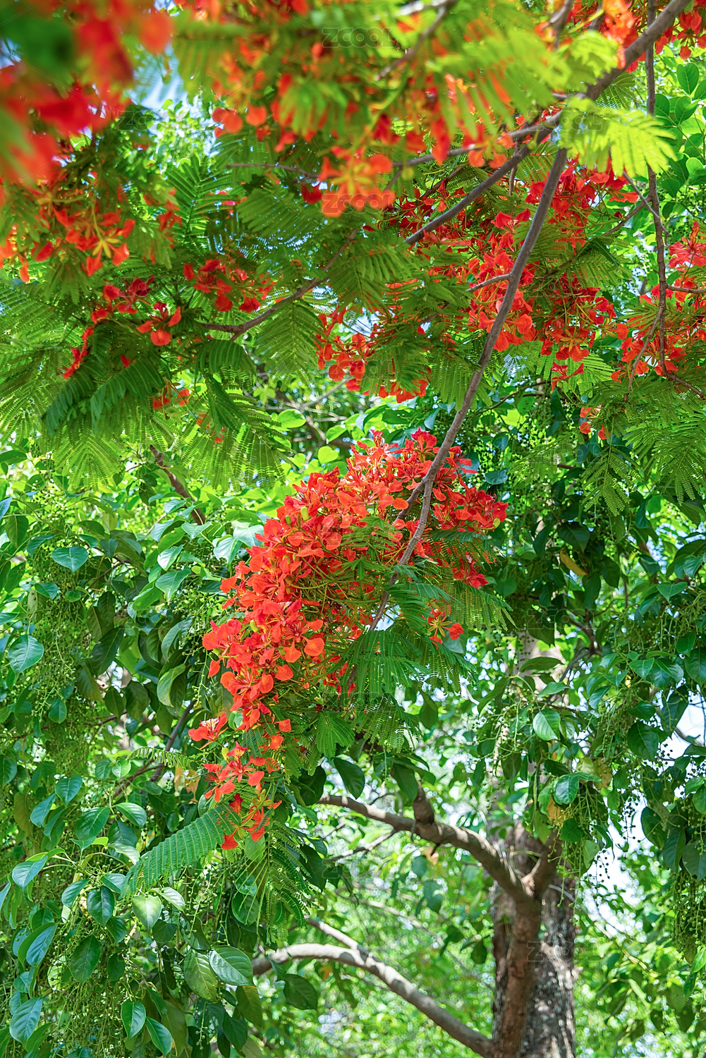 夏天盛開的紅艷艷的鳳凰花和綠葉背景