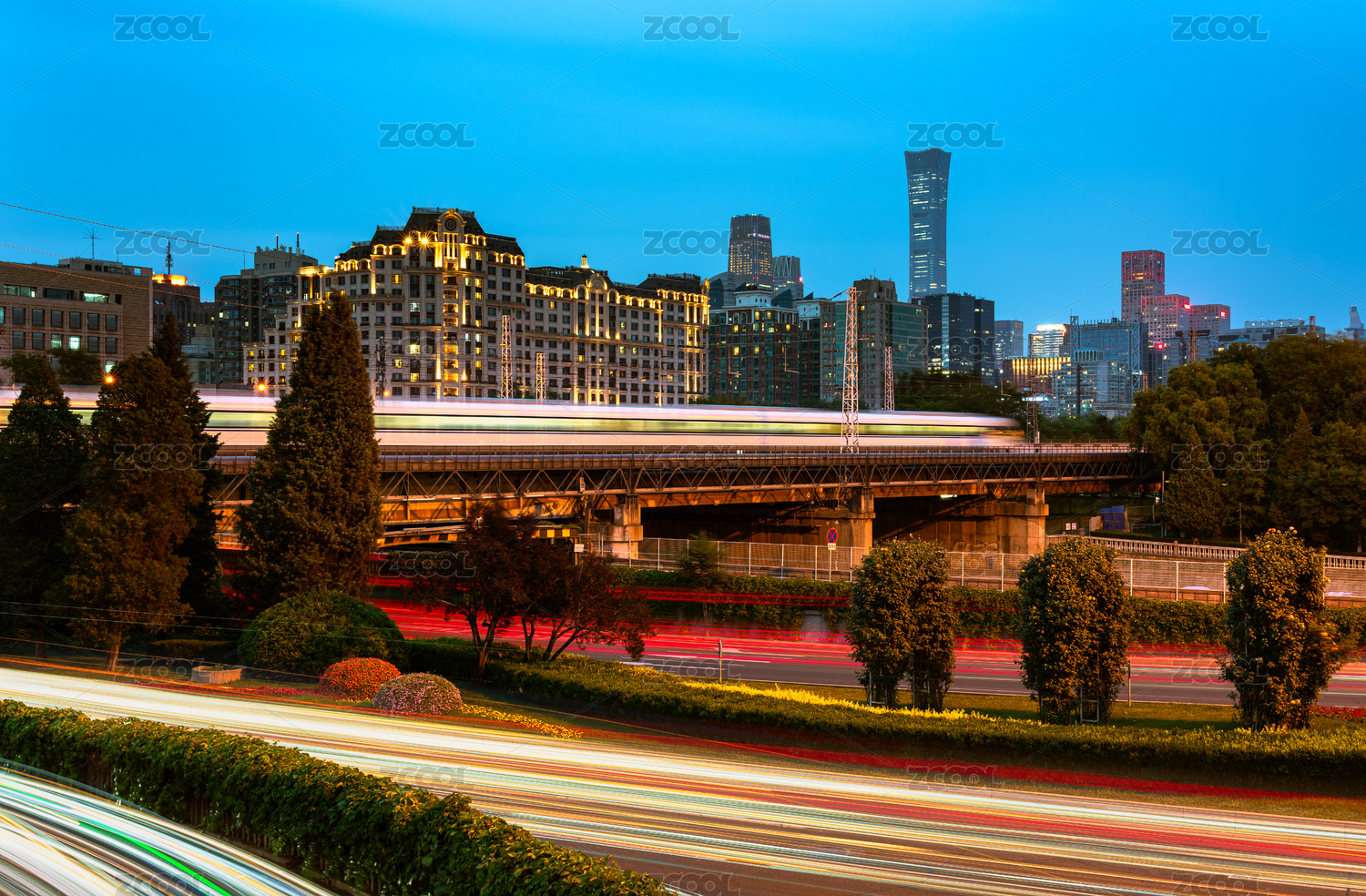 中國北京市區(qū)東便門橋穿過城市的鐵路列車夜景
