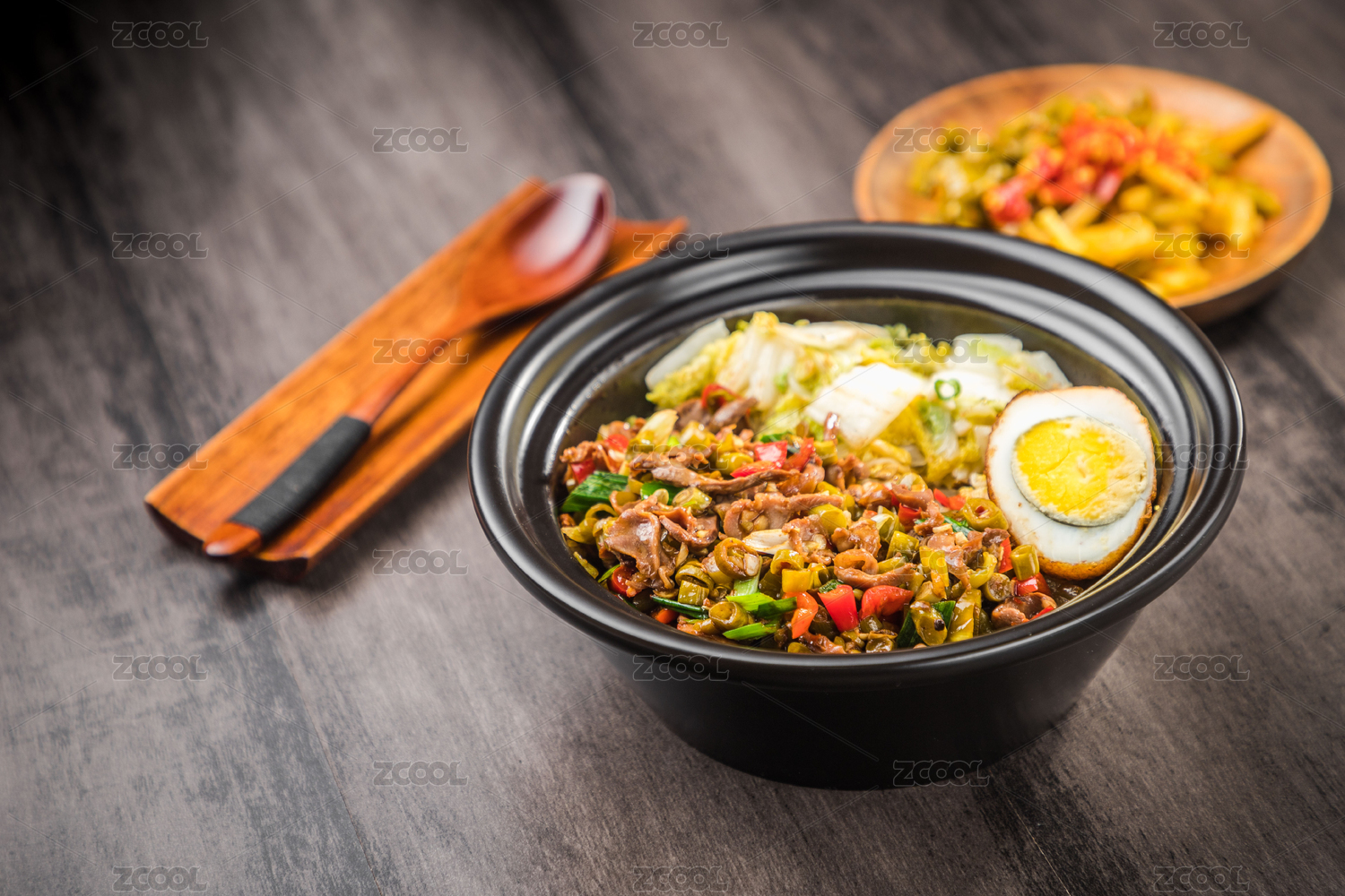 暗色木紋卓上放著一碗肉沫炒酸豆角煲仔飯
