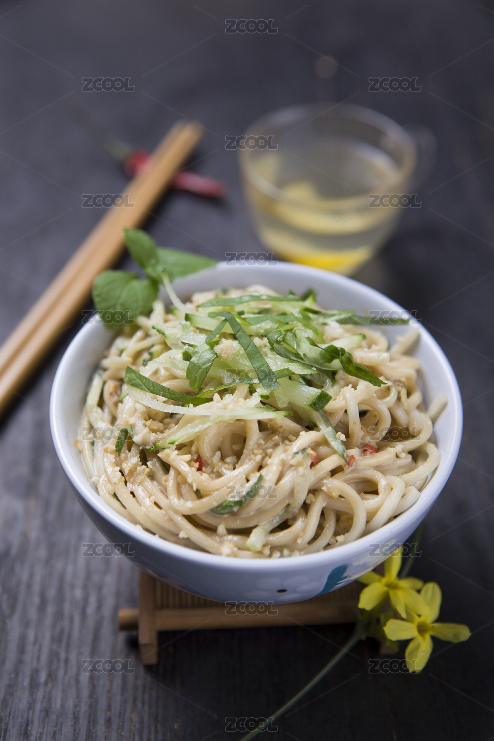 放在竹簾餐布上的一碗山東傳統(tǒng)家常拌面 — 山東麻醬涼面