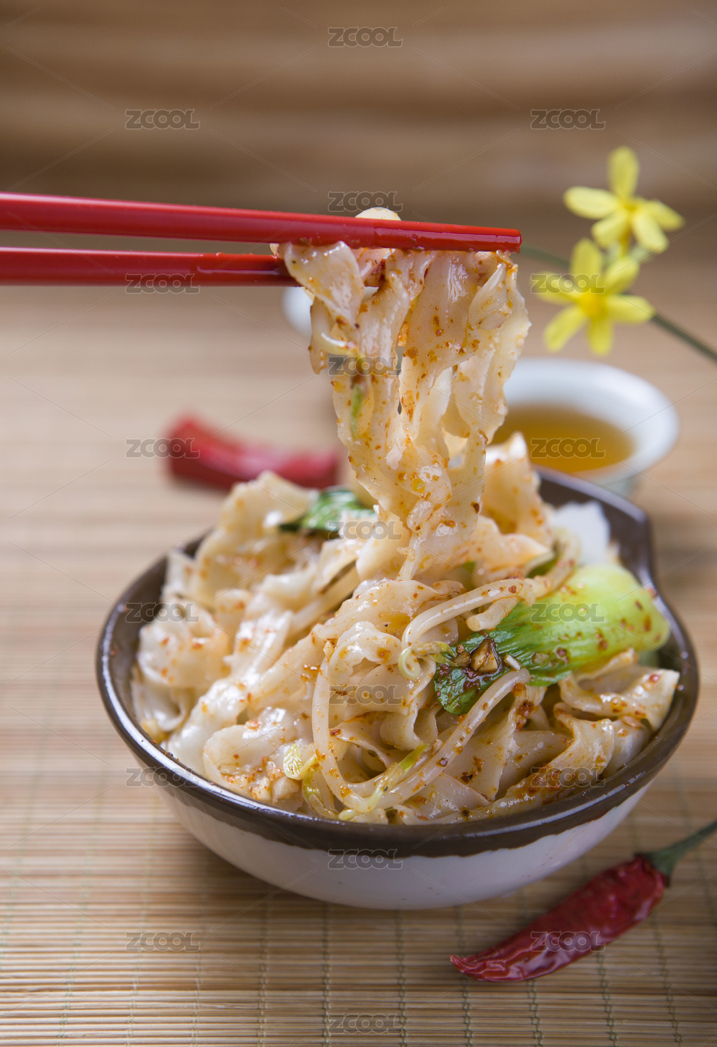 放在竹簾餐布上的一碗陜西傳統(tǒng)家常拌面— 陜西油潑面