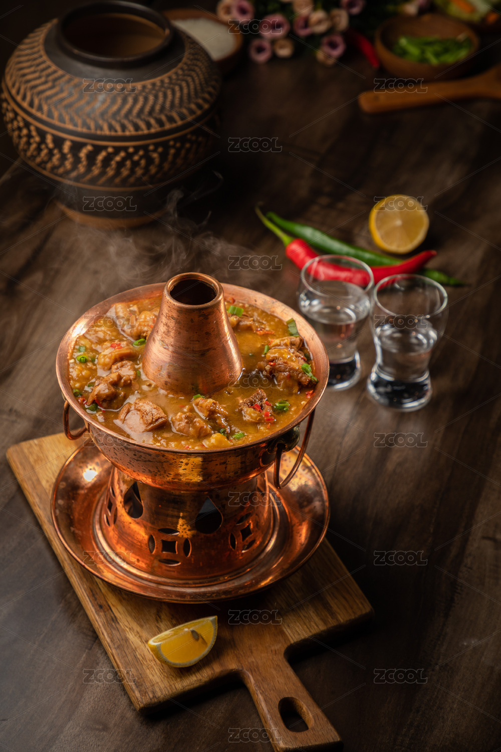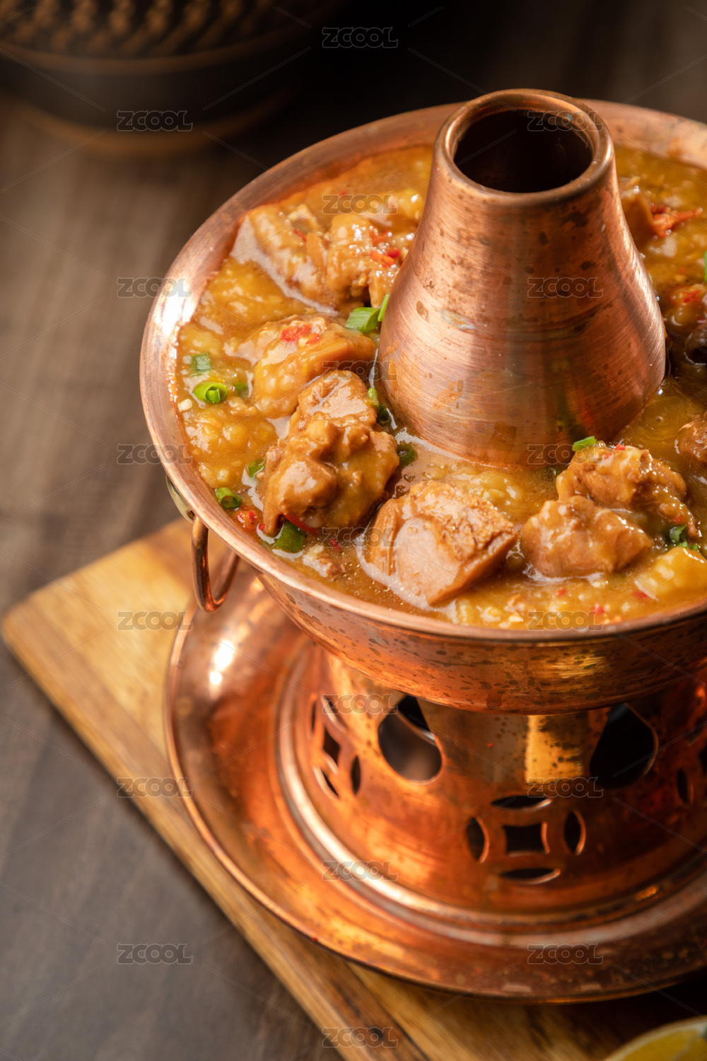 棕色桌面上放著一副火鍋雞塊燉土豆