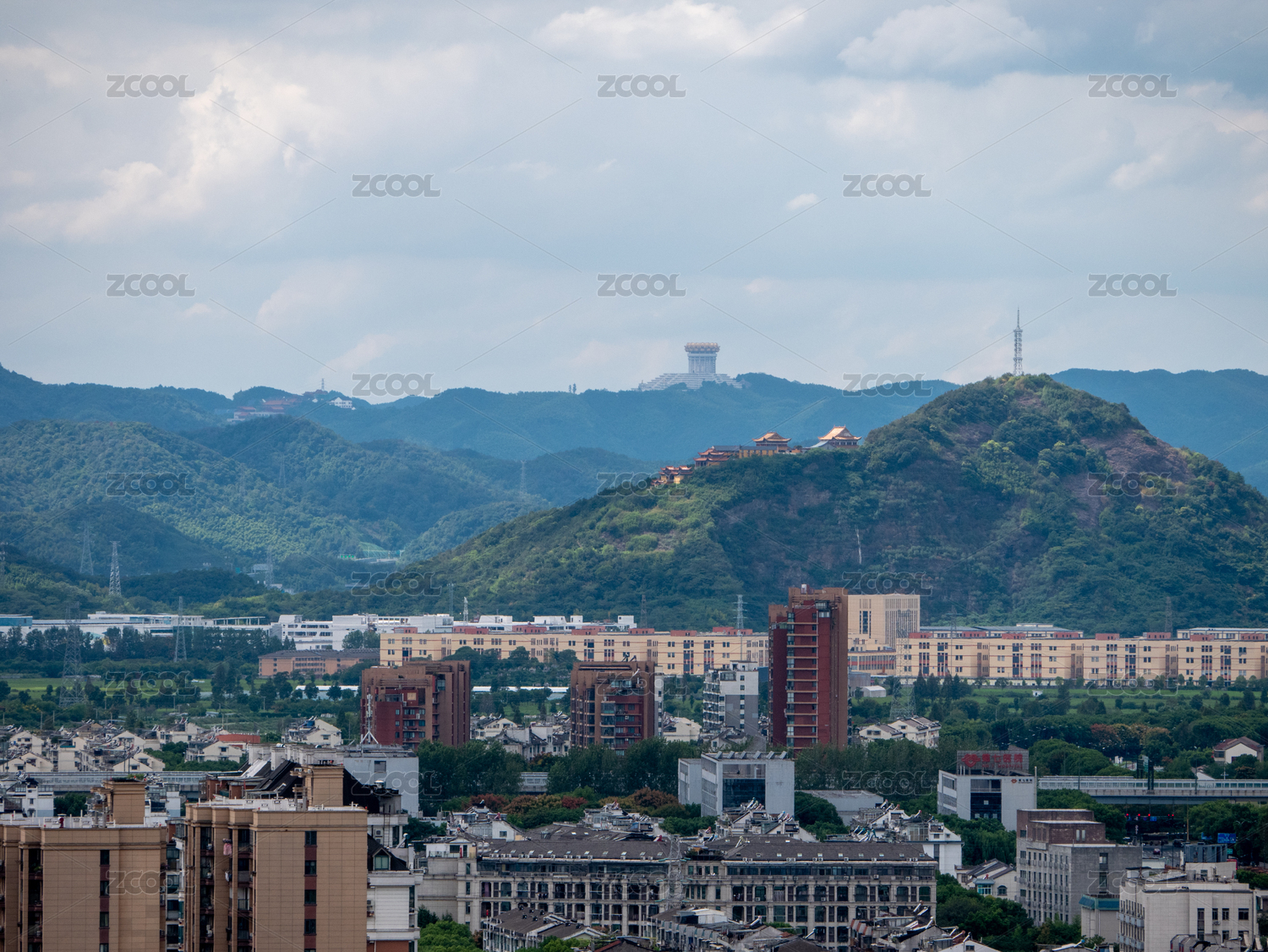 紹興越城區(qū)城市風光和會稽山上的兜率天宮