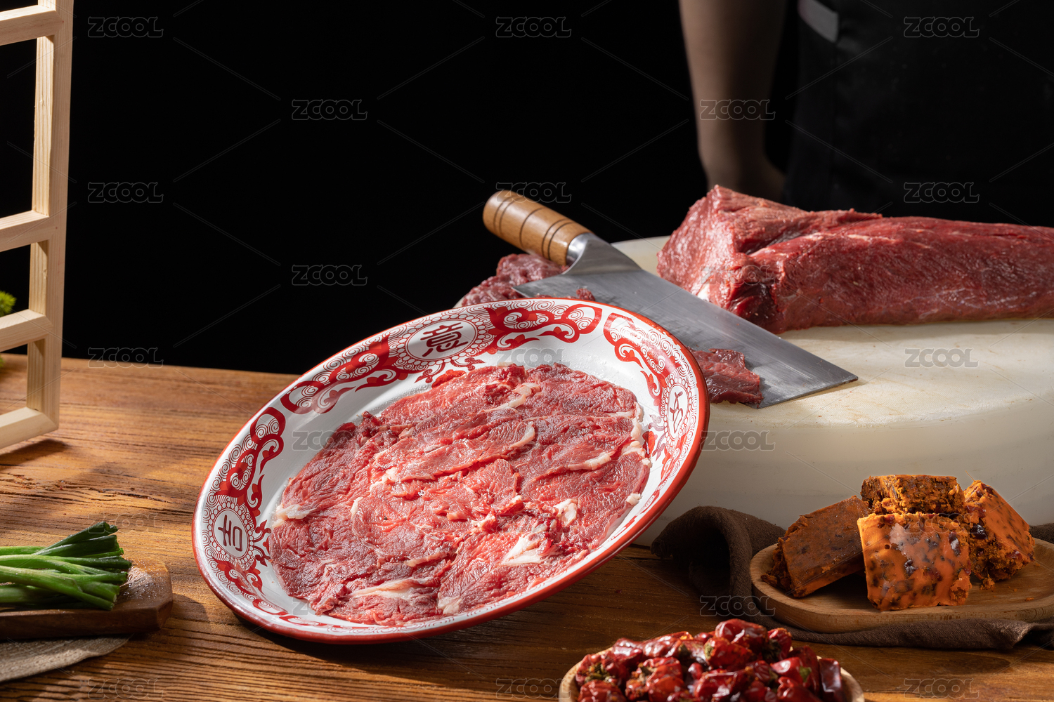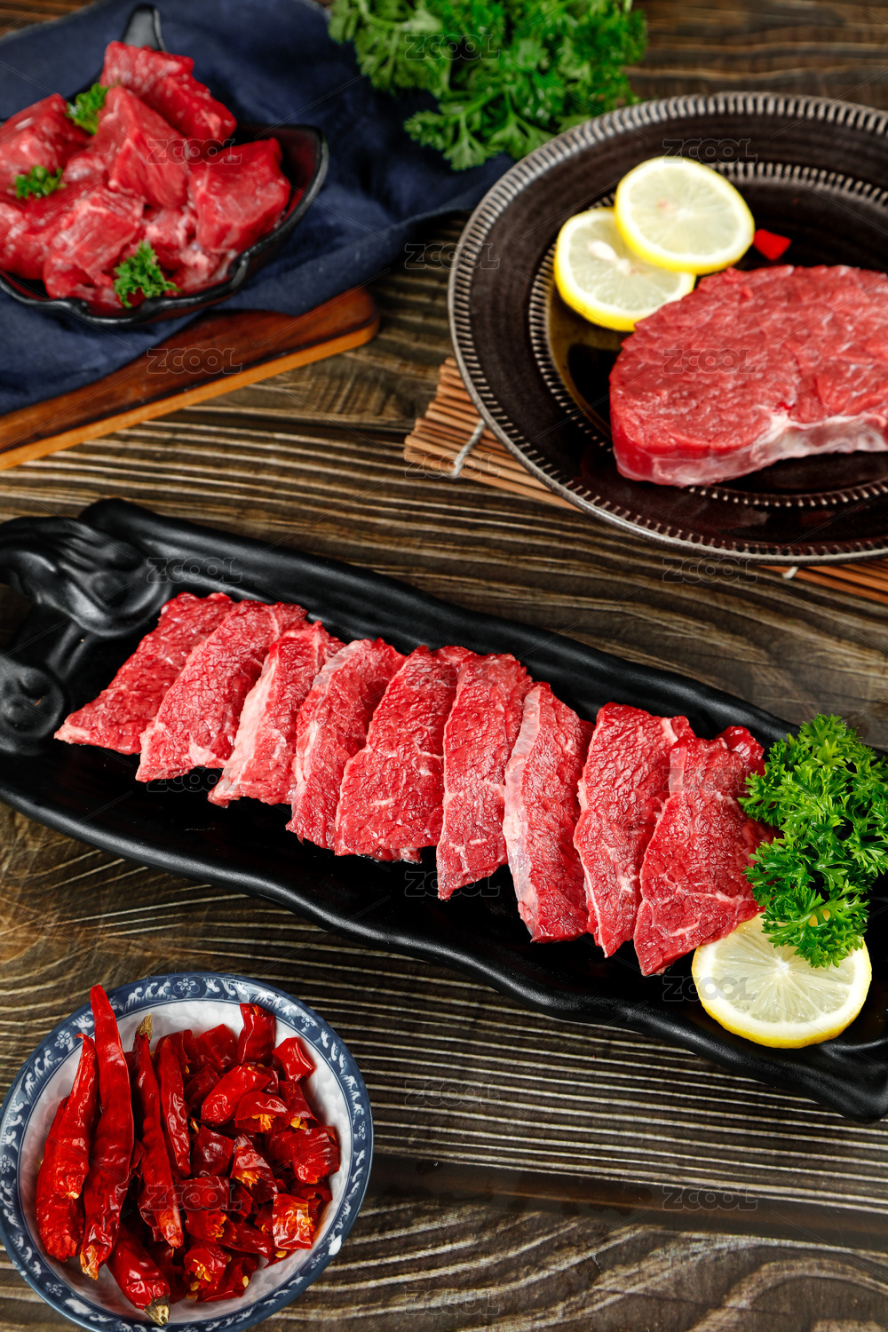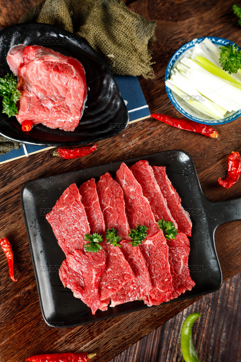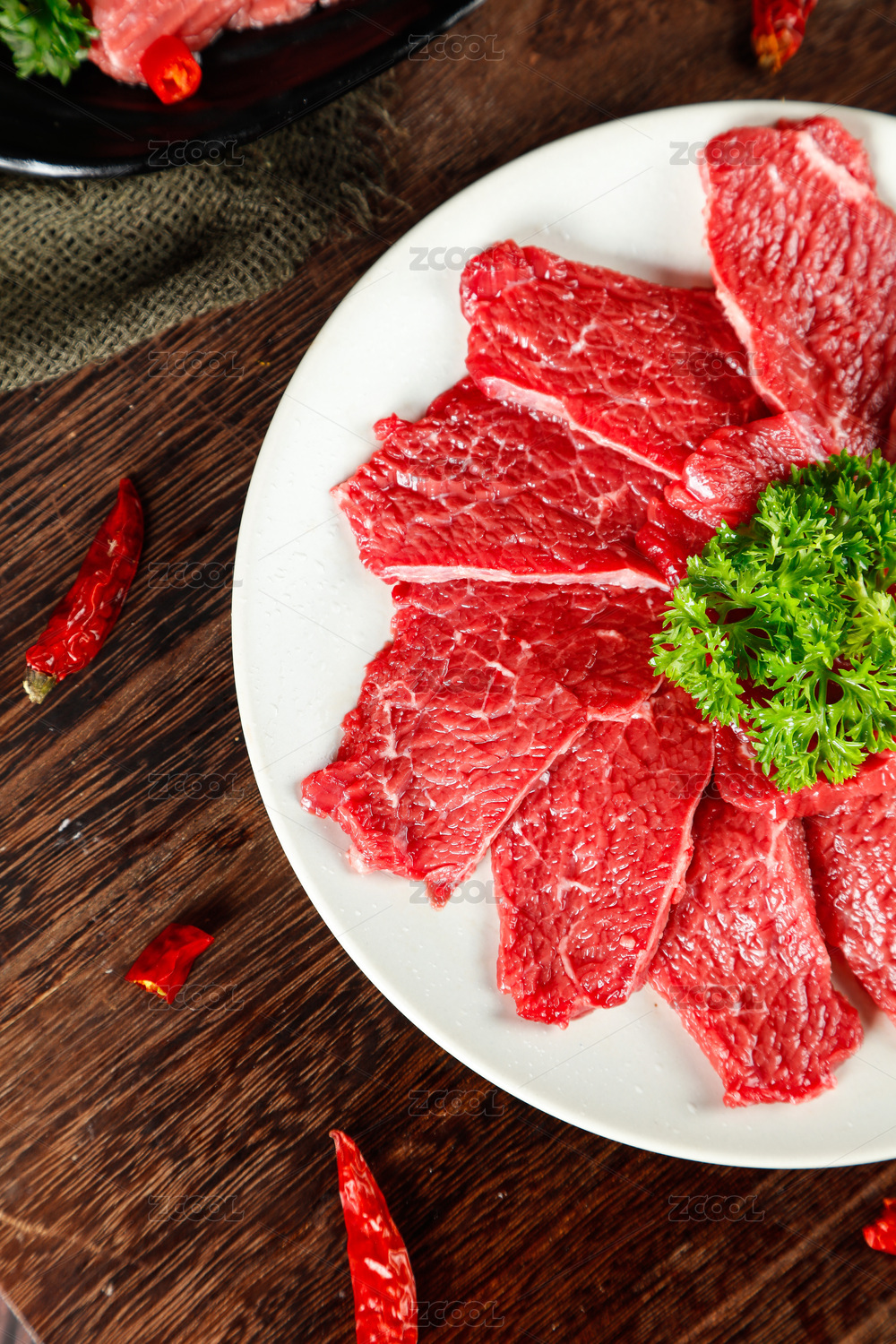 深底上放著一盤切片的生鮮牛肉