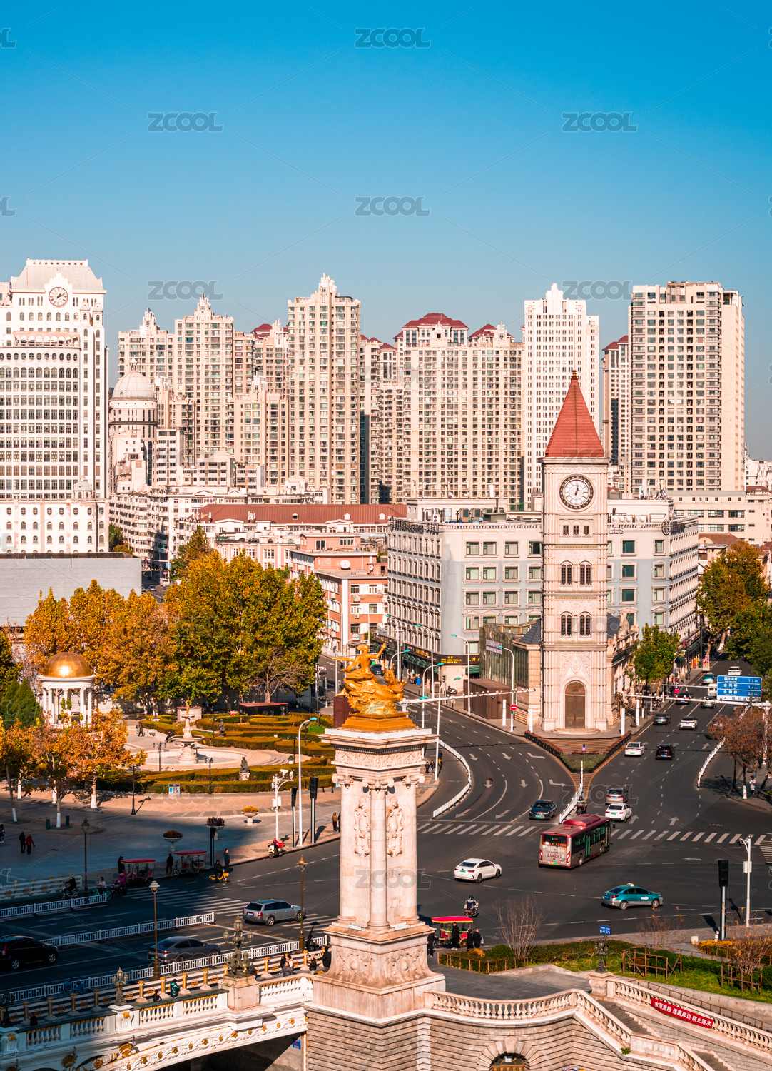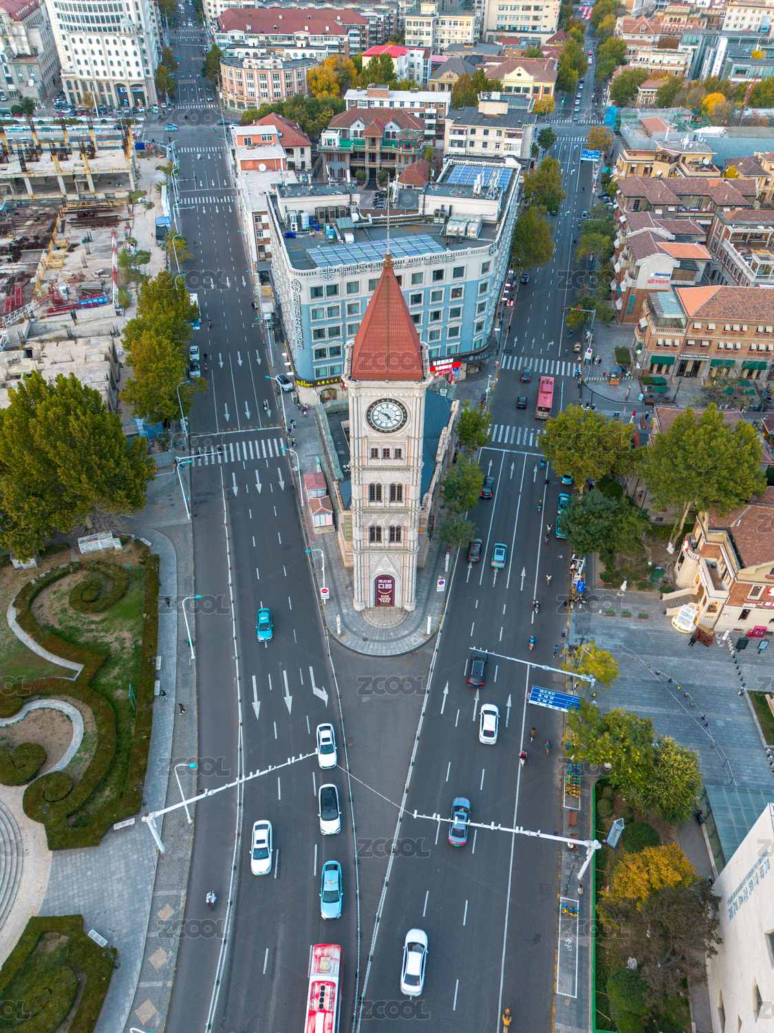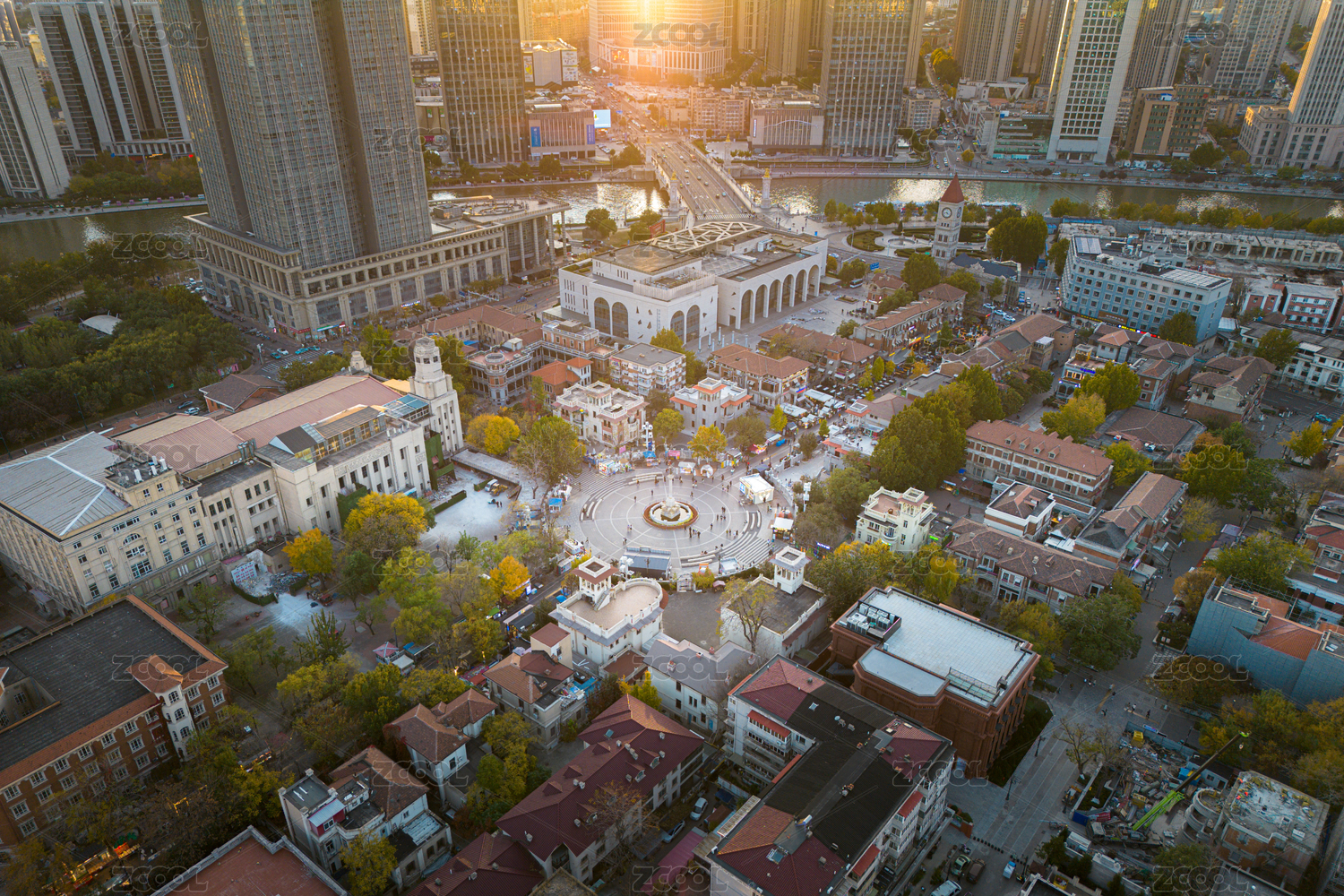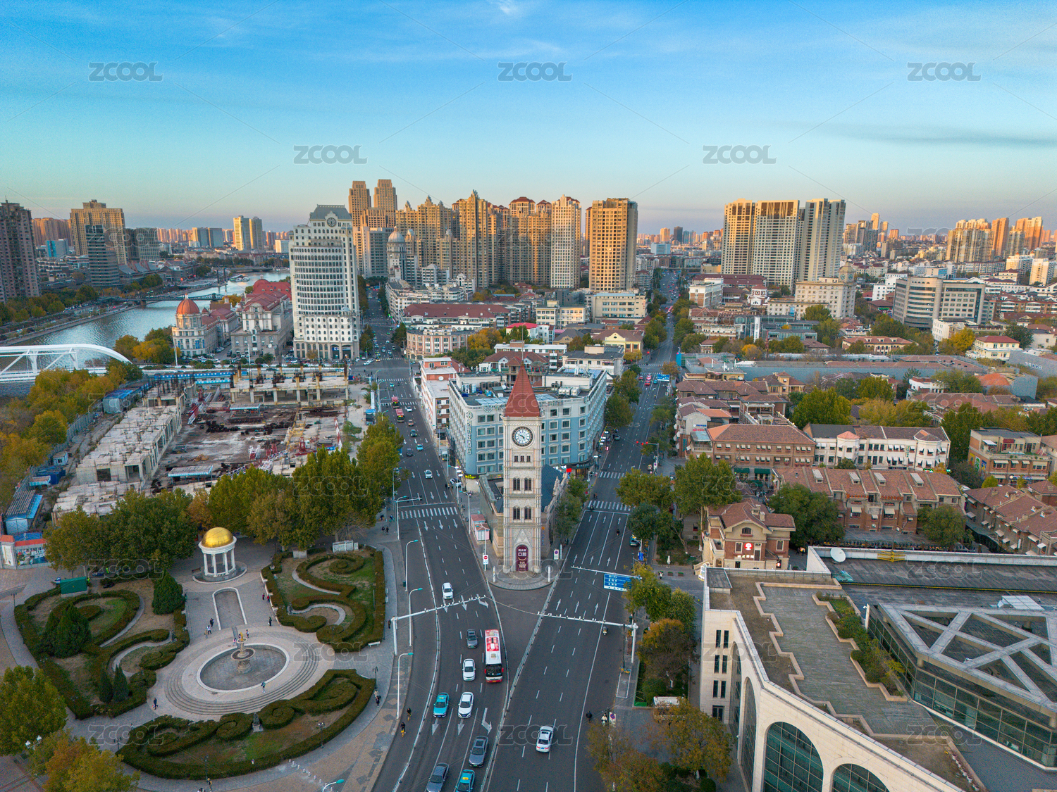 中國(guó)天津北安橋意式風(fēng)情區(qū)鐘樓公園秋天航拍