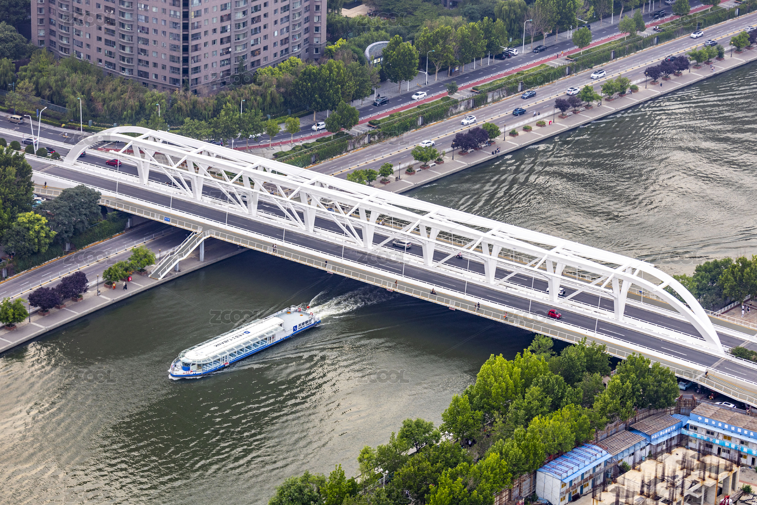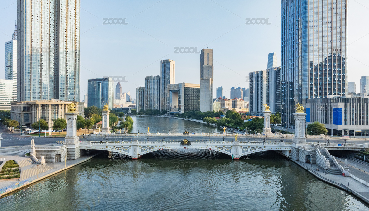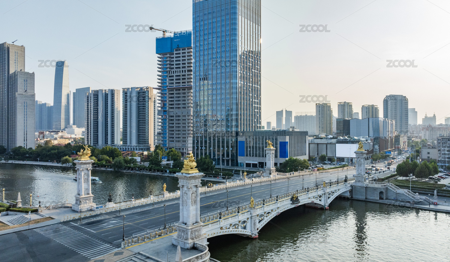 中國(guó)天津海河北安橋和進(jìn)步橋上空的城市風(fēng)光
