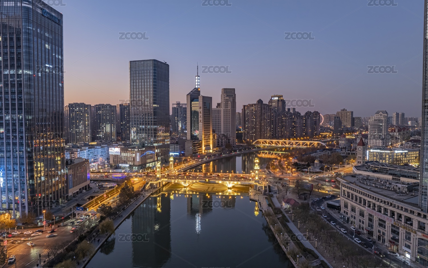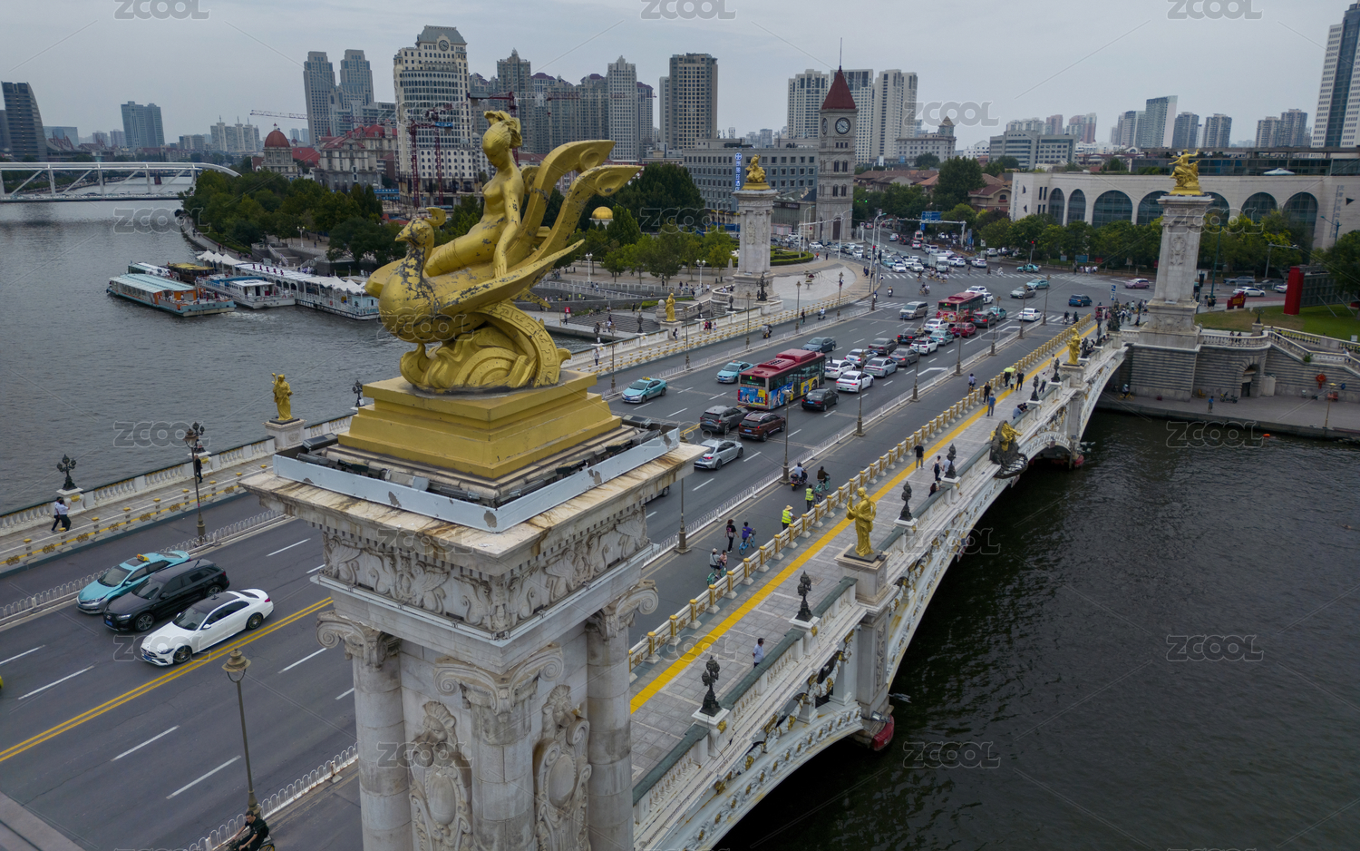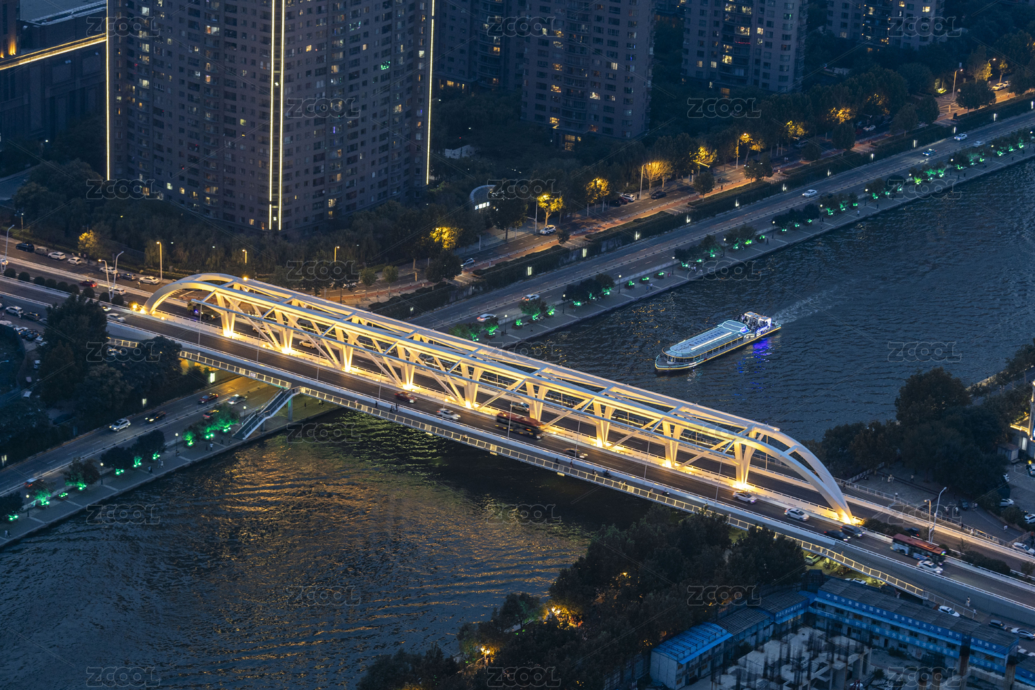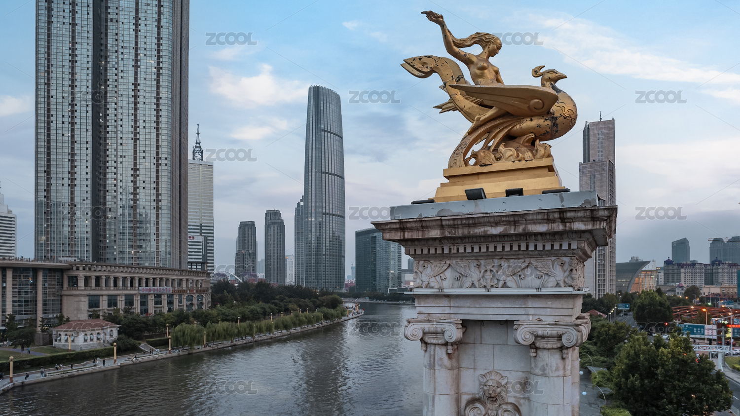 中國(guó)天津海河北安橋和進(jìn)步橋上空的城市風(fēng)光