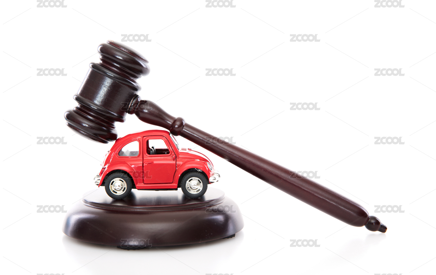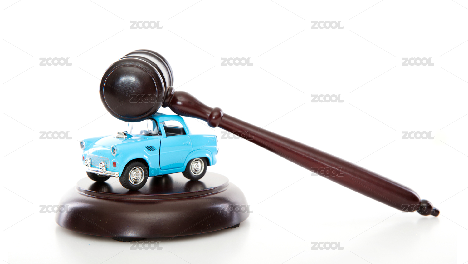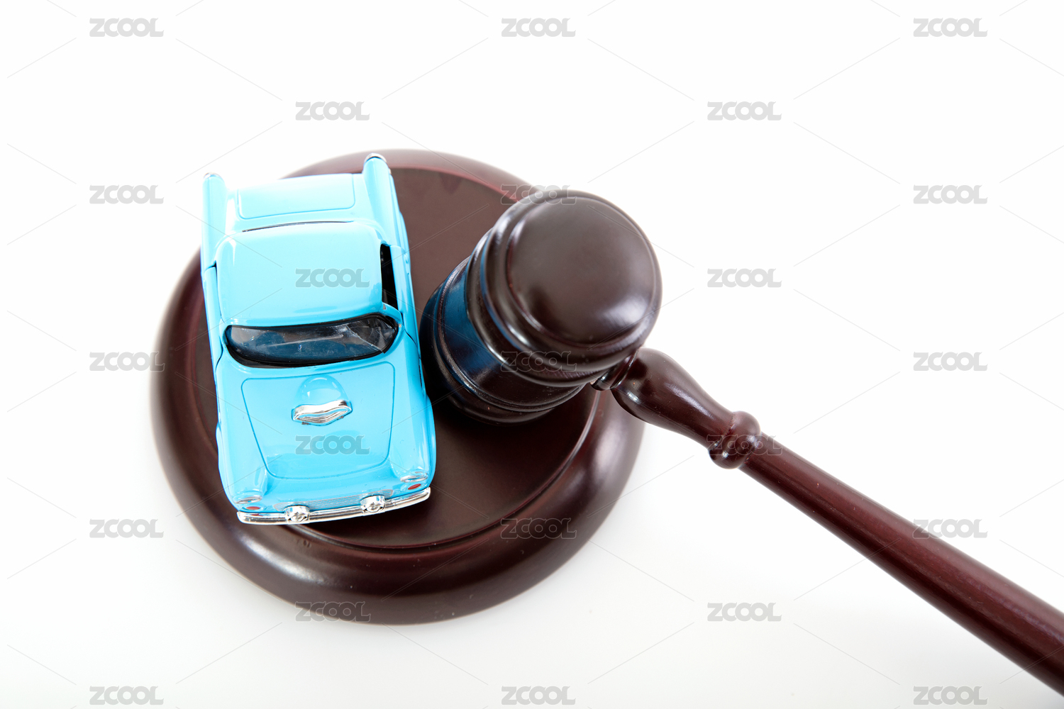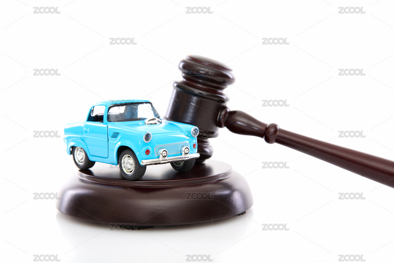 白背景上的法院法錘和小汽車模型