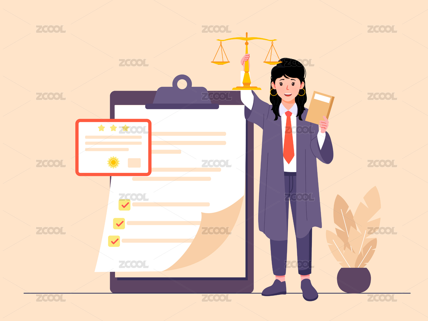 一個女律師手拿天平背后是審判書扁平插畫