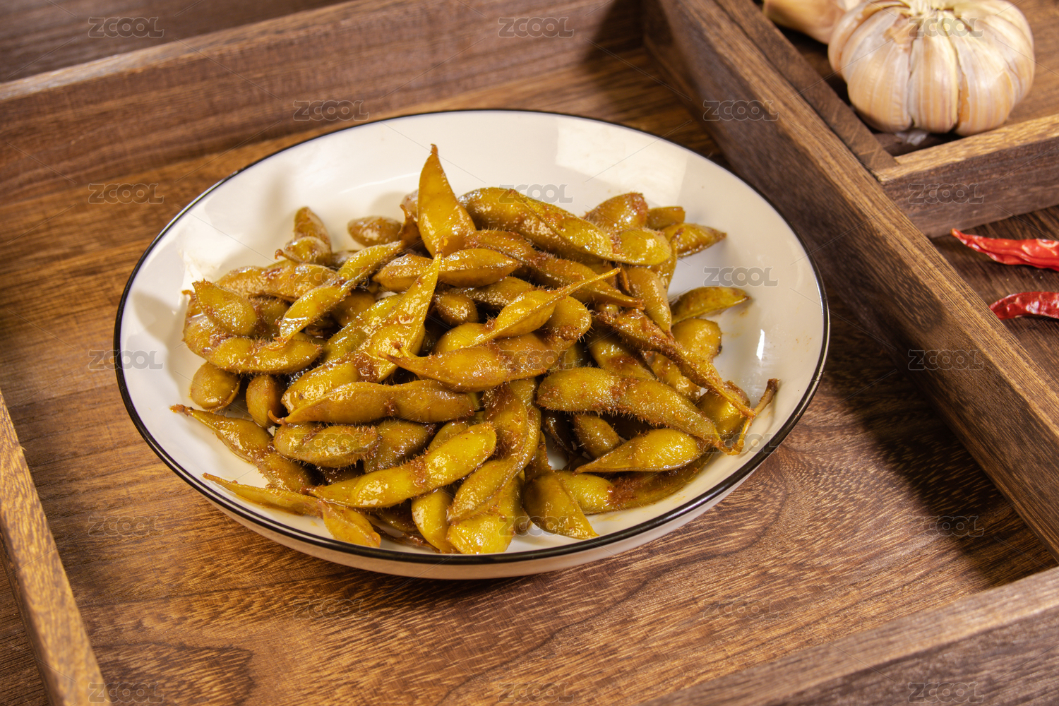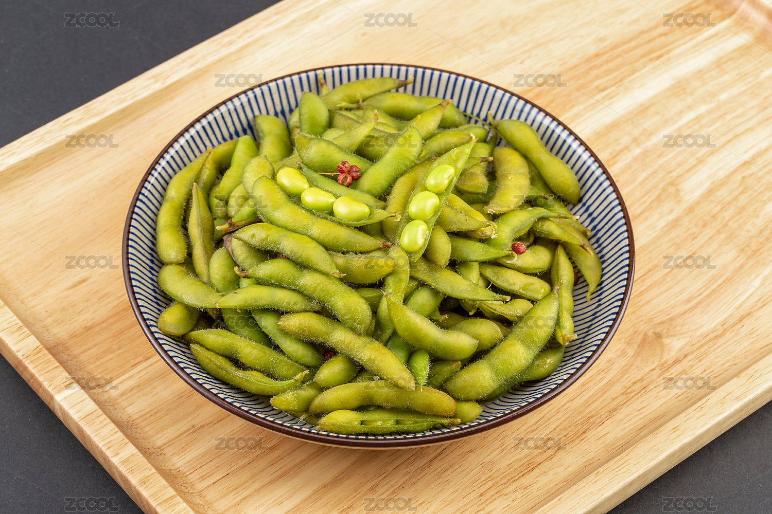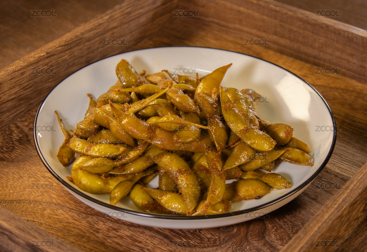 托盤上的一盤小菜水煮毛豆