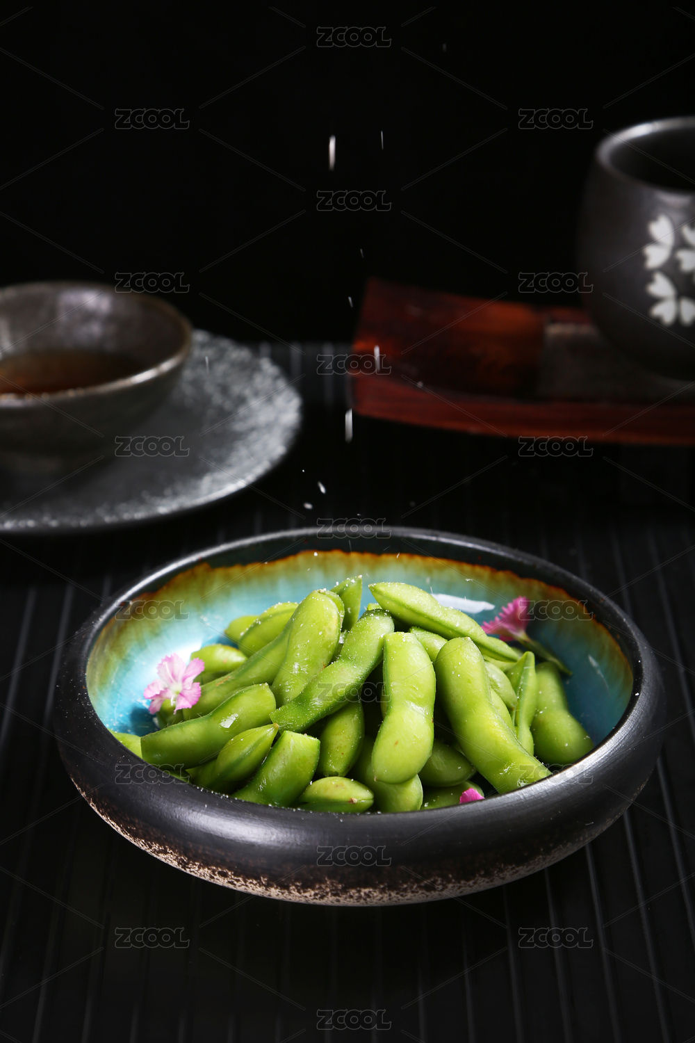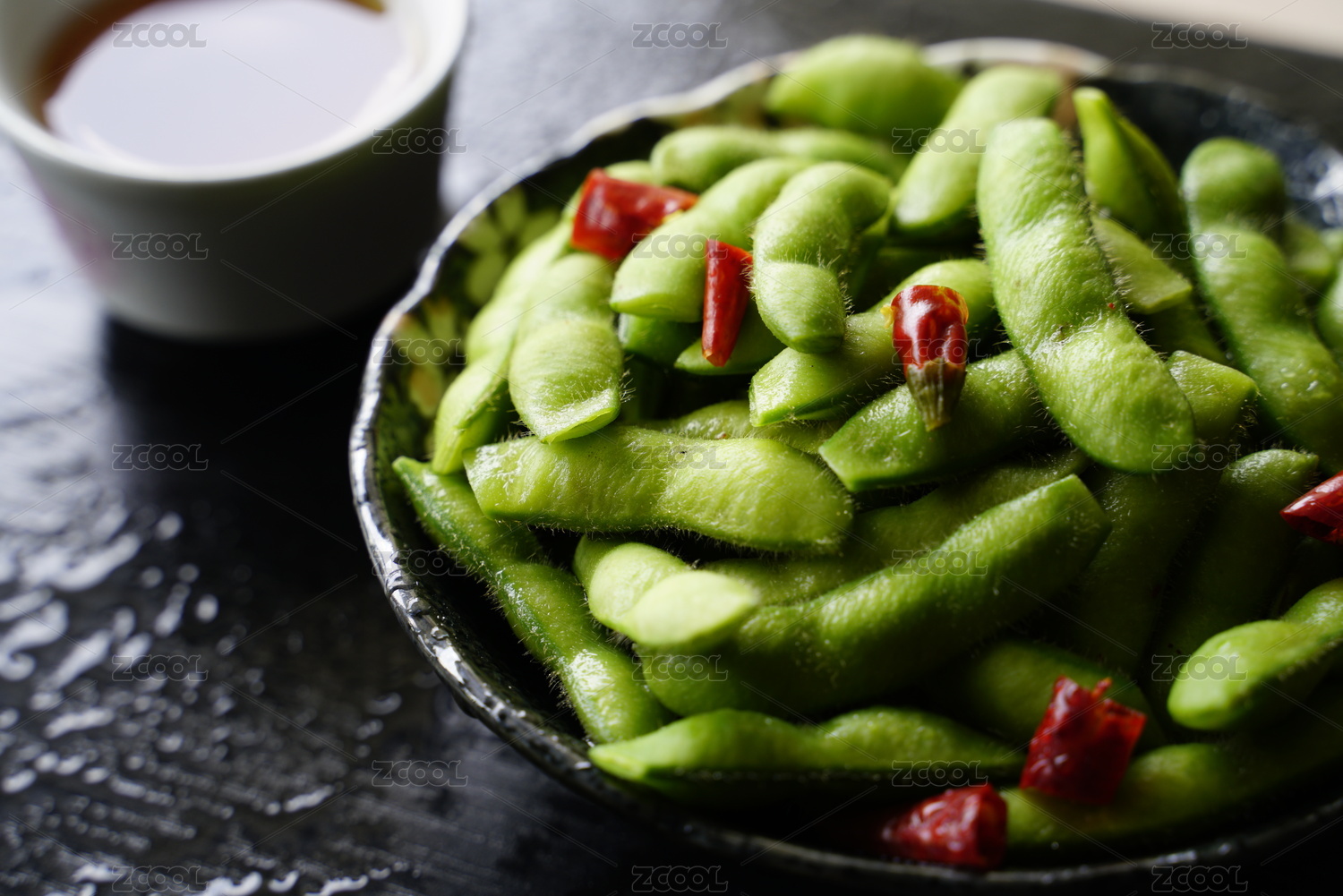 黑色小盤里的小菜水煮毛豆