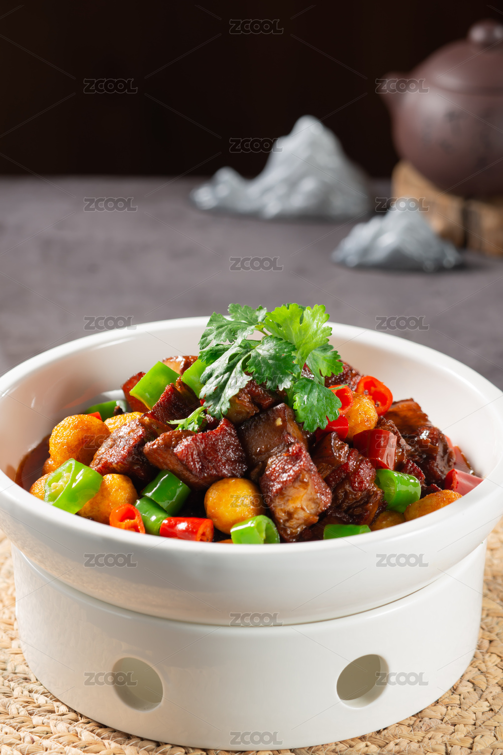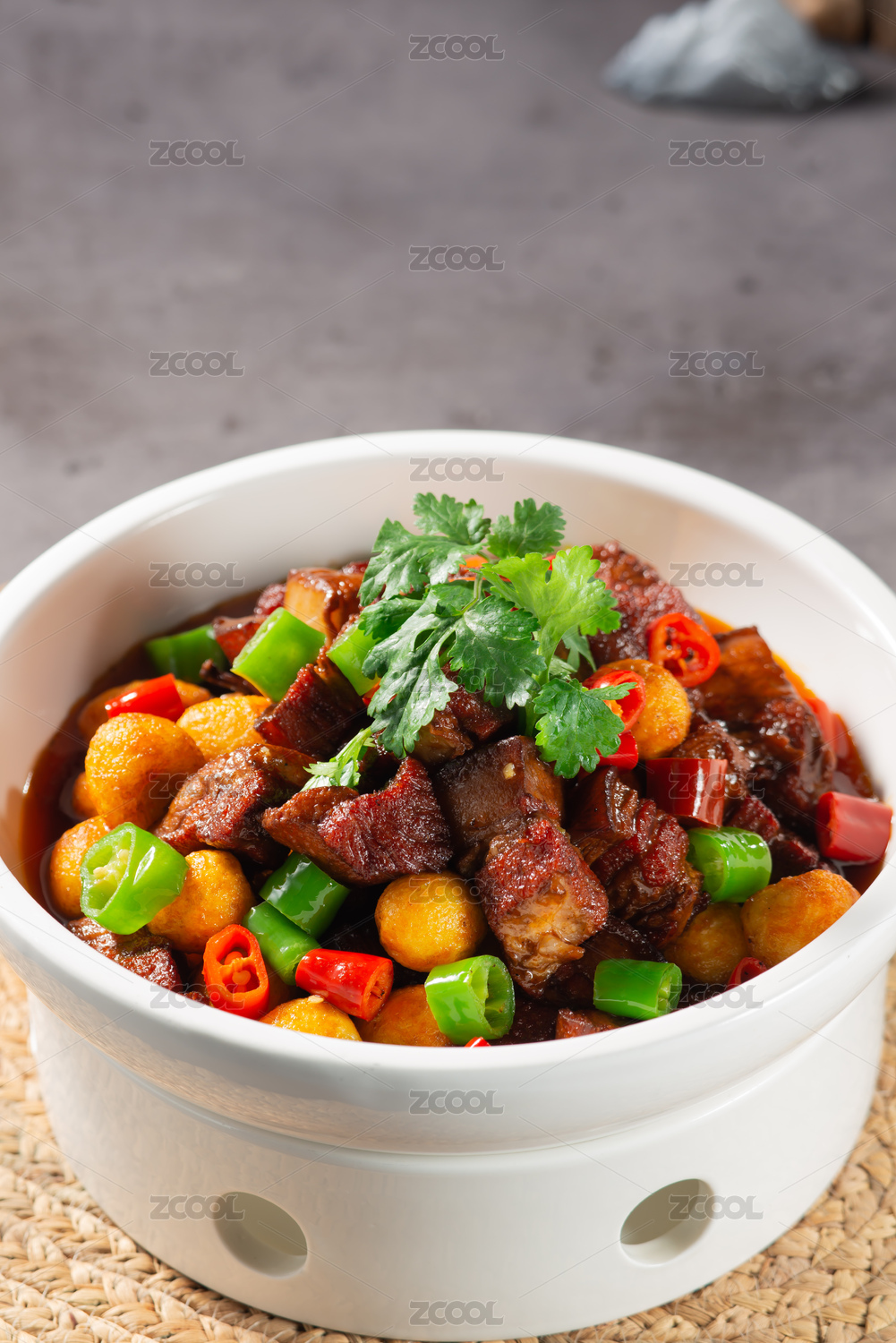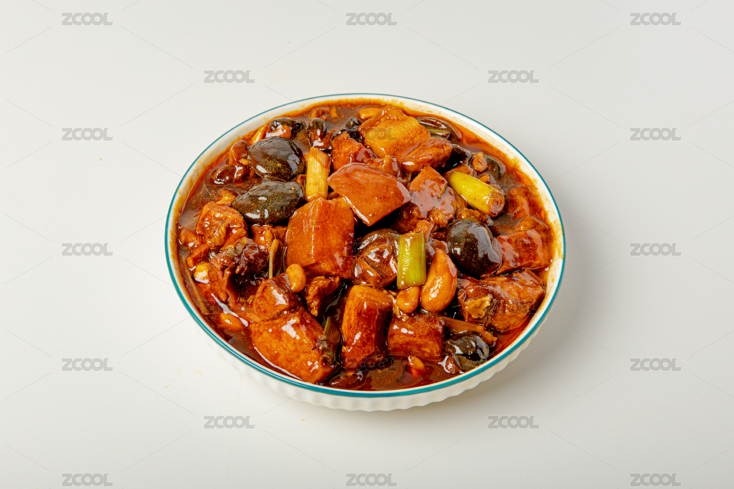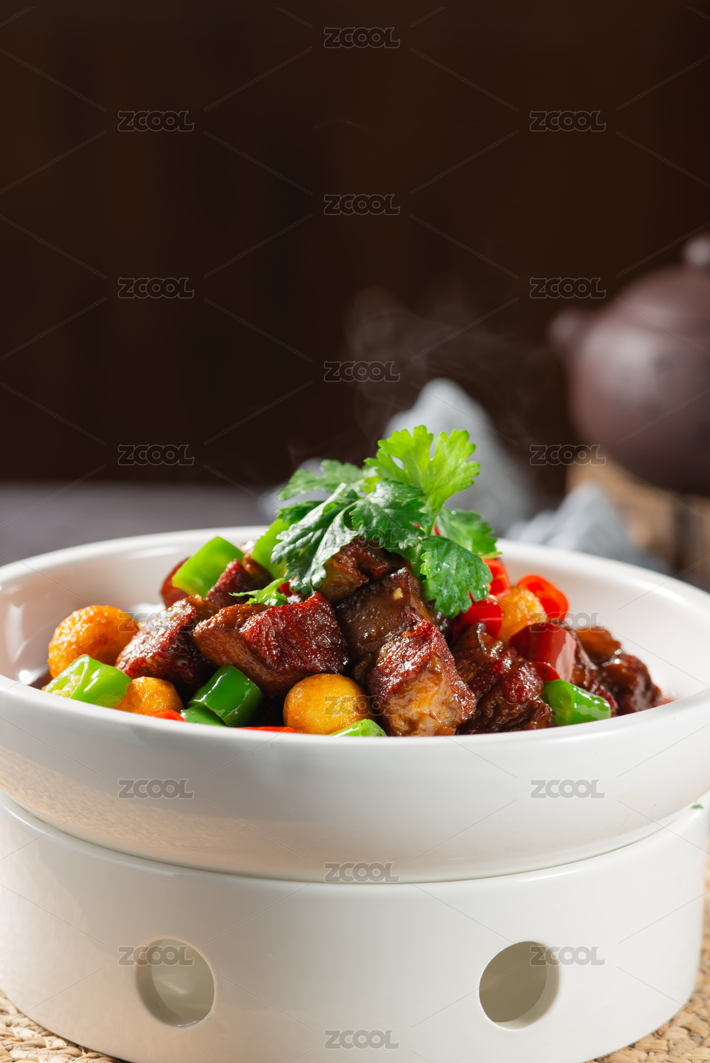 木紋背景上碗里的紅燒肉五花肉