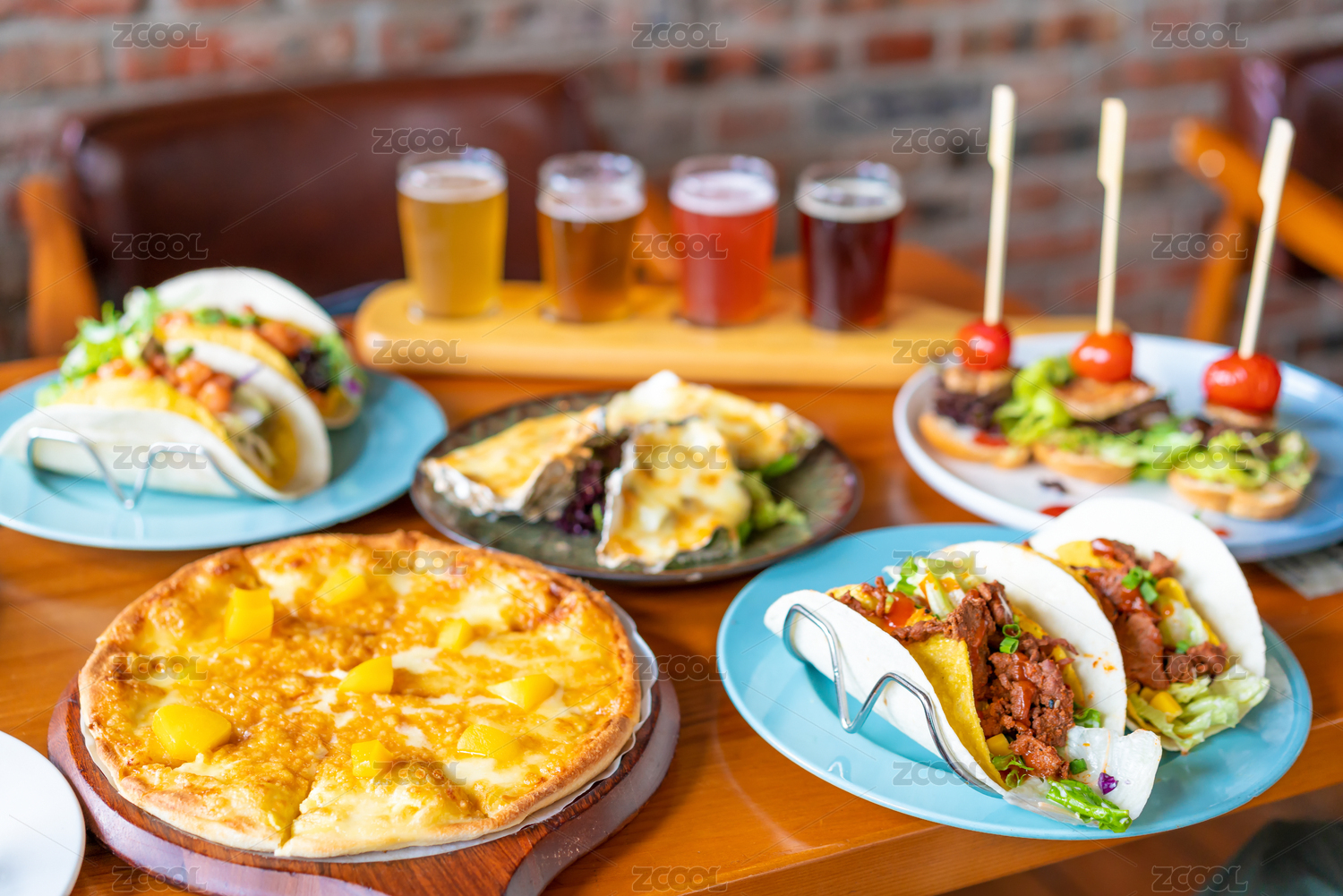 酒吧里一桌西餐小吃,啤酒、榴蓮黃桃披薩、黑松露芝士焗生蠔、烤鵝肝牛肉、墨西哥牛肉玉米卷。墨西哥鮮蝦玉米卷