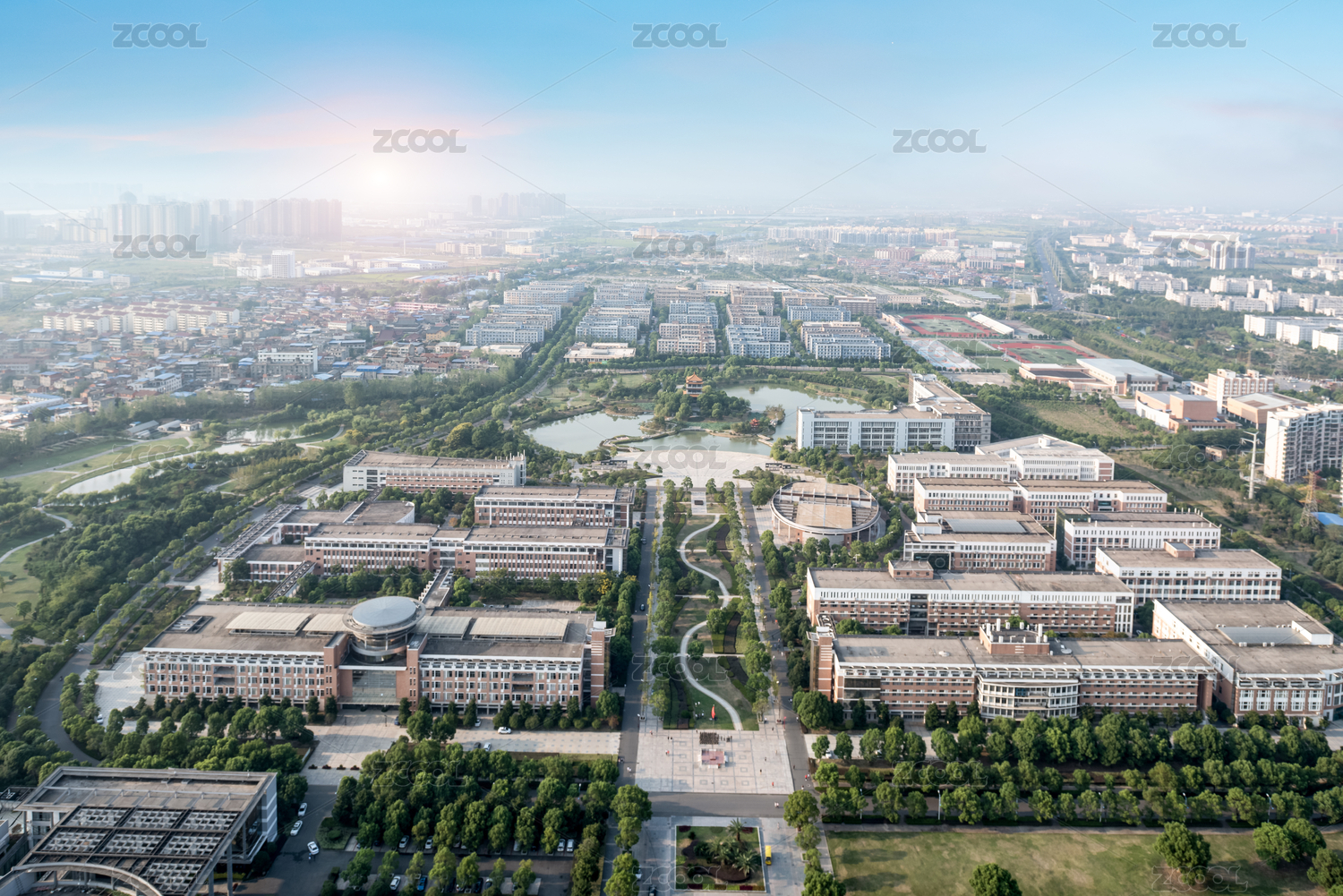 夕陽下的武漢天際線,空氣中彌漫著煙霧和塵埃,城市能見度低,大霧彌漫,武漢大霧彌漫,城市能見度低。