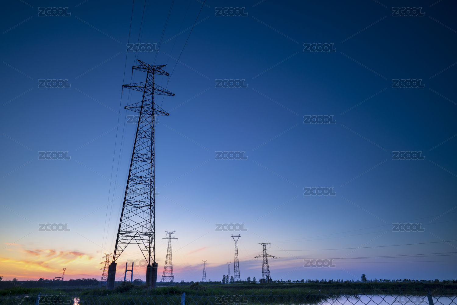 日落時高壓電力塔和美麗的自然景觀