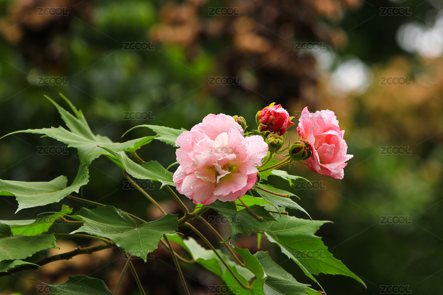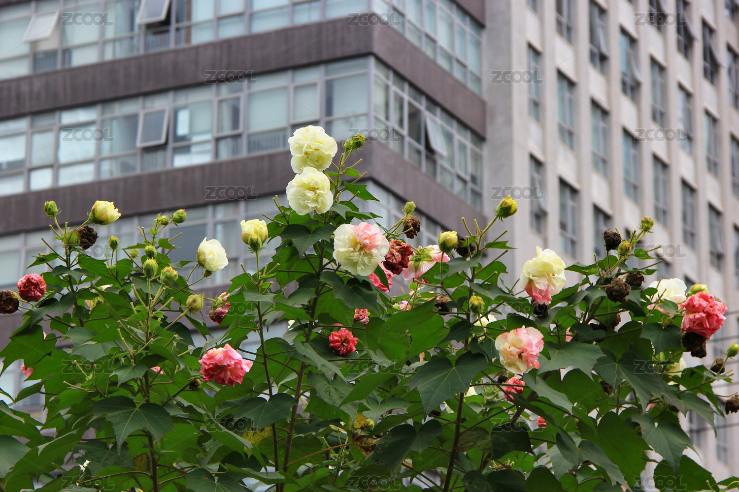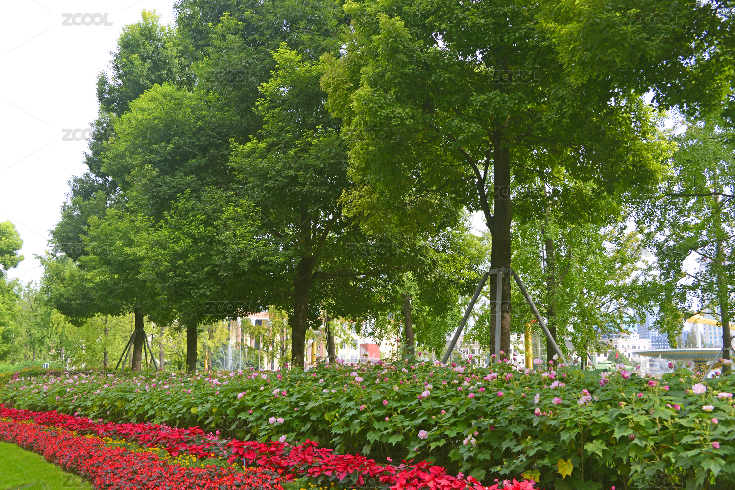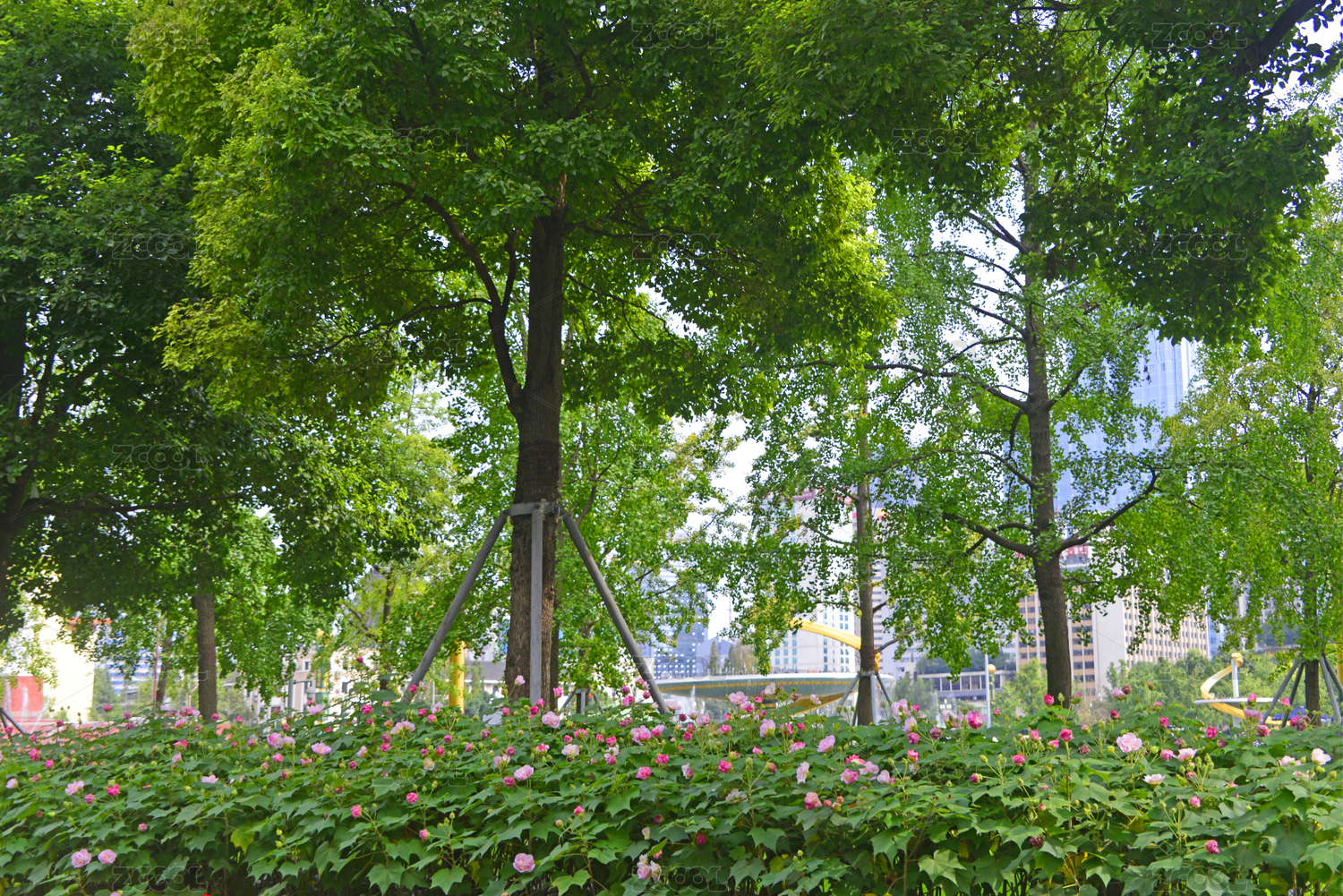 天府廣場園林盛開的成都市花芙蓉和行道樹
