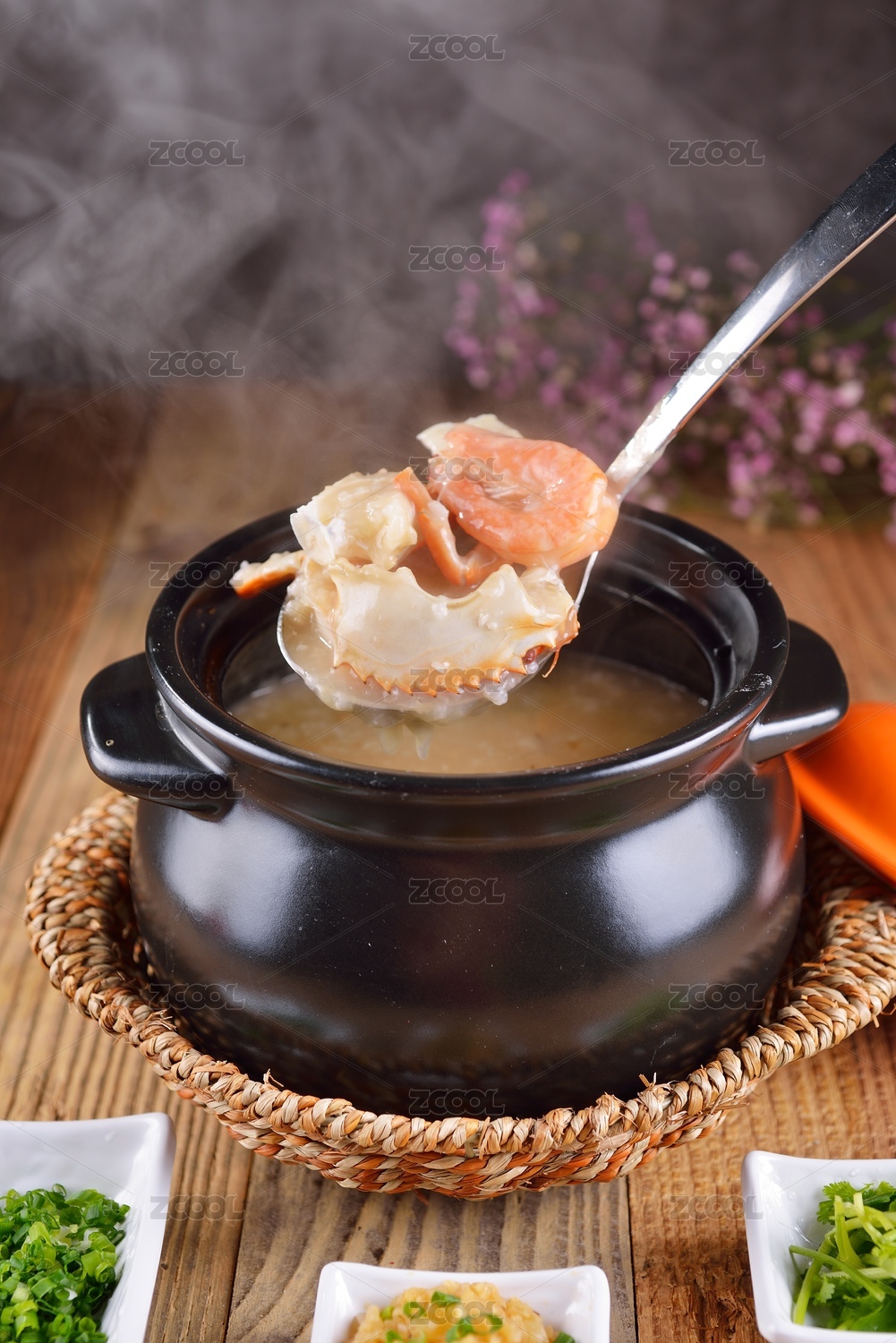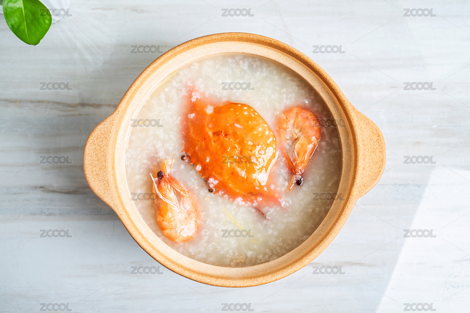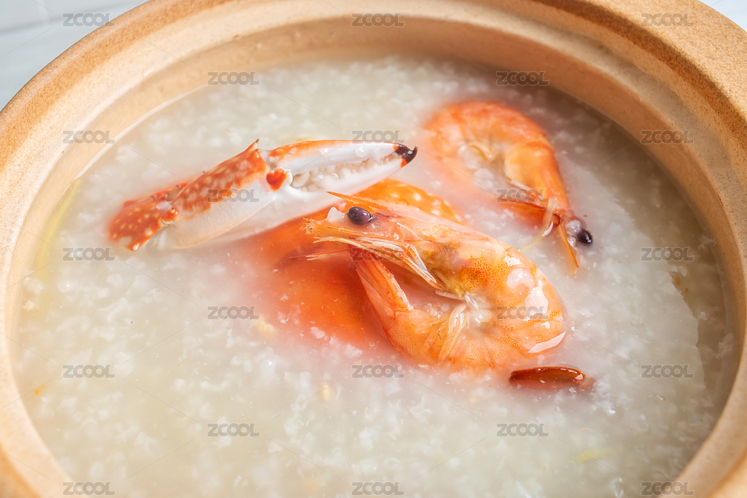 放在砂鍋里的鮮蝦蟹肉海鮮粥