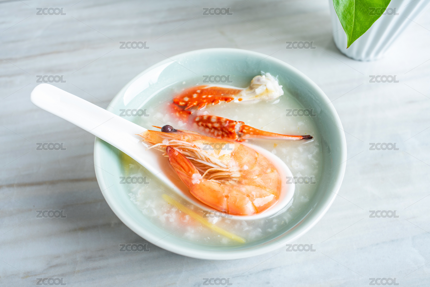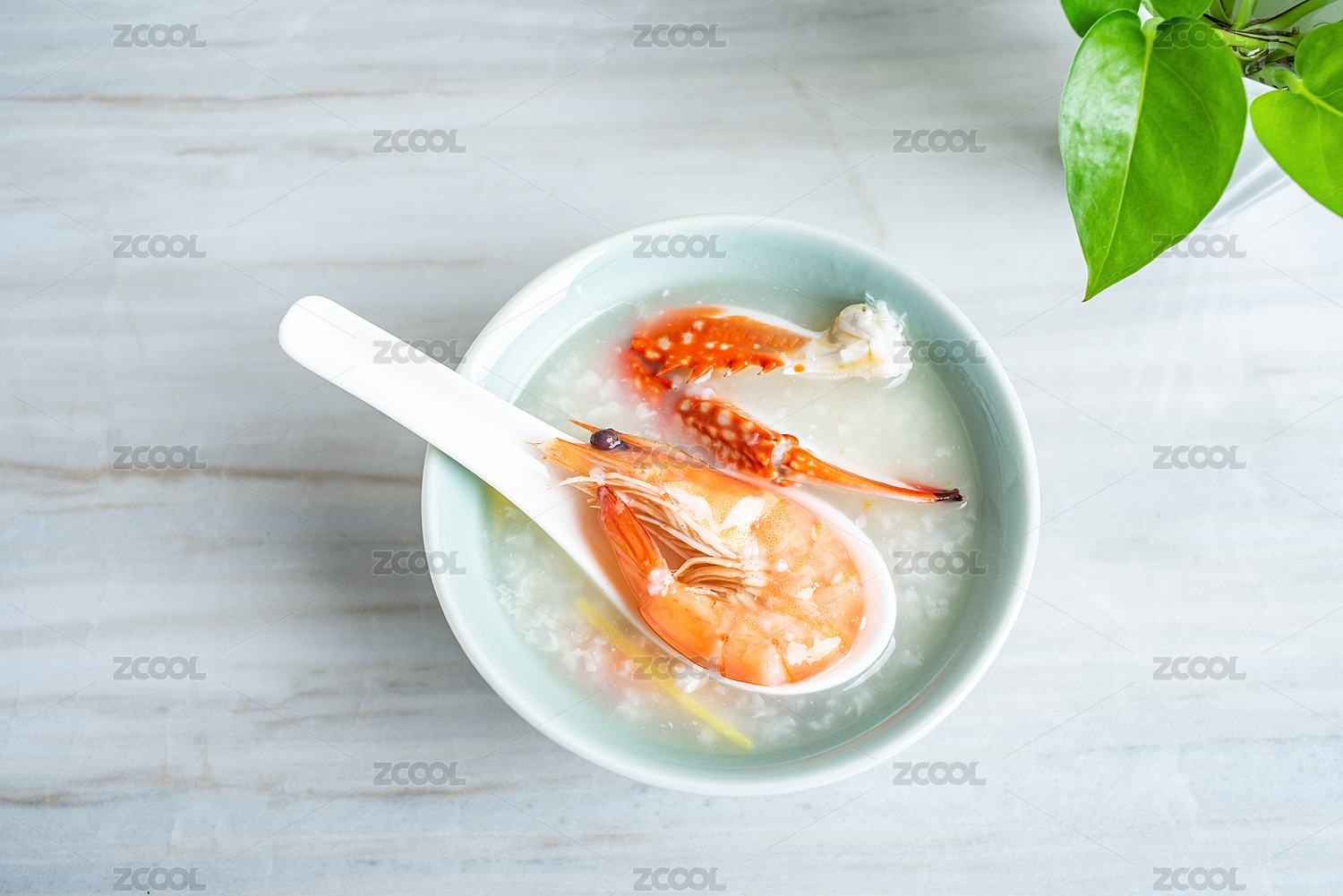 中國美味海鮮粥,廚房臺面上一碗蝦蟹粥
