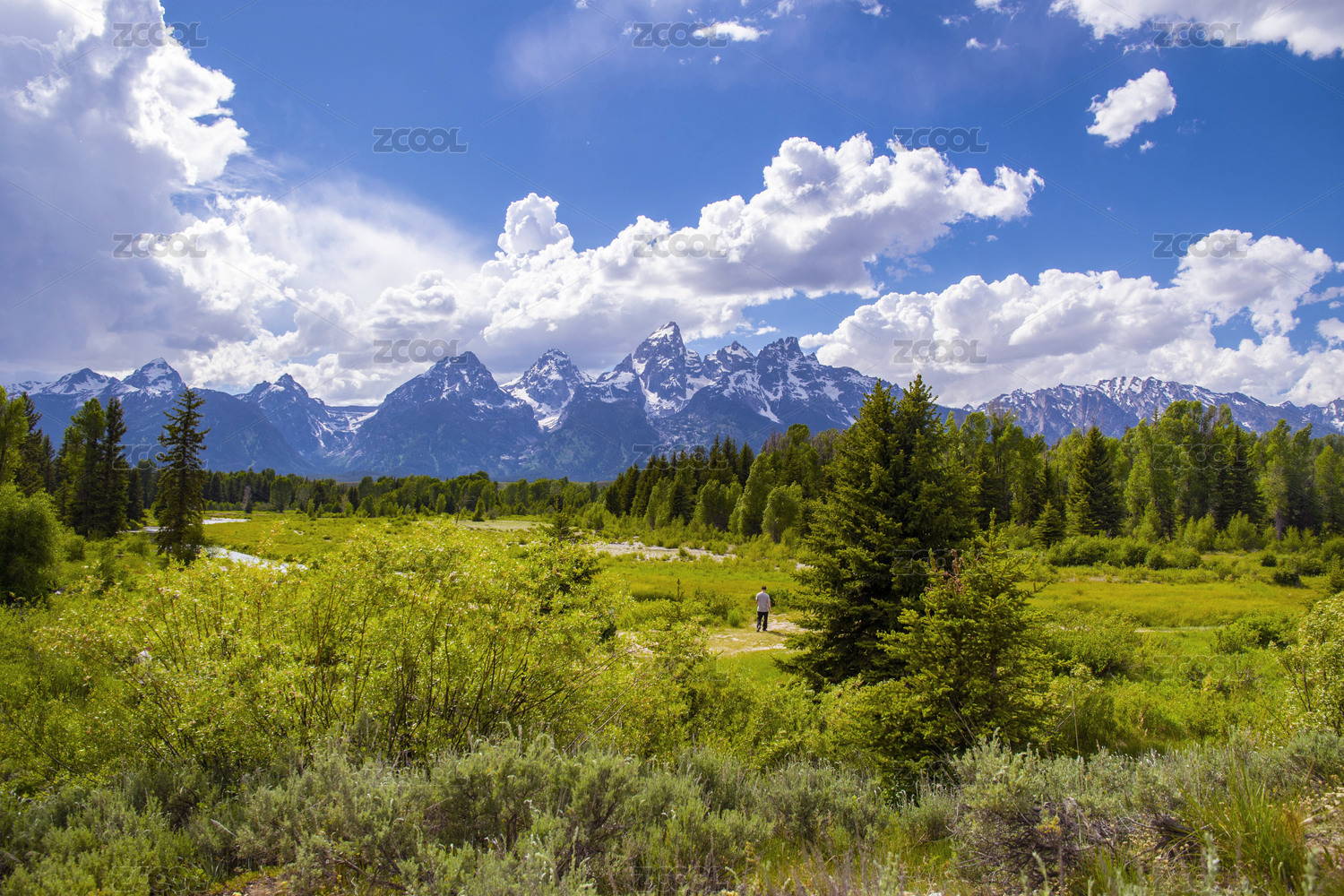 藍(lán)天下美國黃石公園大提頓公園雪山草地風(fēng)光