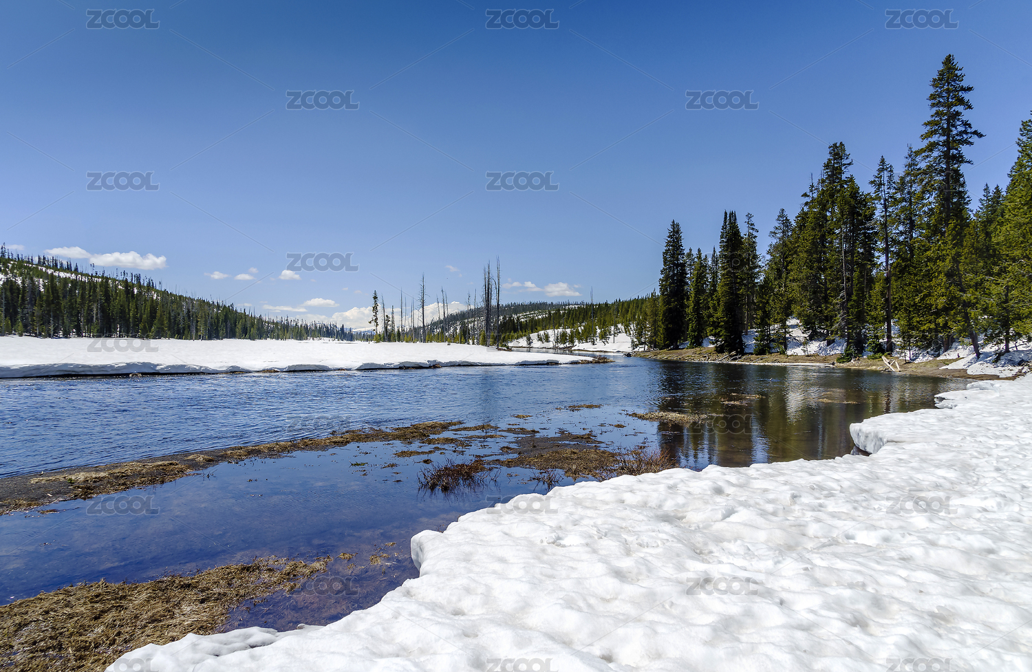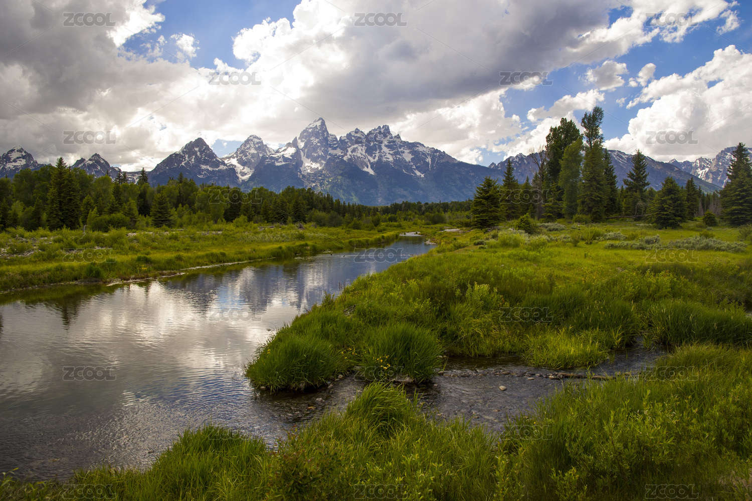 藍(lán)天下美國黃石公園大提頓公園雪山溪水風(fēng)光