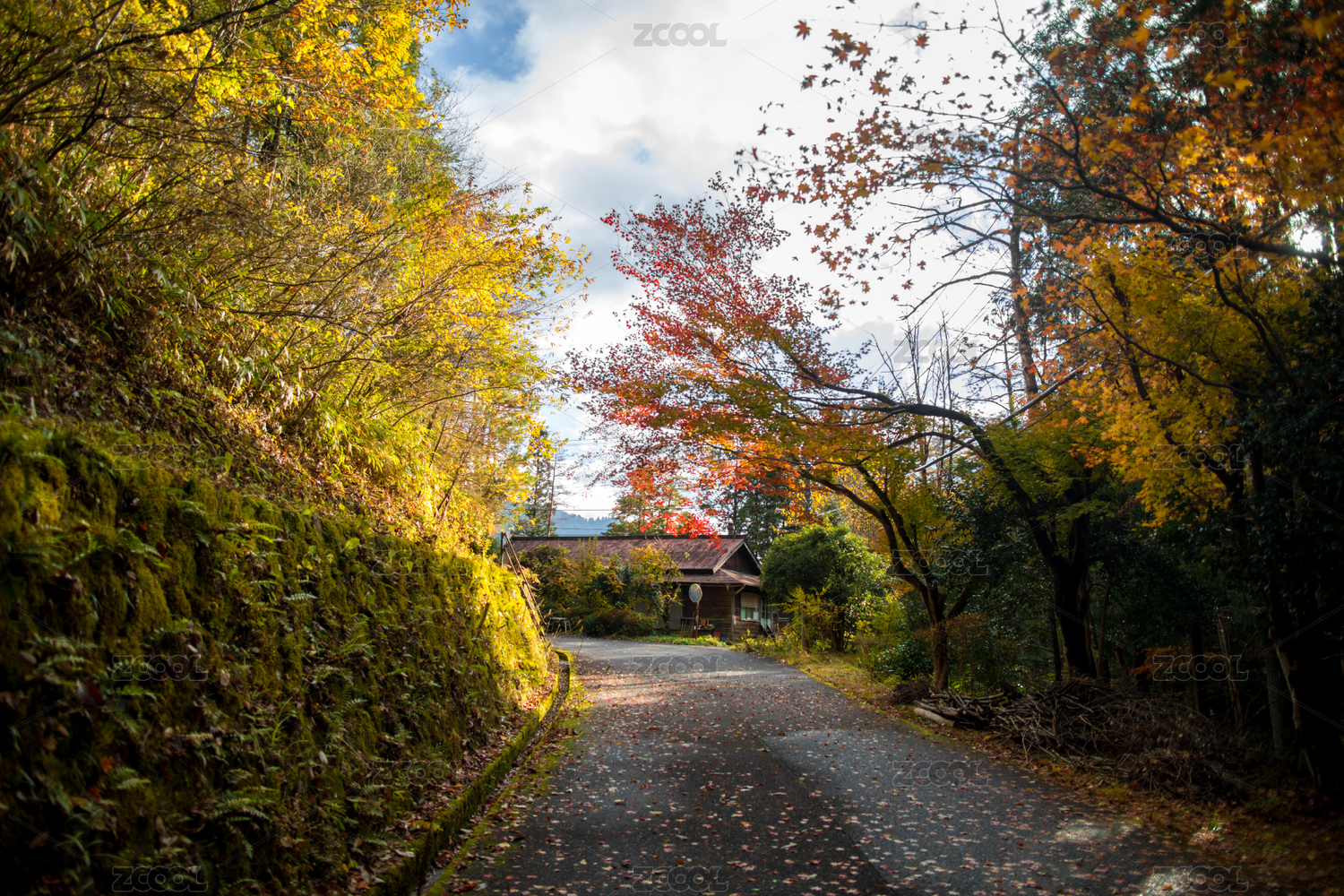 神秘森林樹影秋天逆光中山道路晨光
