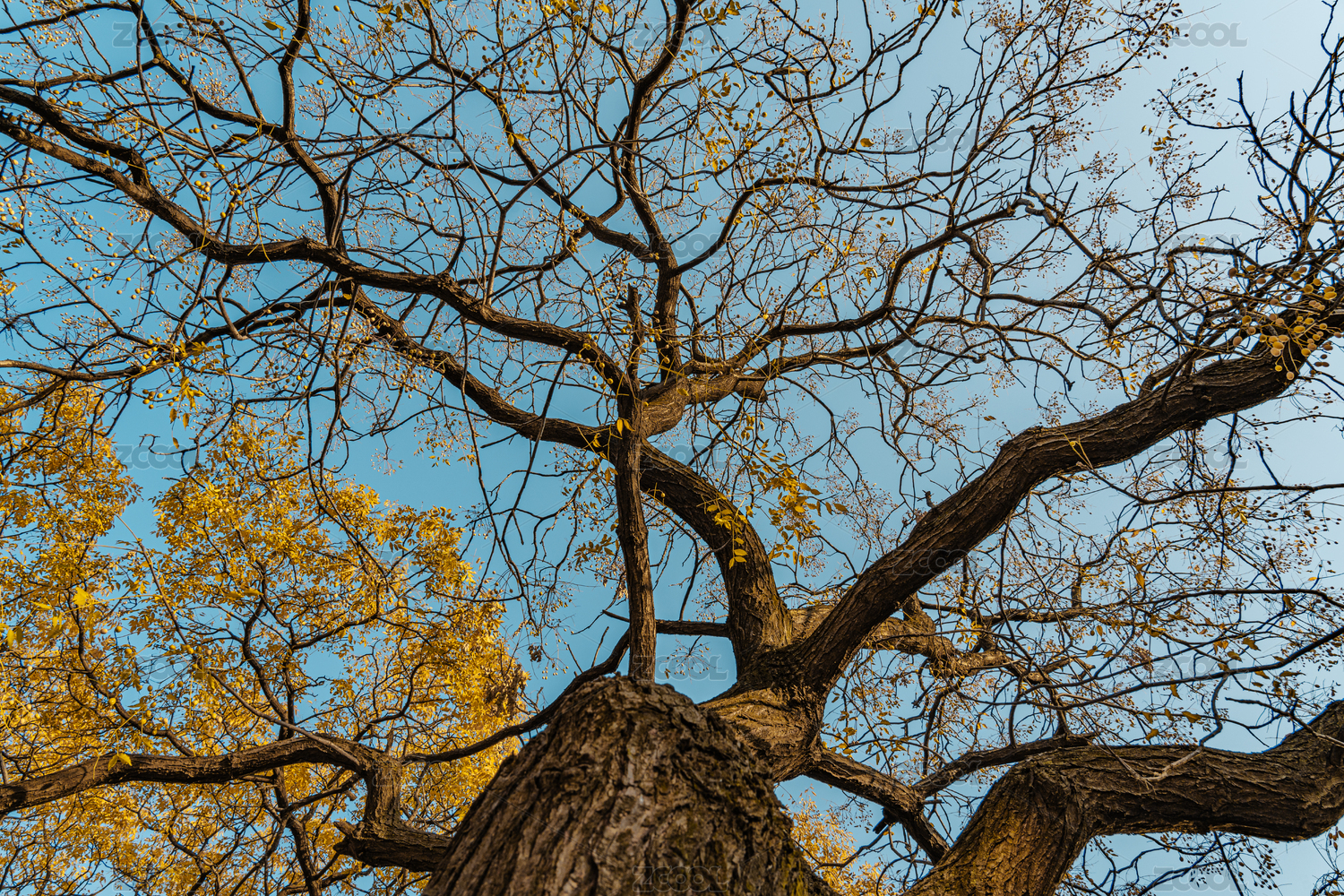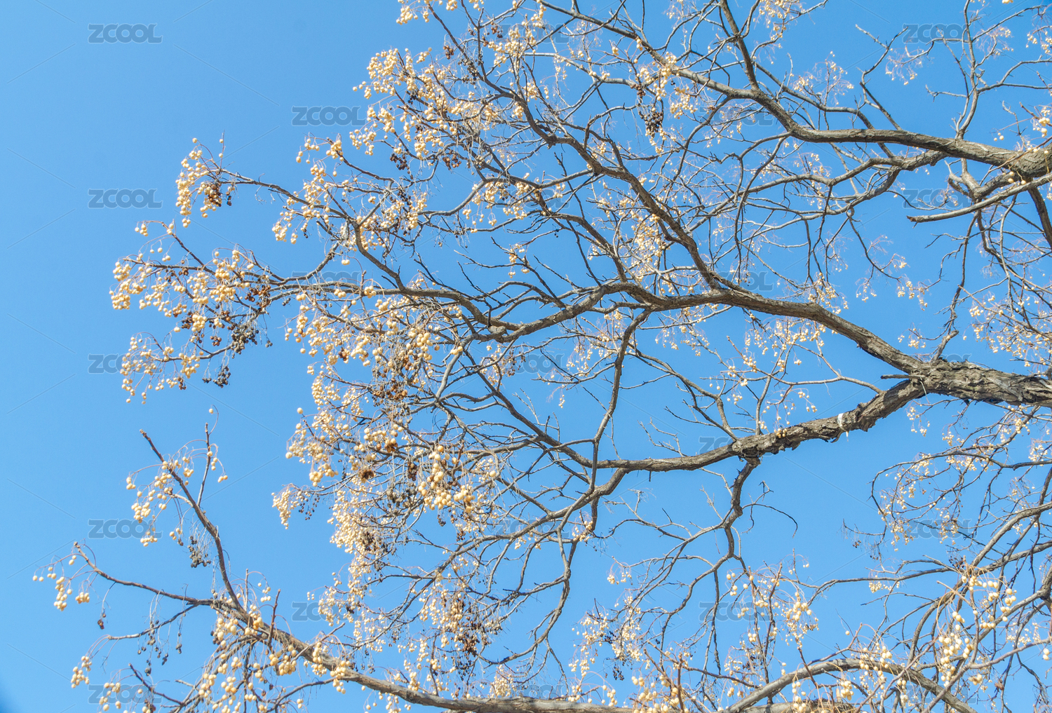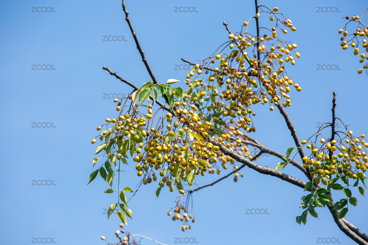 藍(lán)天下高大的苦楝樹上掛著密密的楝棗果