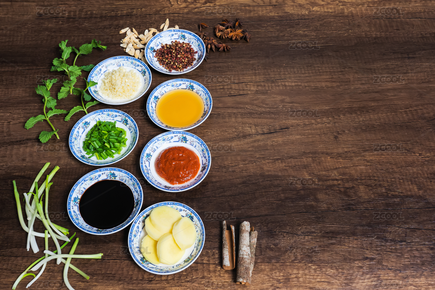 炭木色餐桌上放著各色各樣的烹飪佐料