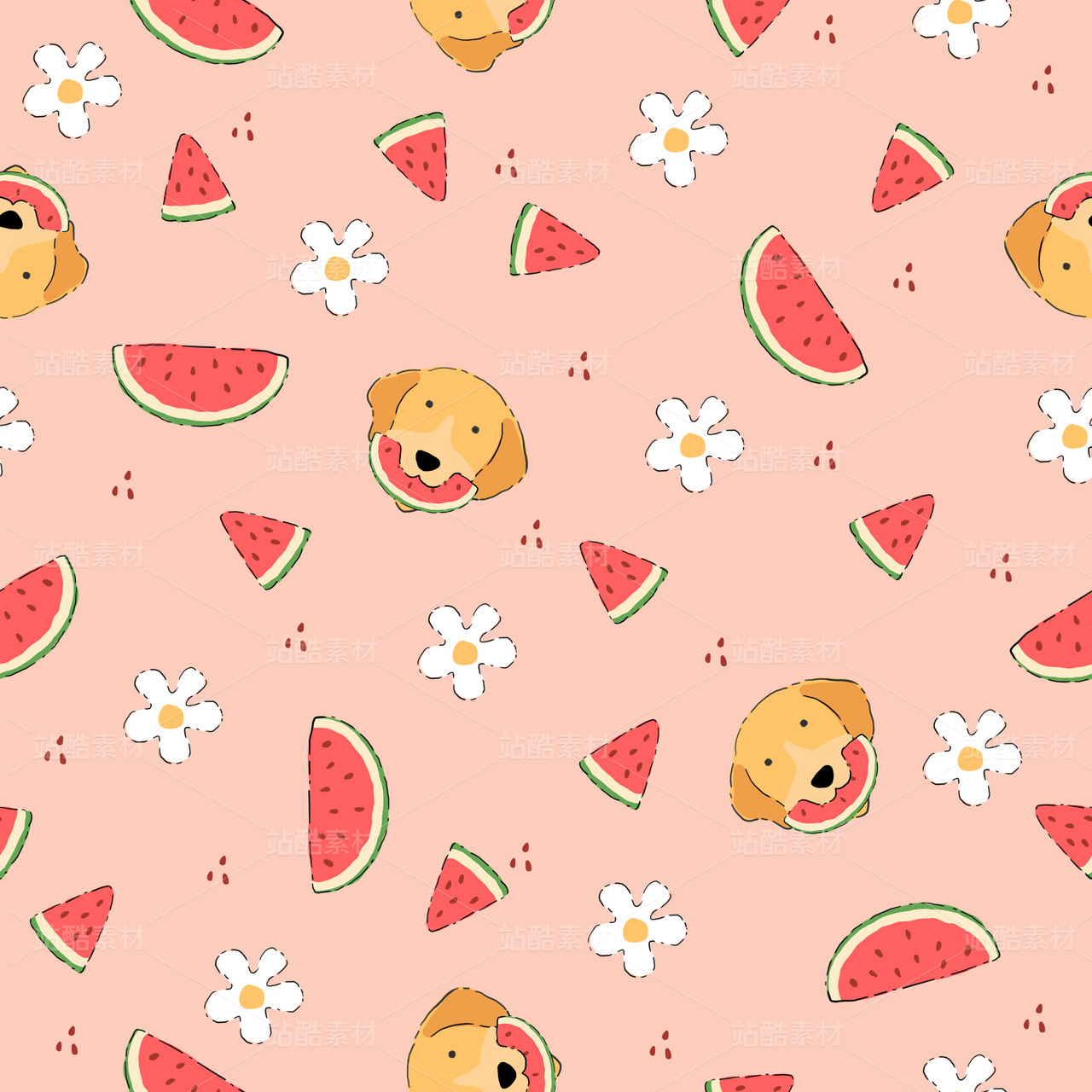 金毛小狗吃西瓜手繪清新風四方連續(xù)圖案