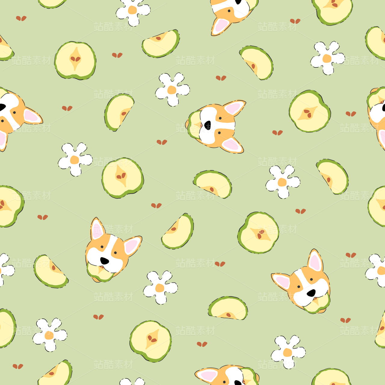 柯基小狗吃蘋果手繪清新風四方連續(xù)圖案