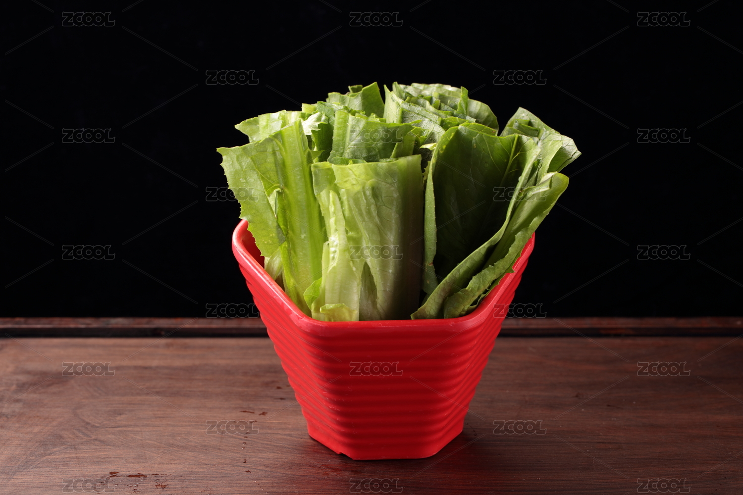 木桌上紅碗里的的重慶火鍋菜品生萵筍葉