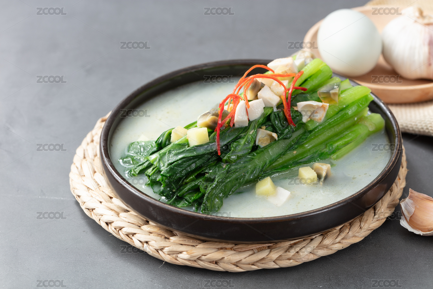 草墊上深棕色盤子里的皮蛋豆腐煮青菜萵筍葉