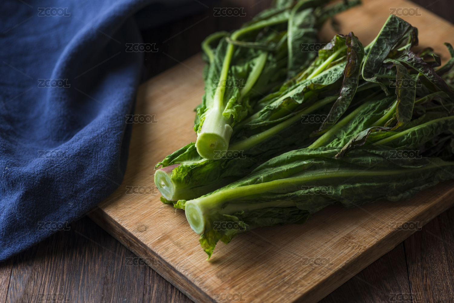低光照的案板上放置的新鮮萵筍尖蔬菜