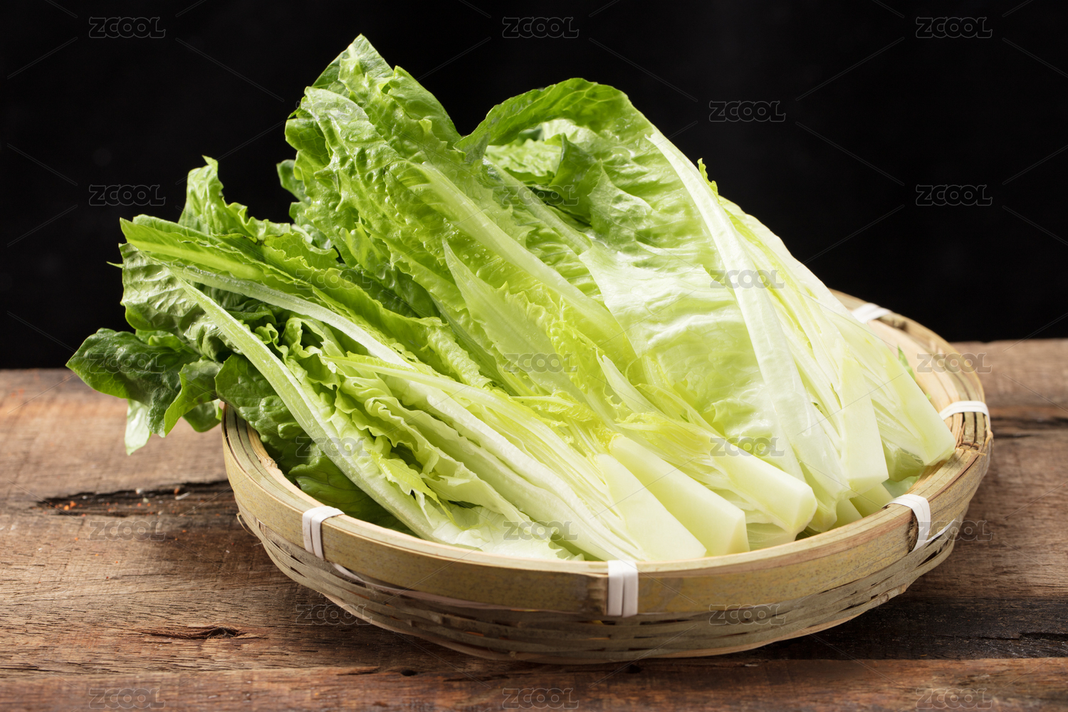 木桌上筲箕里的火鍋菜品新鮮萵筍葉