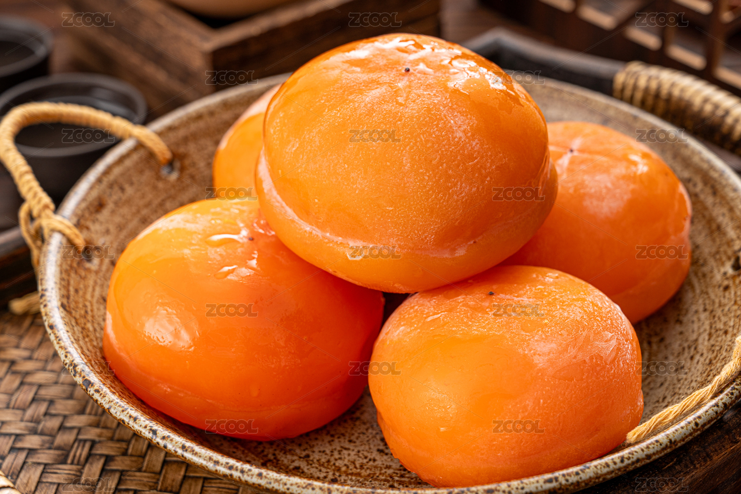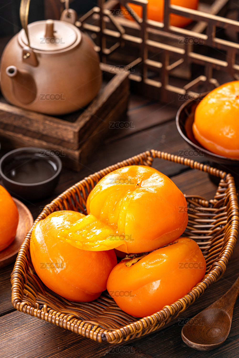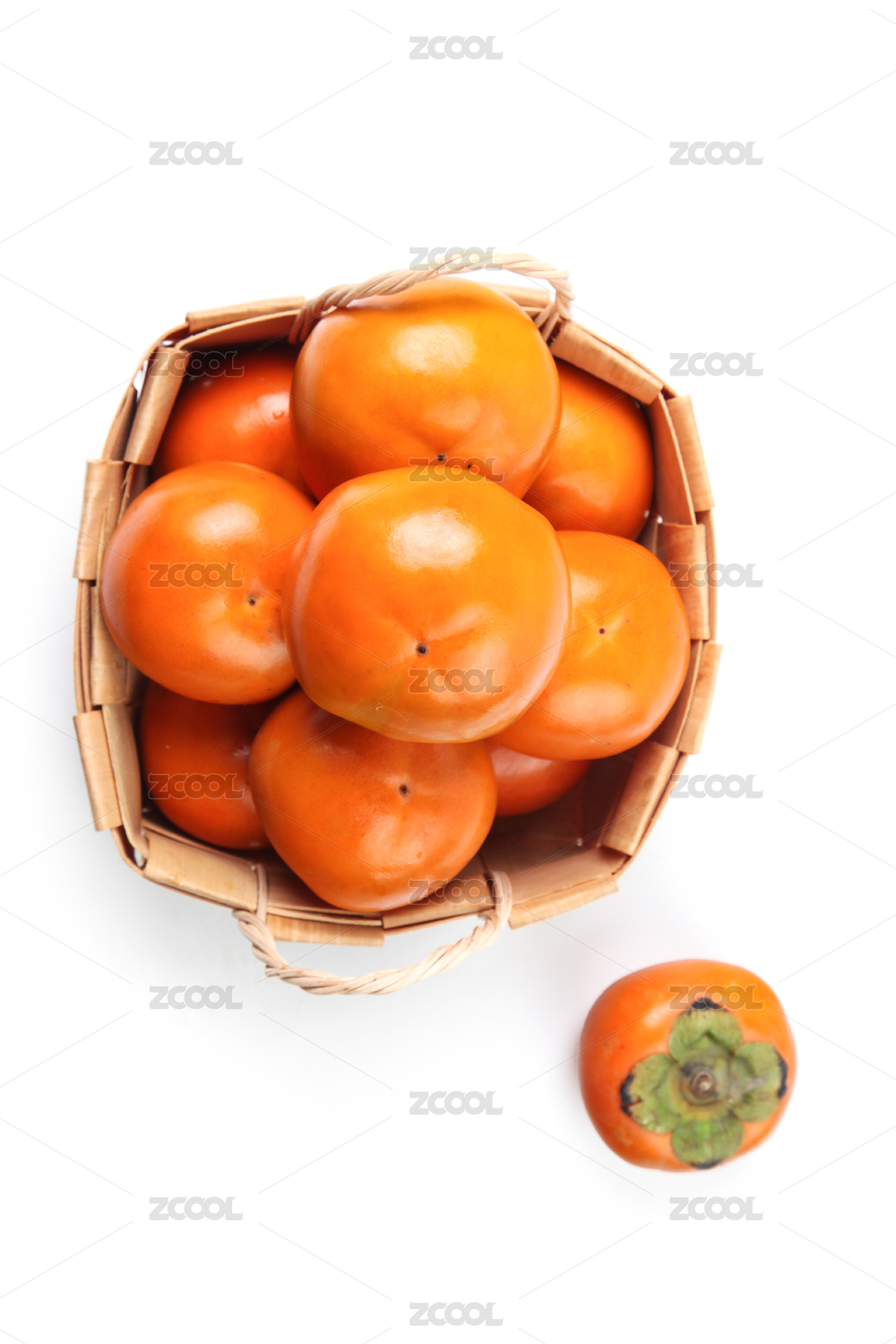 白底上籃子里裝著的黃柿子和旁邊的果肉切片