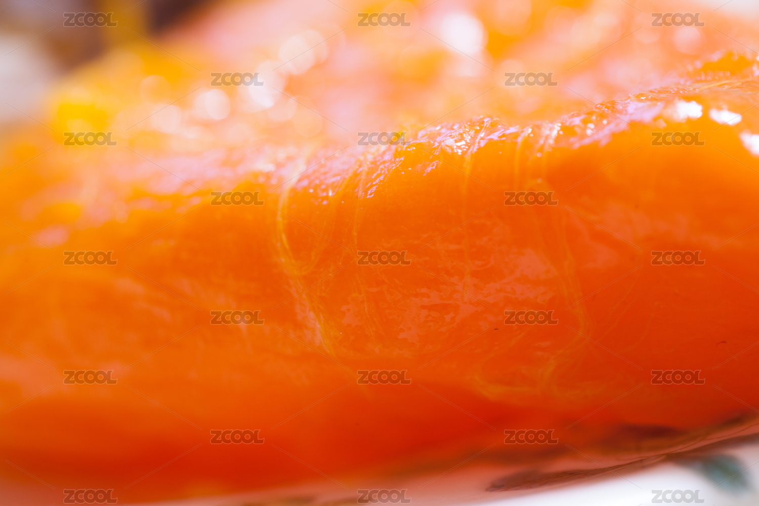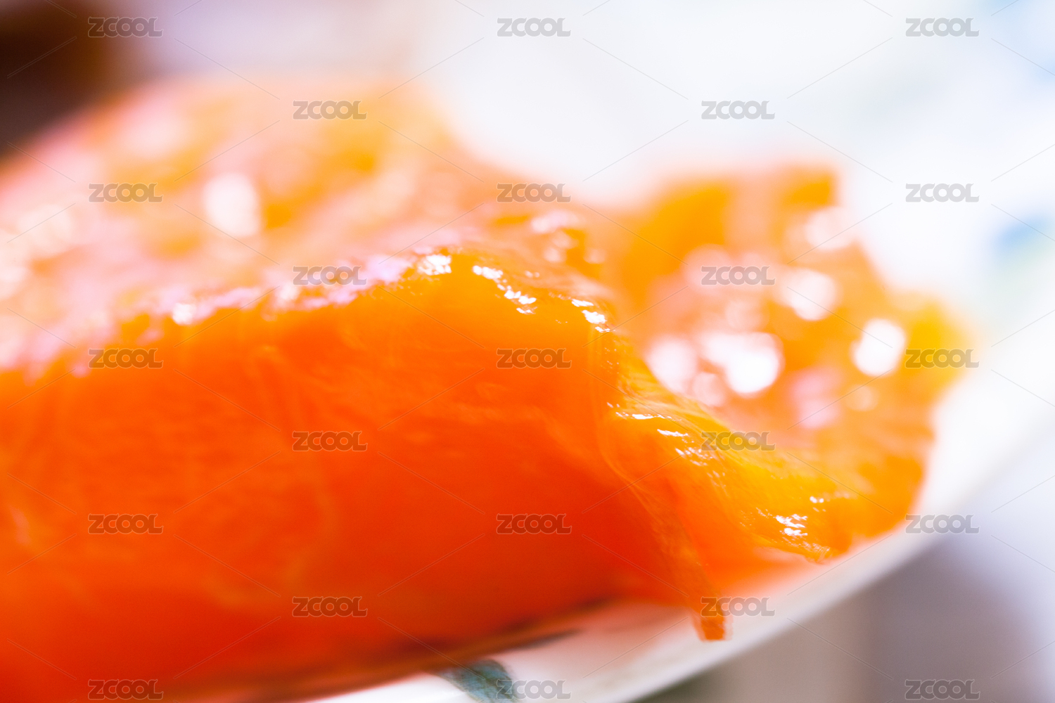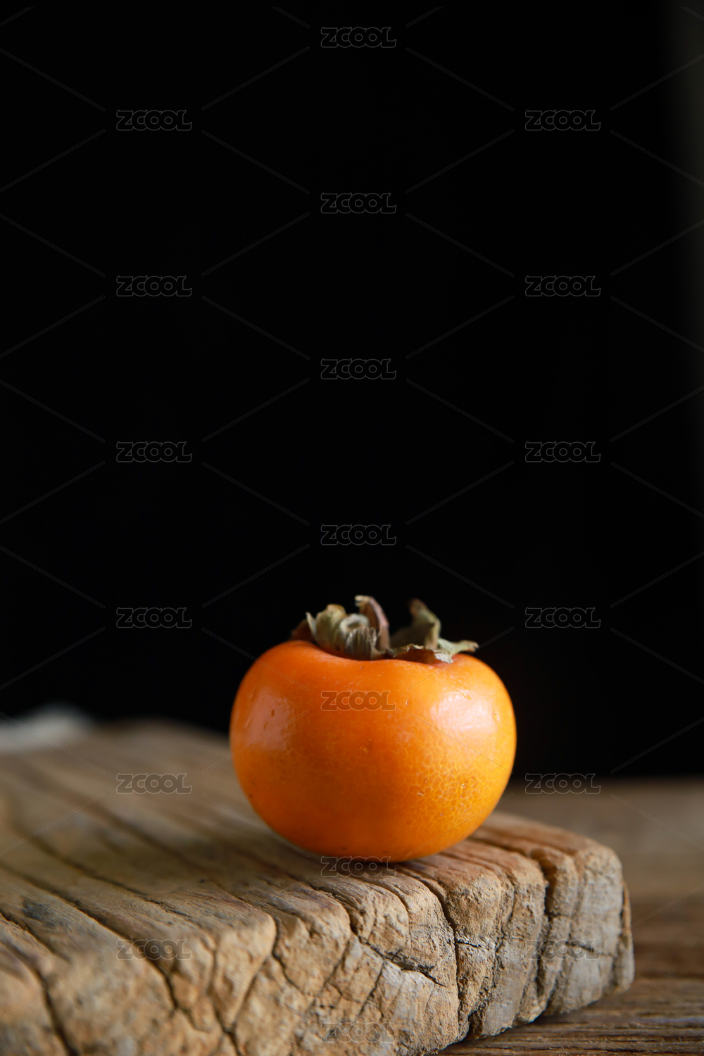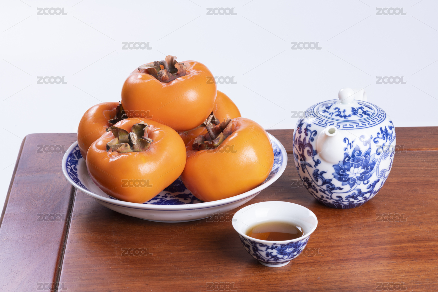 白底上俯拍盤子里裝著的黃柿子和果肉切片