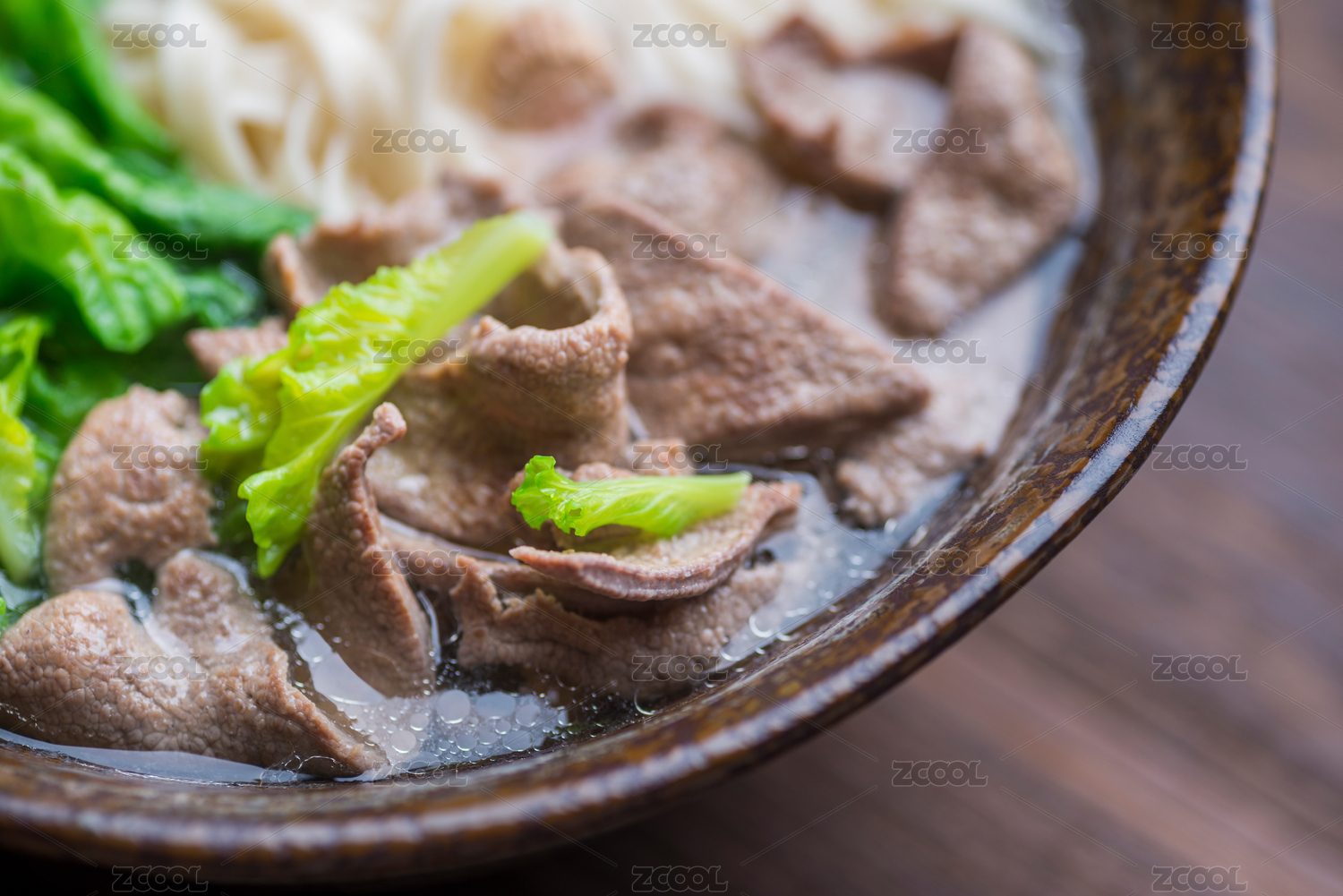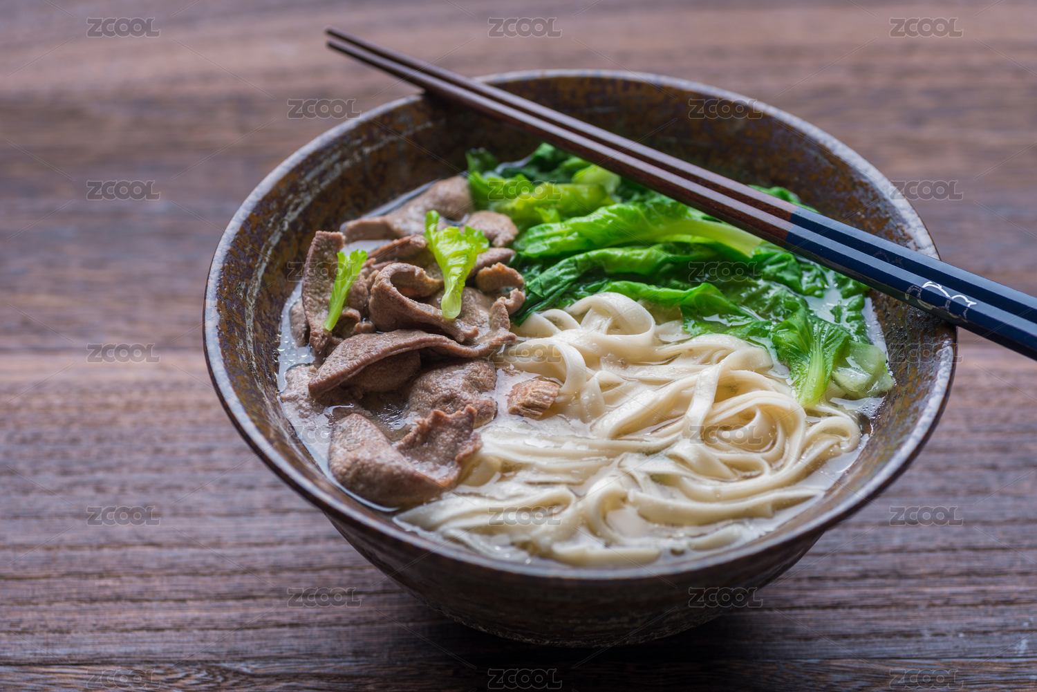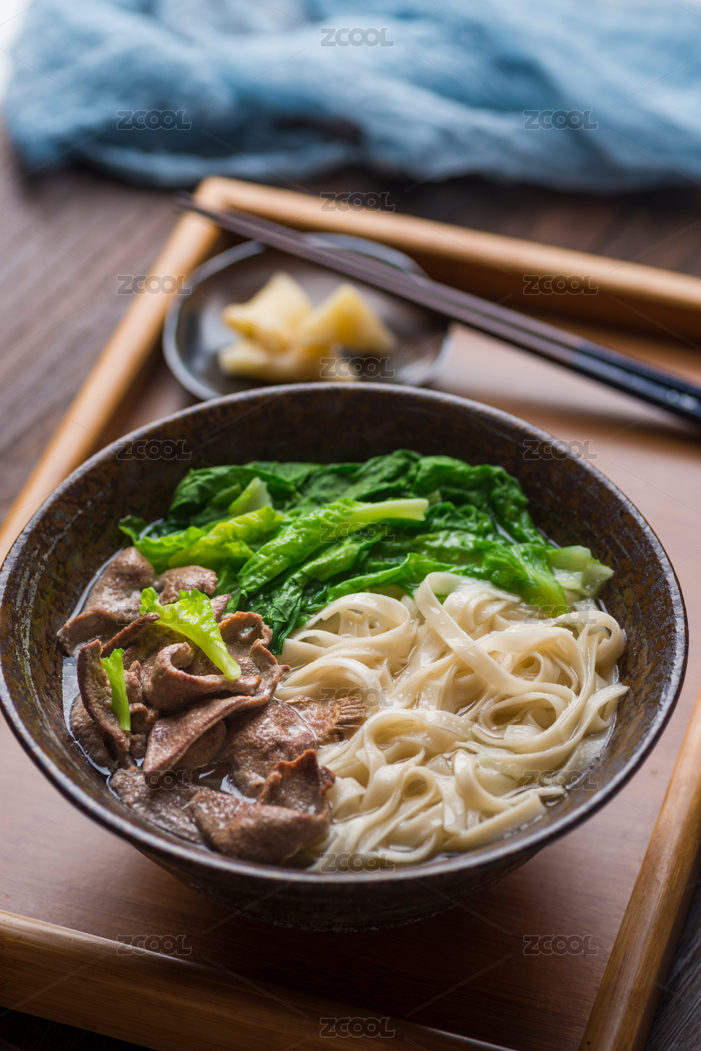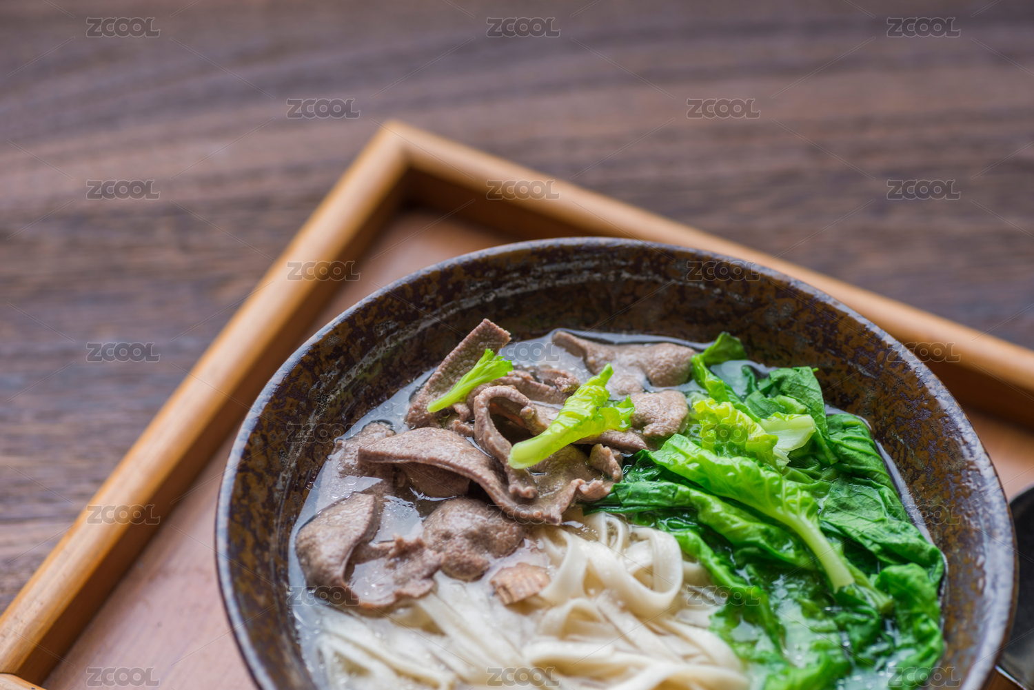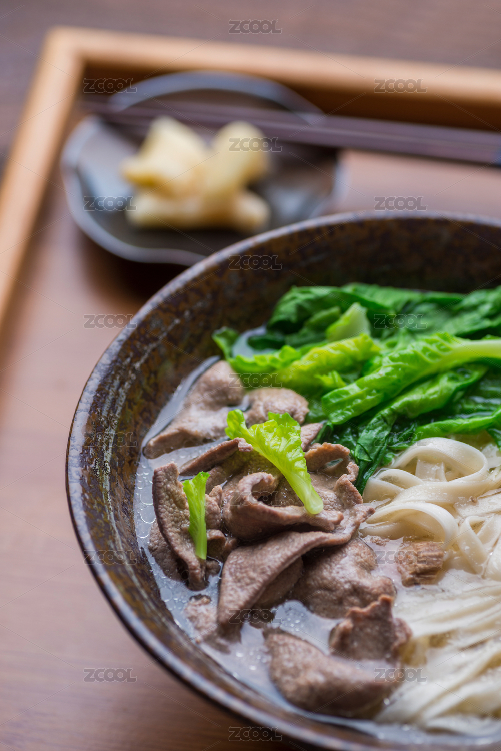 一碗點(diǎn)綴著青菜的豬肝煮面條