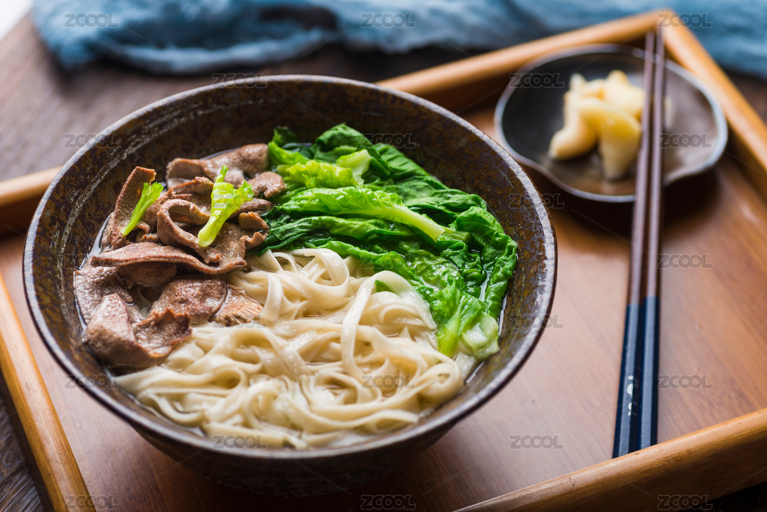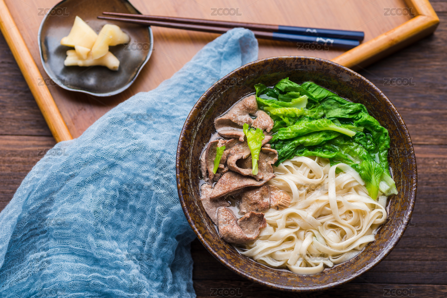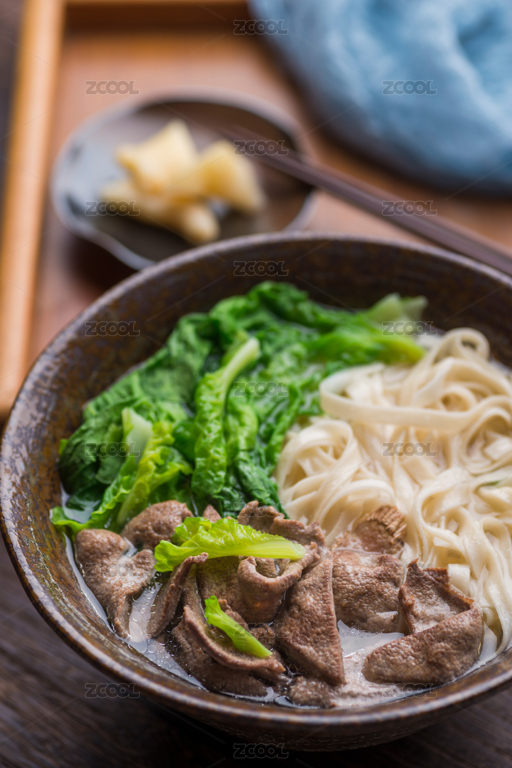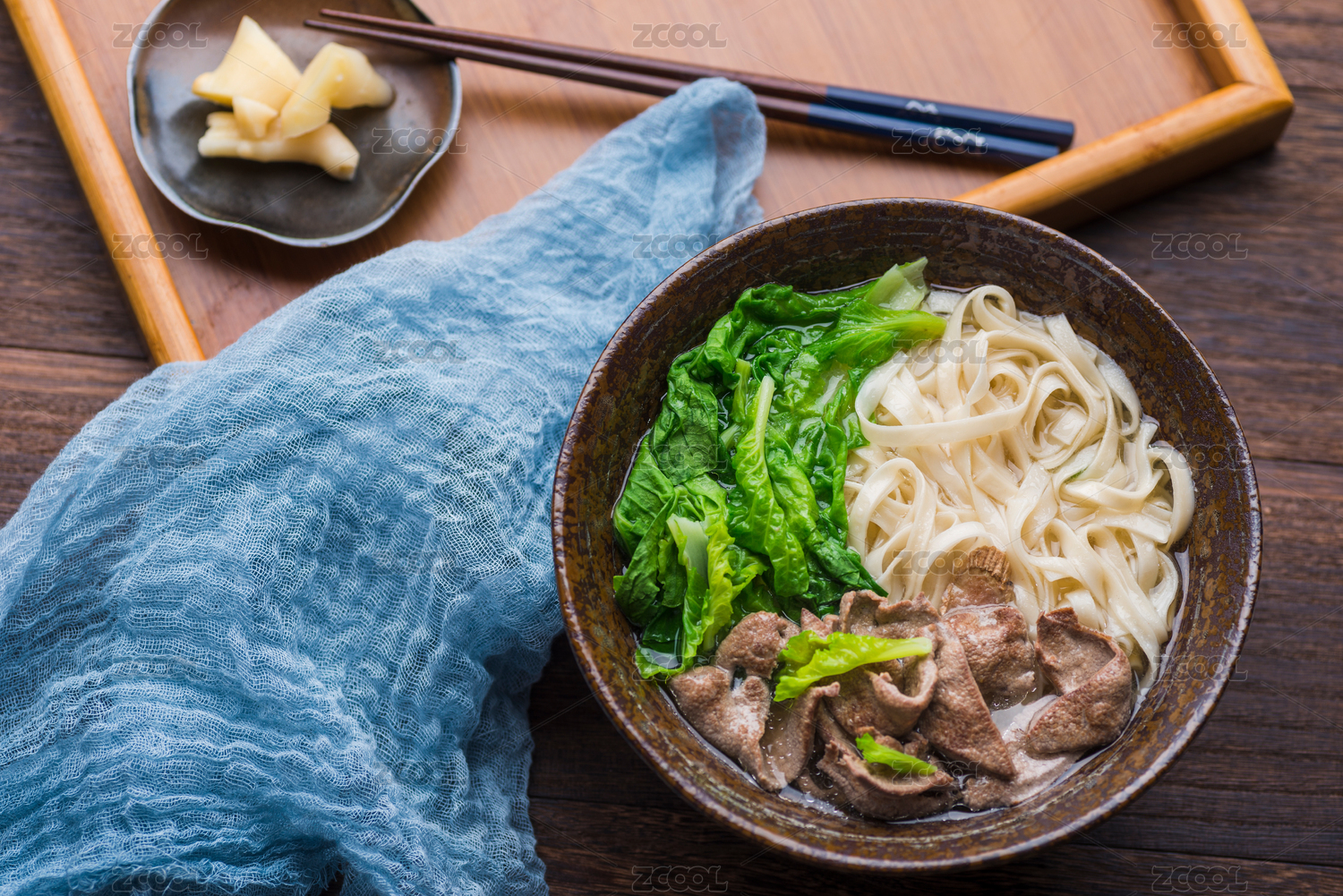 一碗點(diǎn)綴著青菜的豬肝煮面條