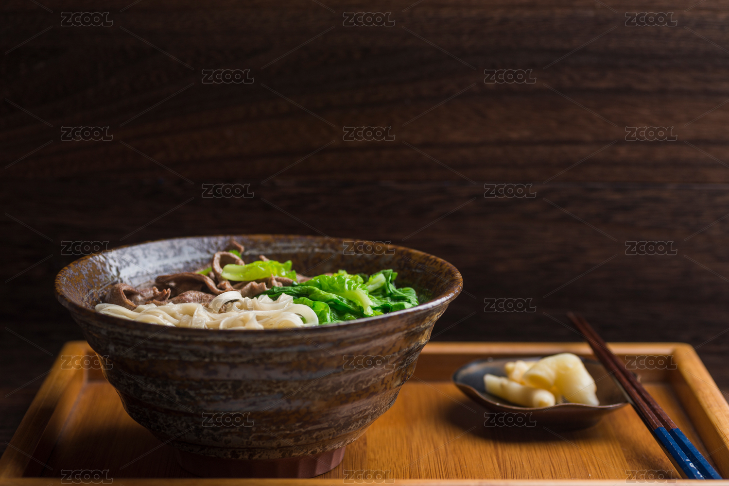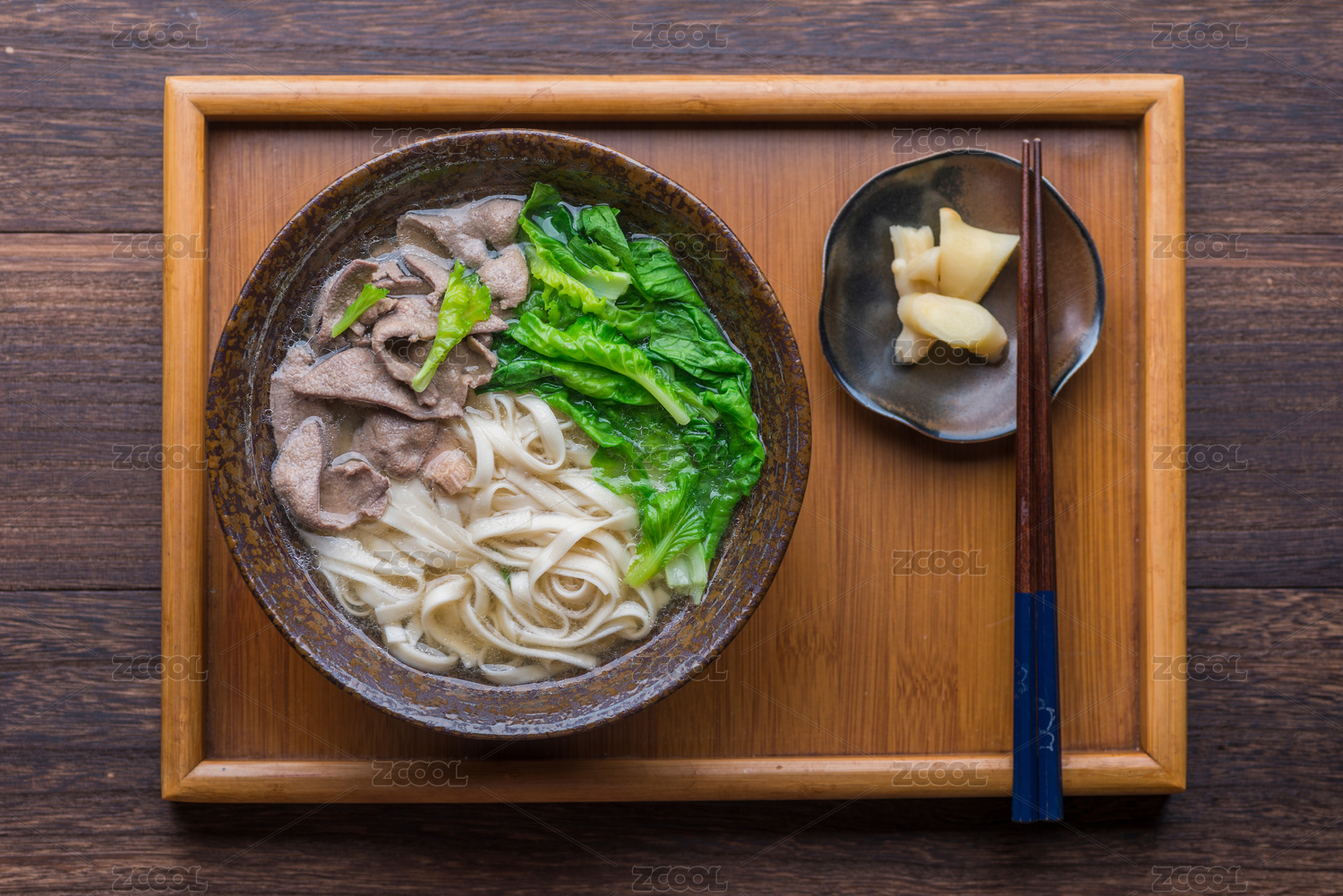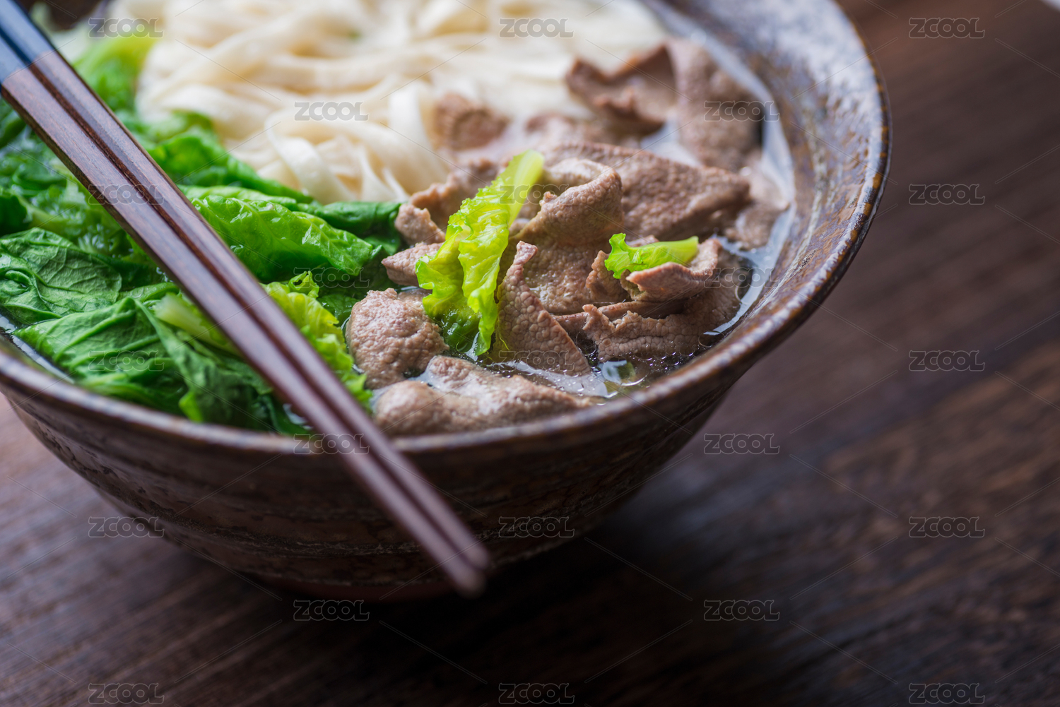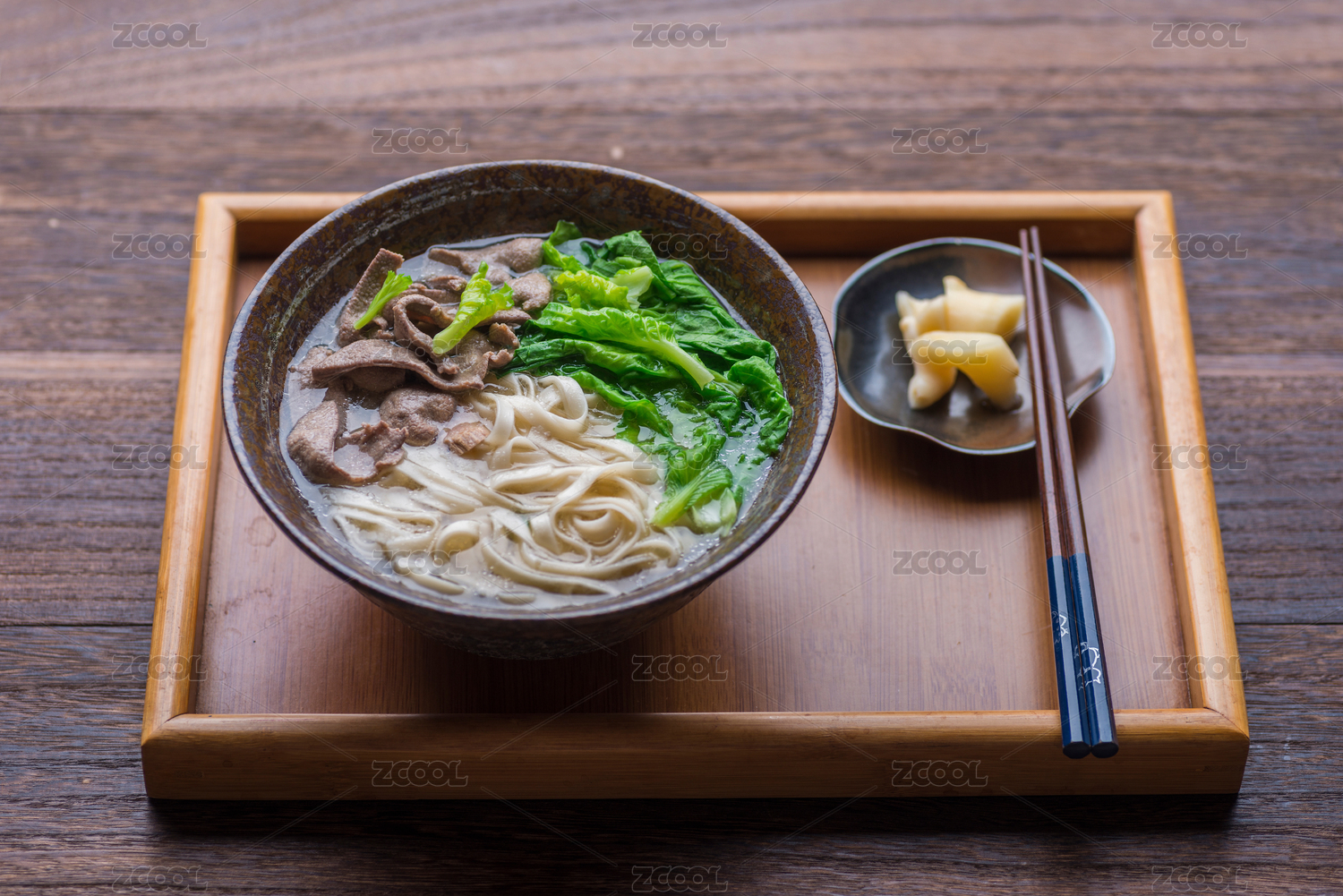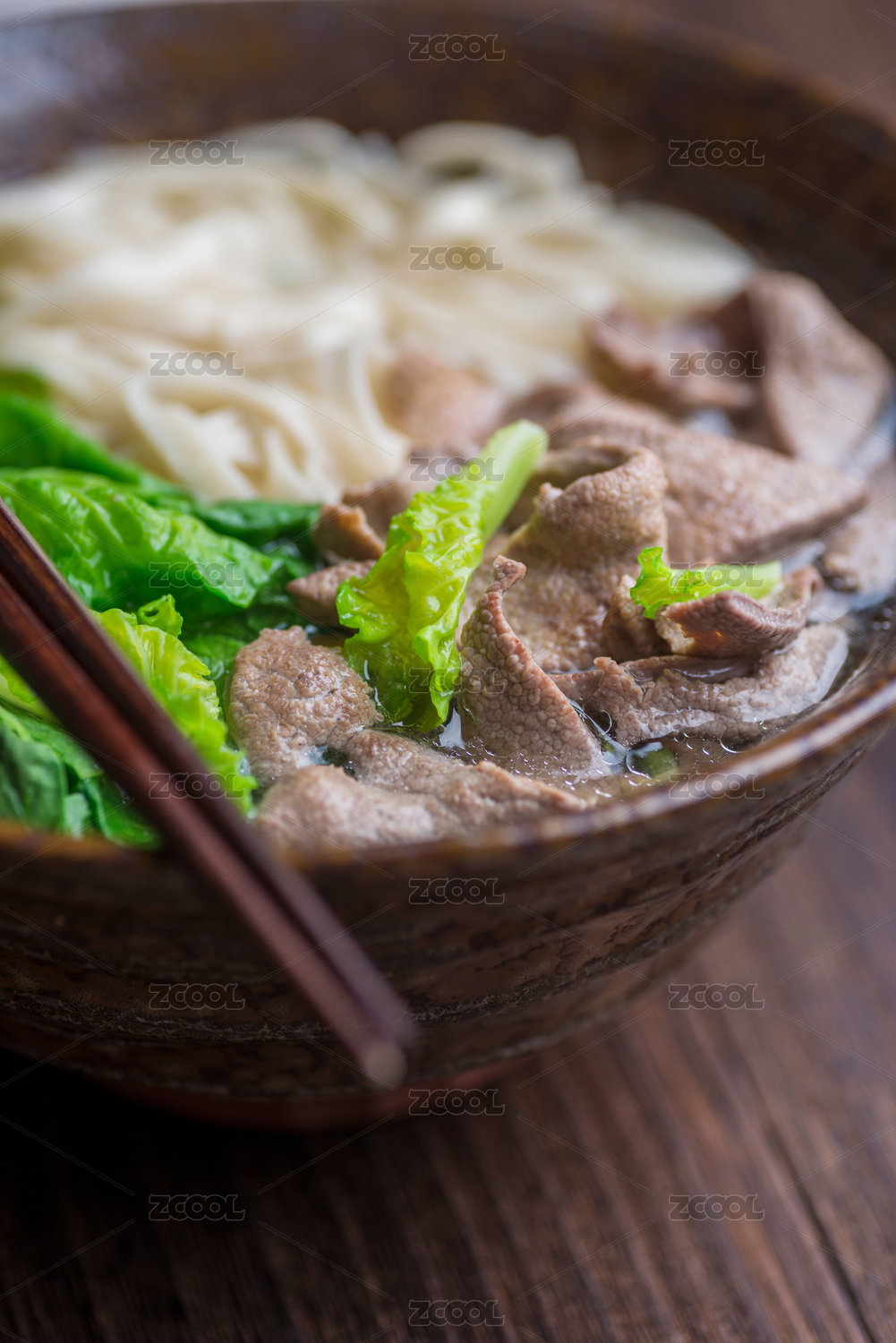 一碗點(diǎn)綴著青菜的豬肝煮面條