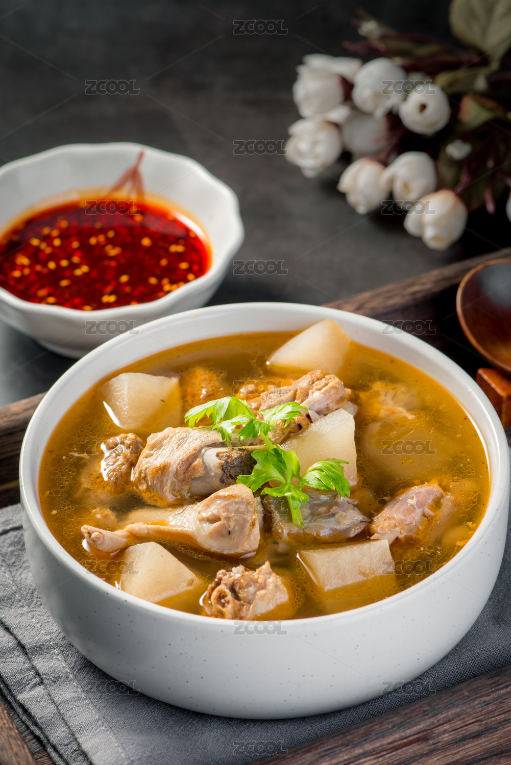 酸蘿卜老鴨湯特寫木桌面深色調(diào)