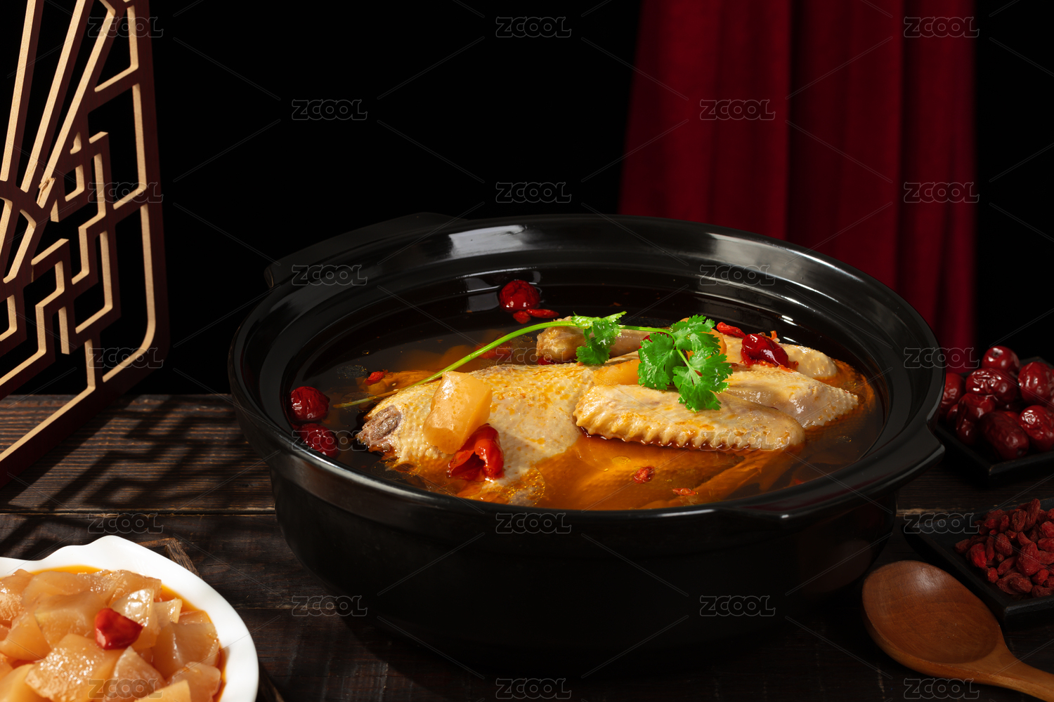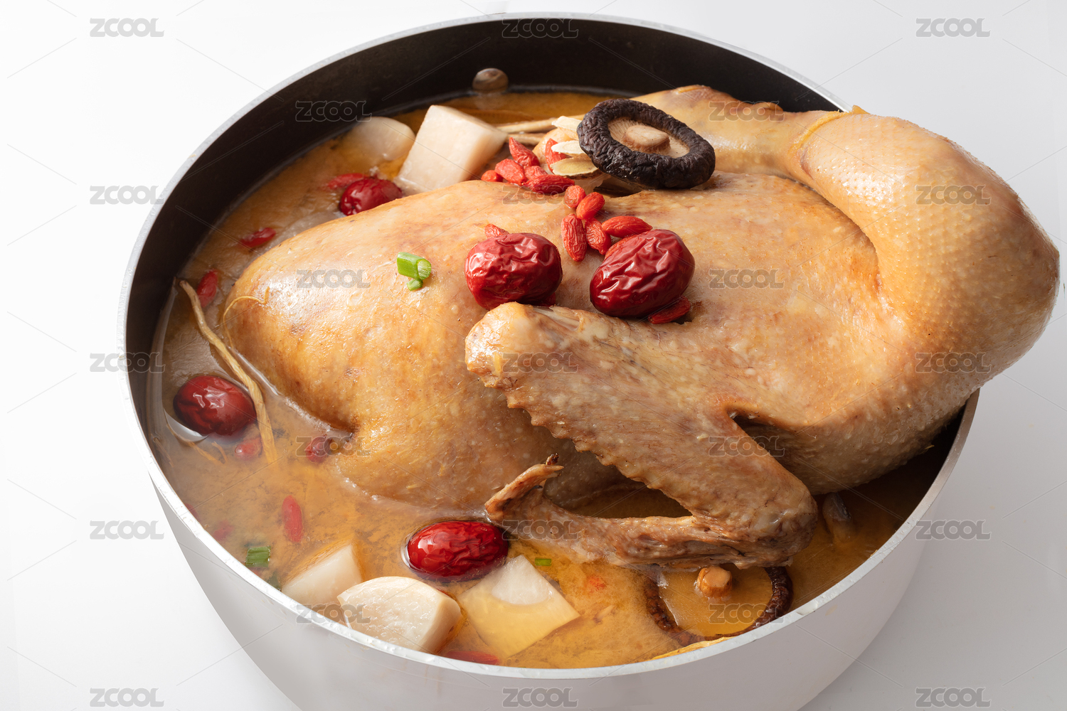 正在倒入熱湯的大砂鍋紅棗枸杞酸蘿卜老鴨湯