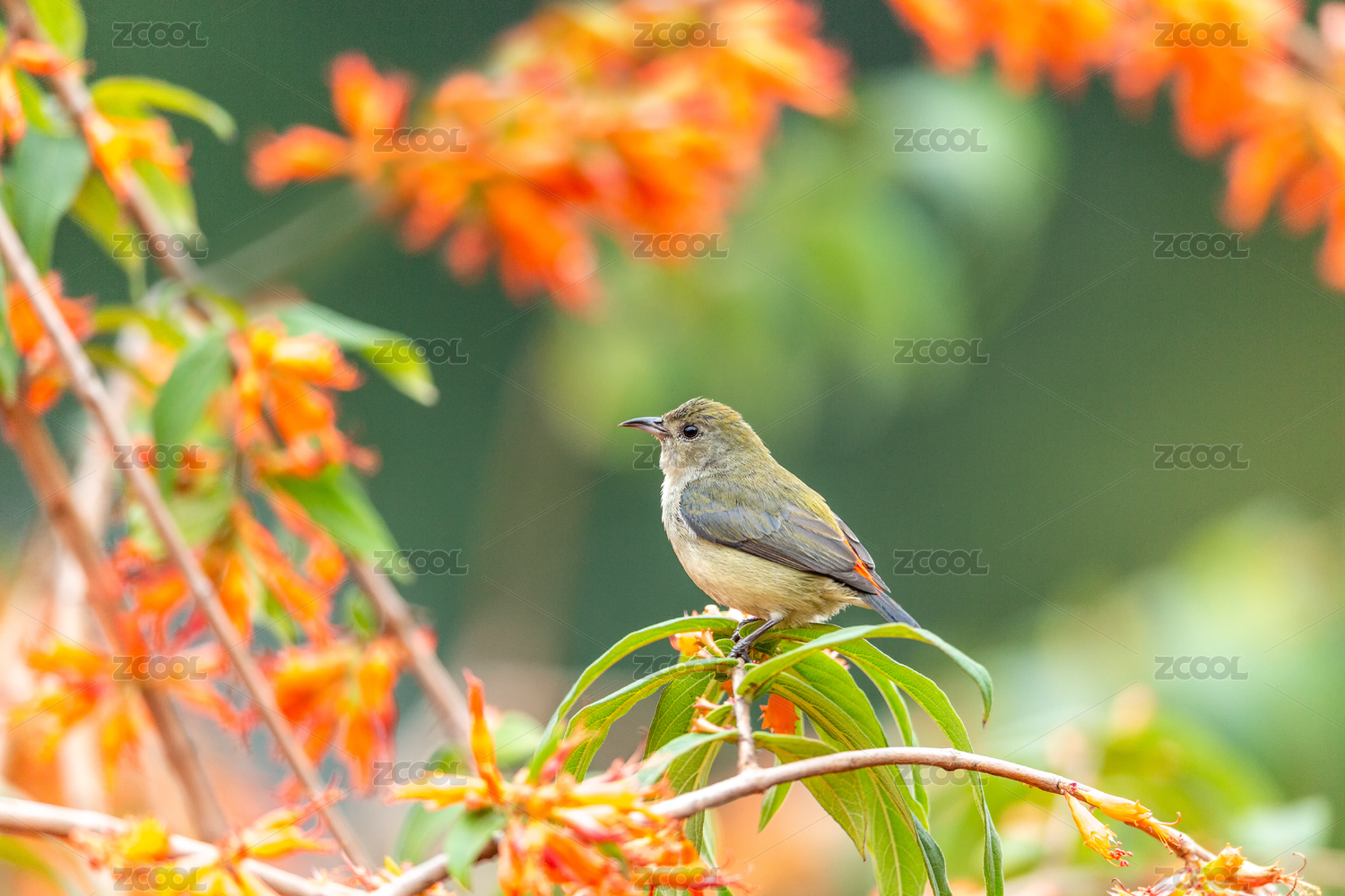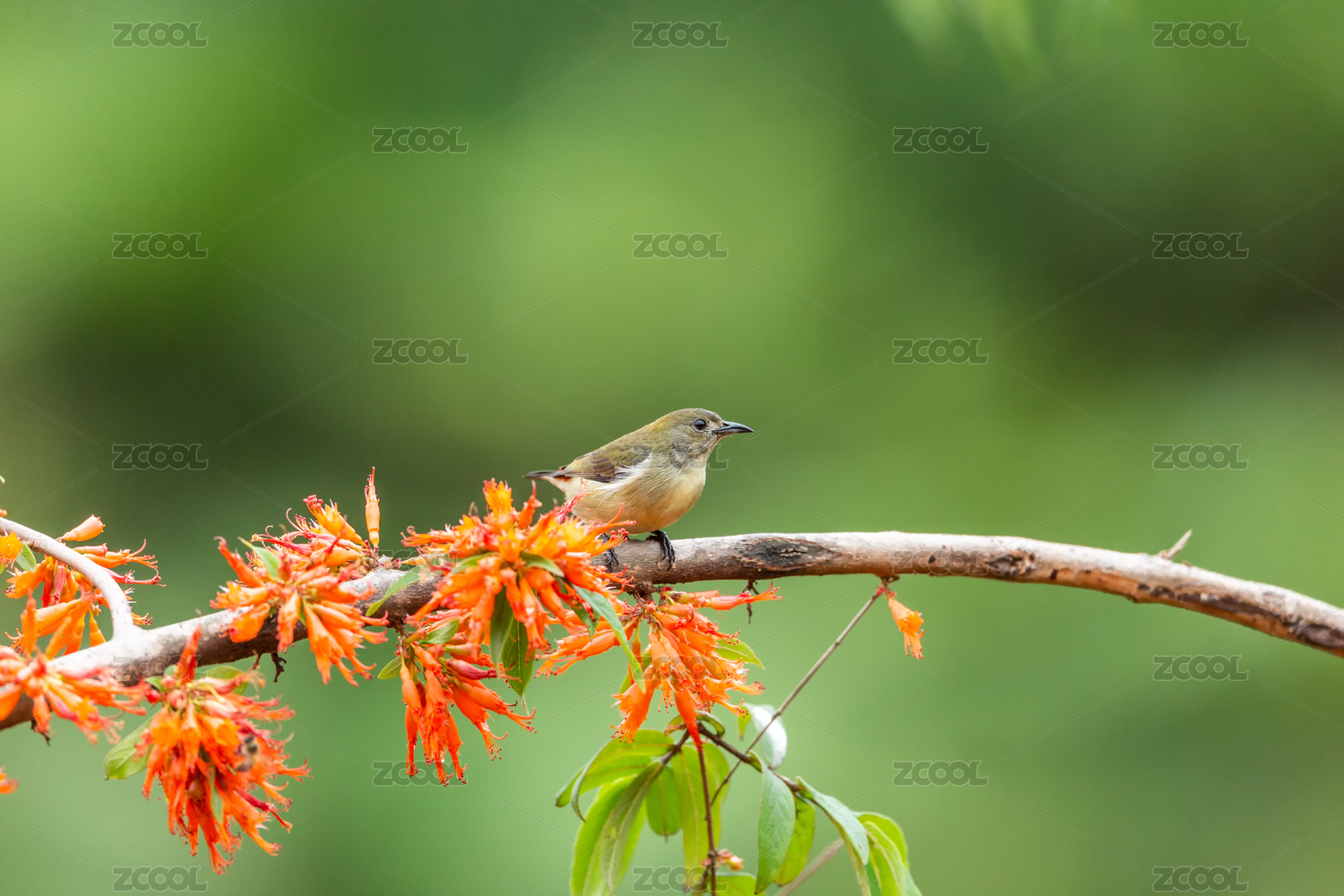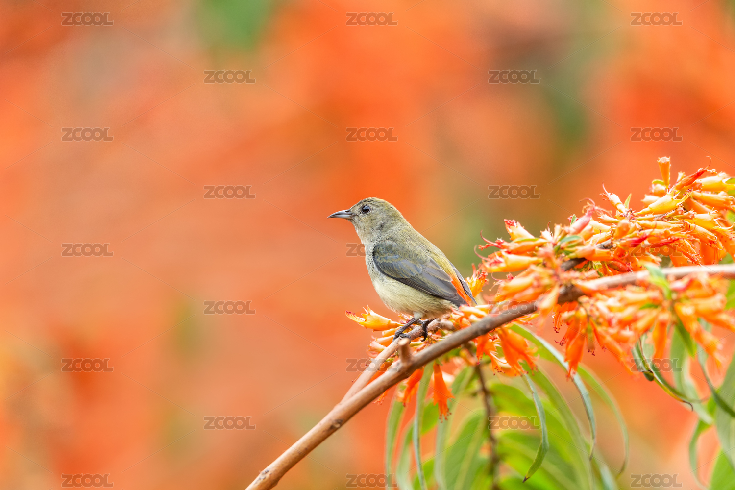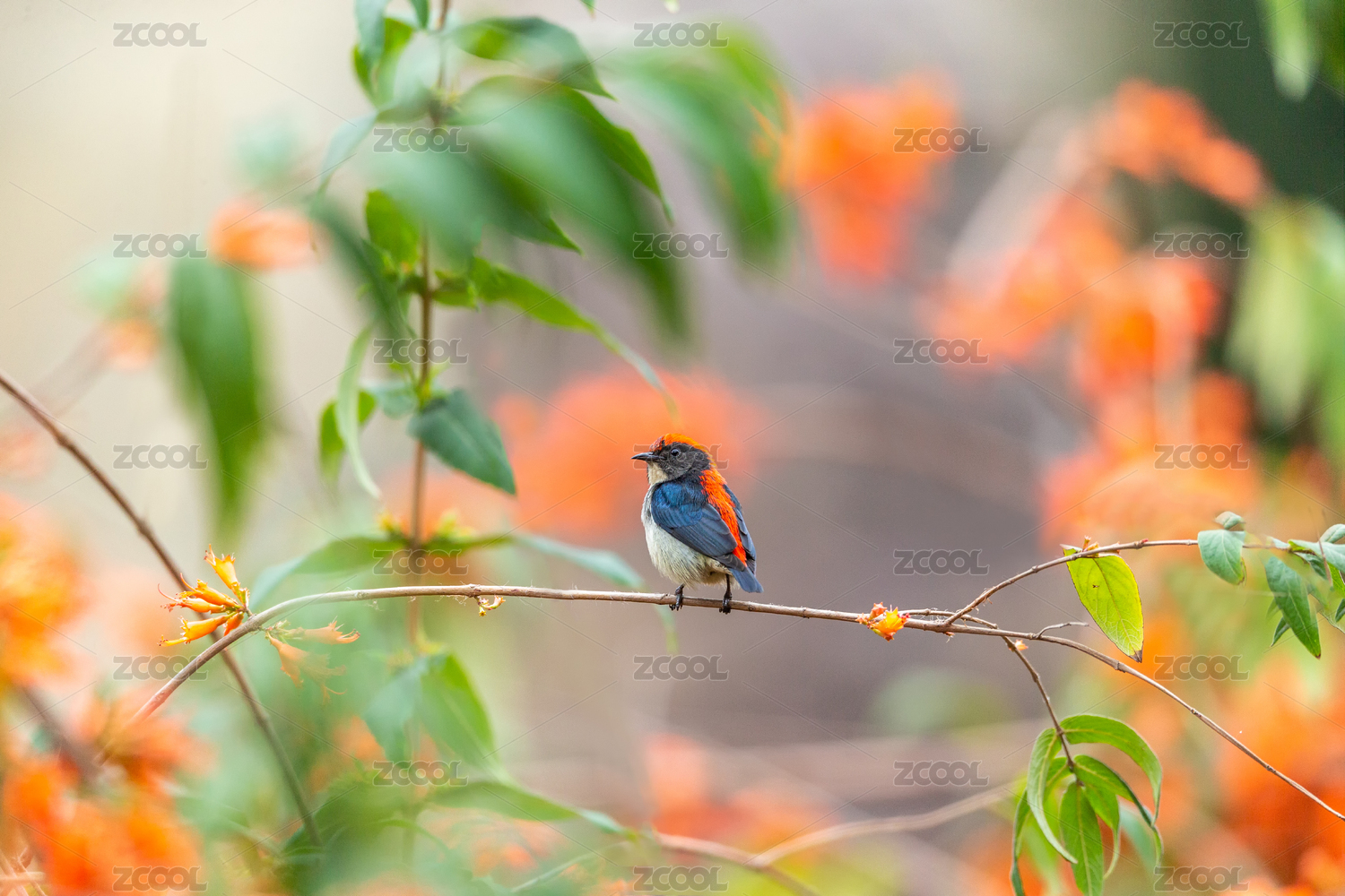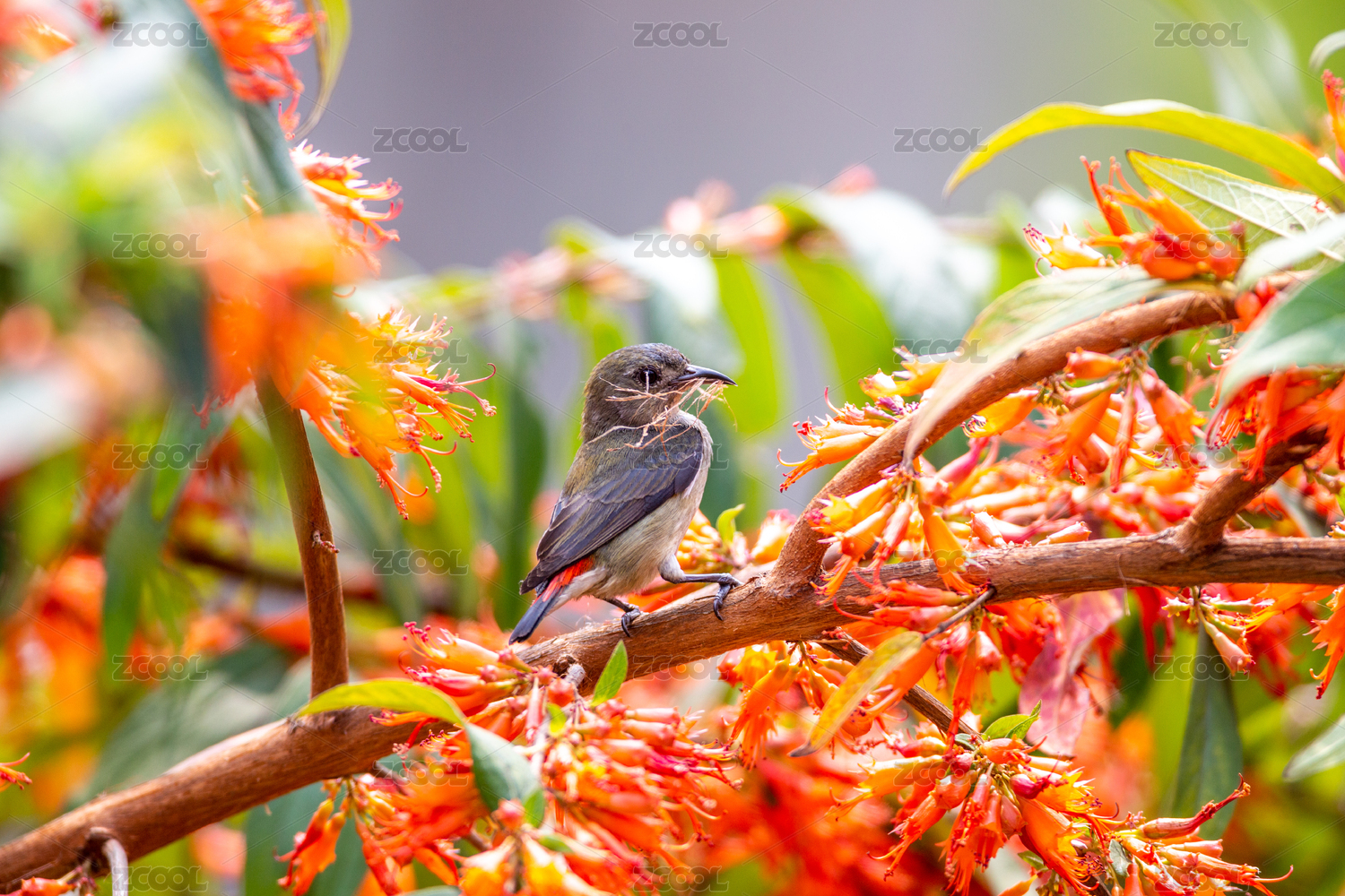 朱背啄花鳥穿梭于蝦米花樹從吸食花蜜