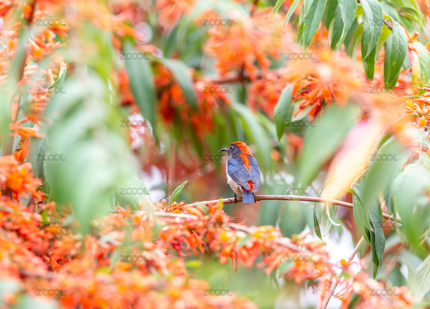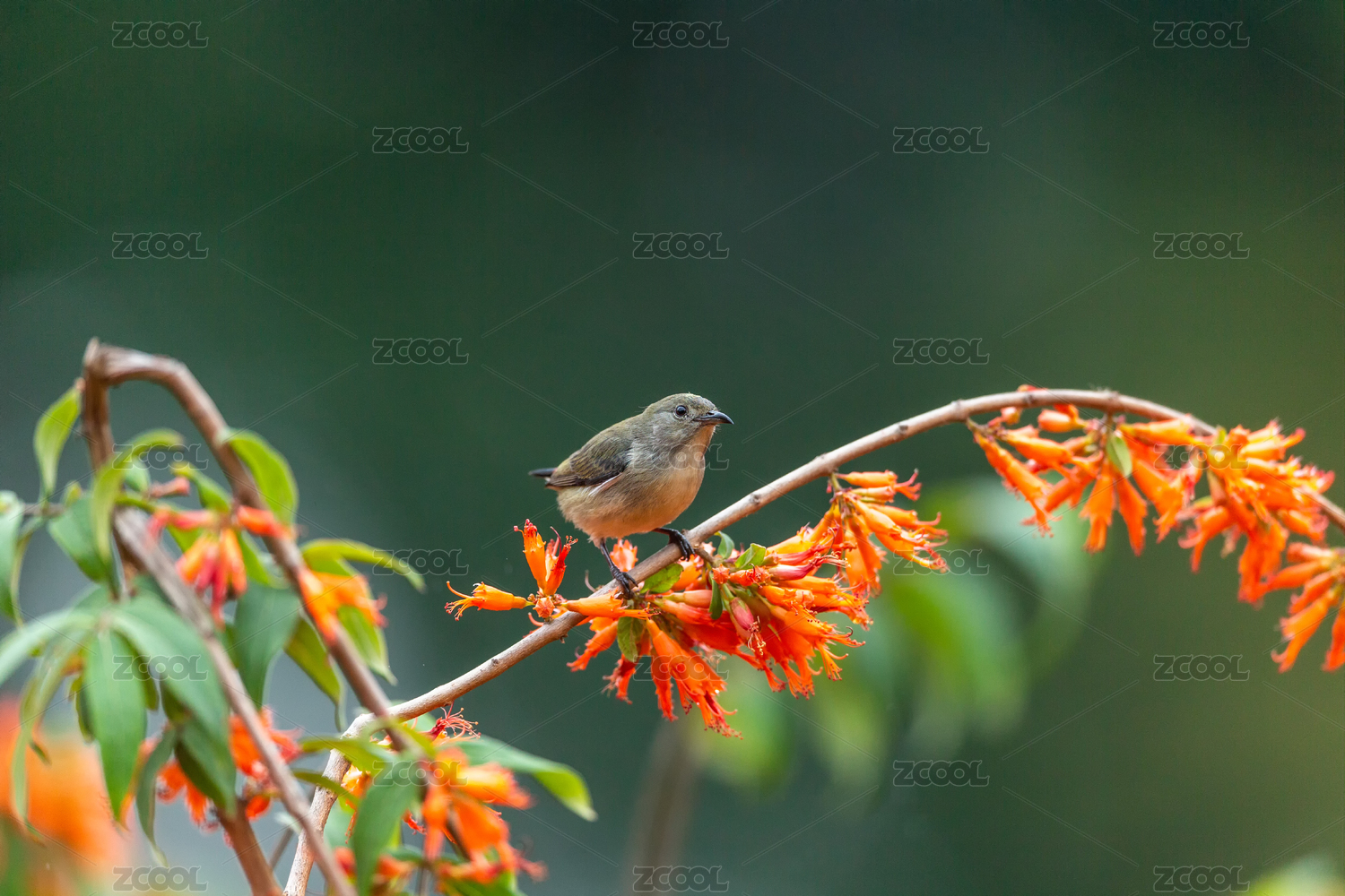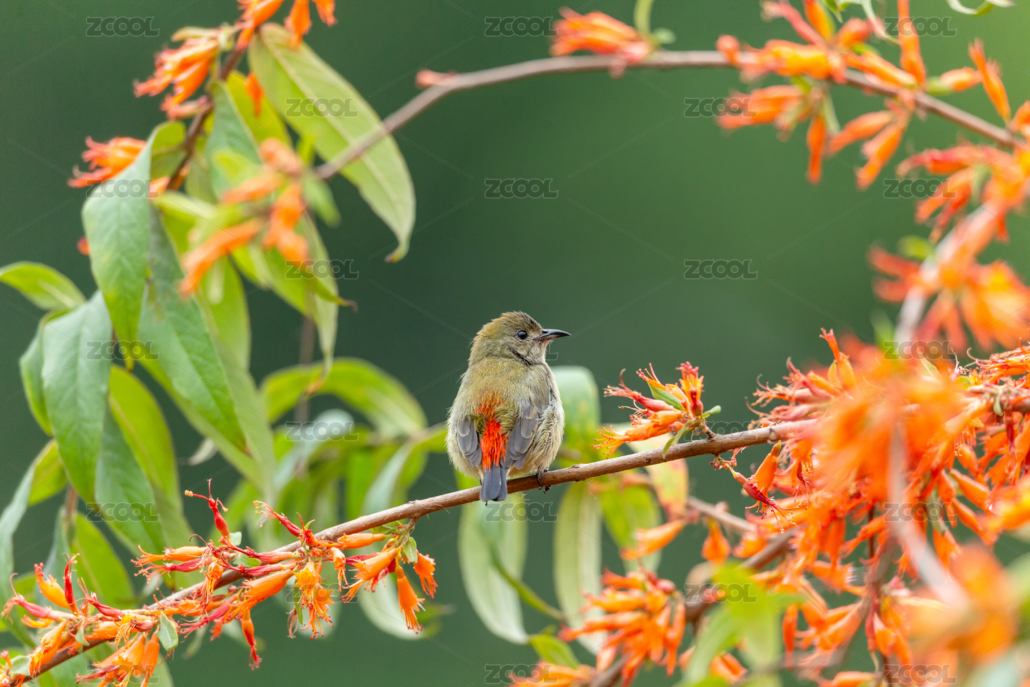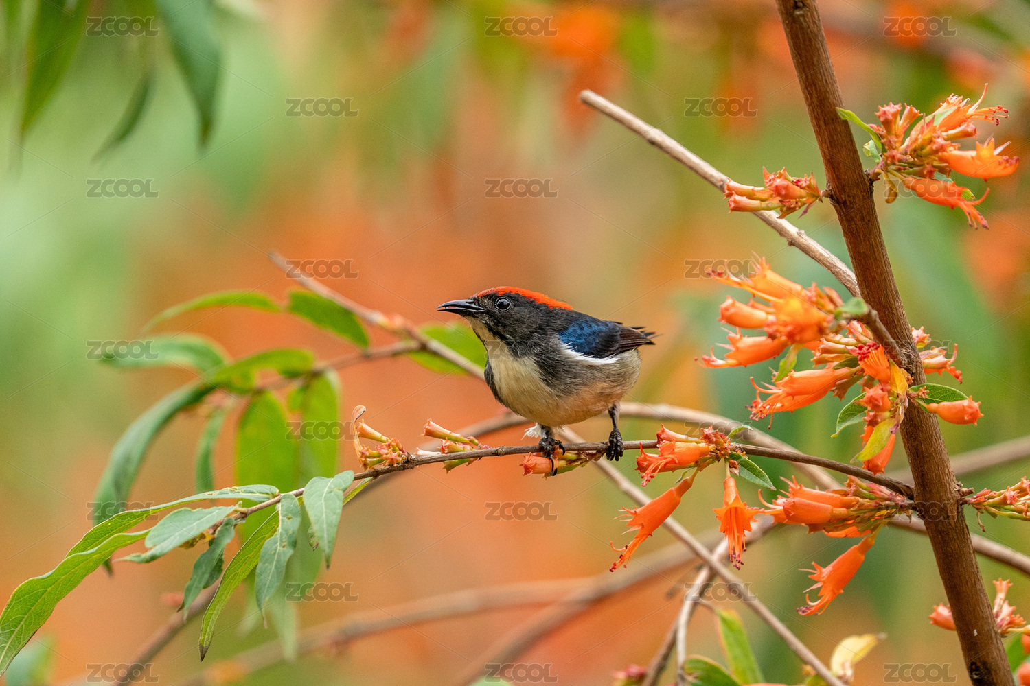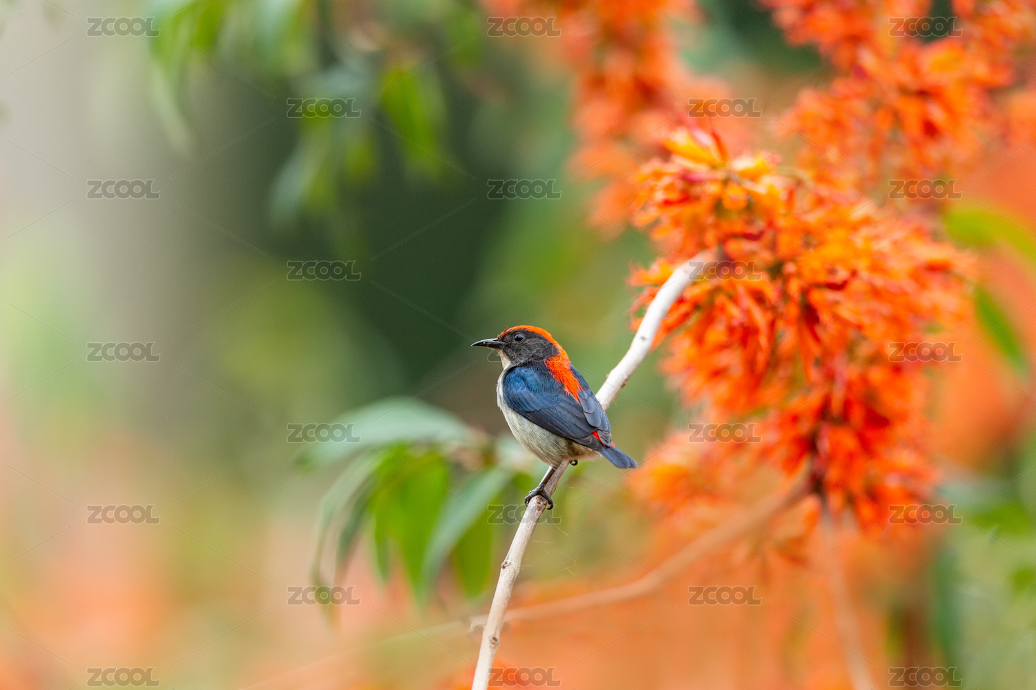 朱背啄花鳥穿梭于蝦米花樹從吸食花蜜
