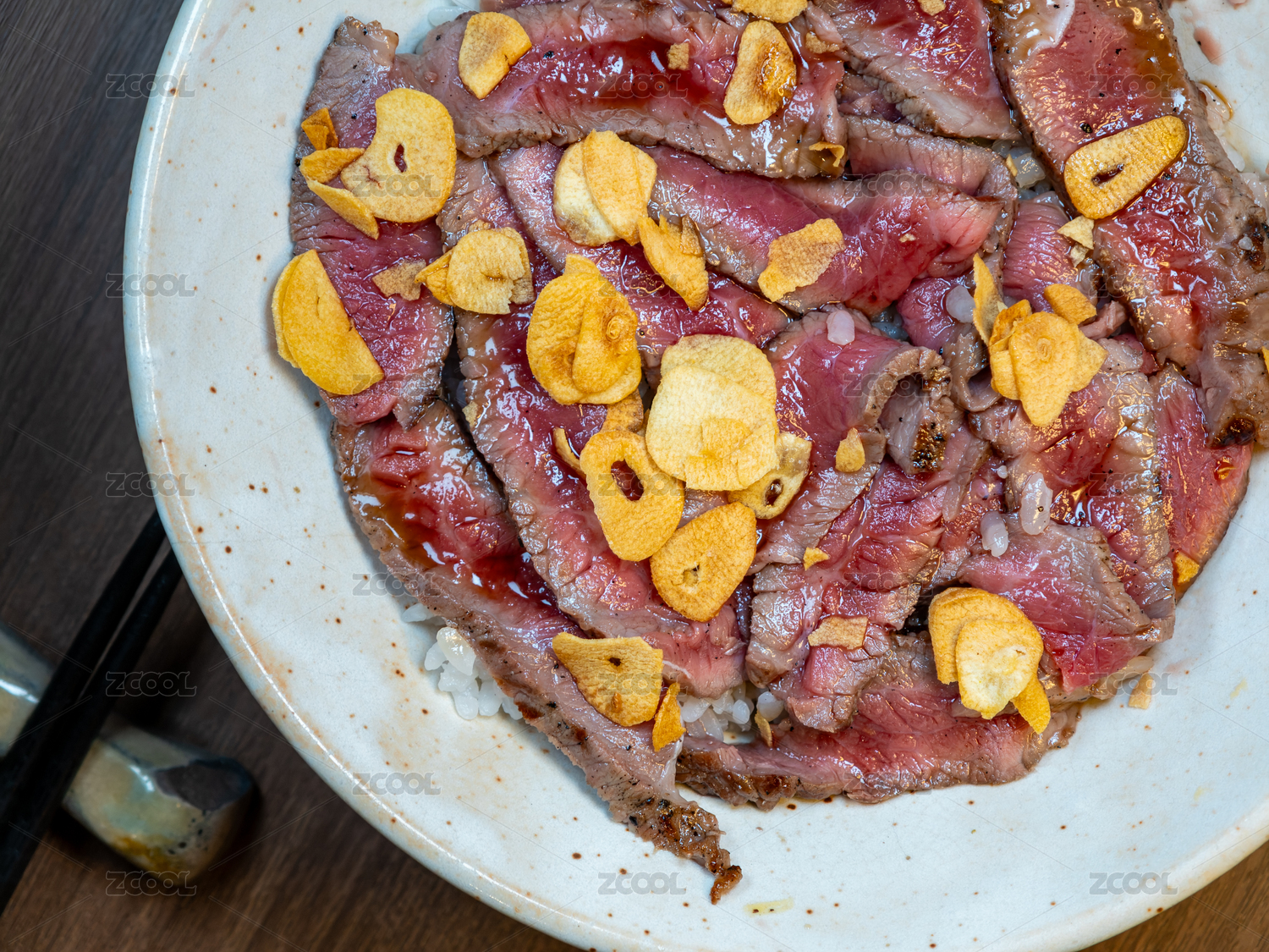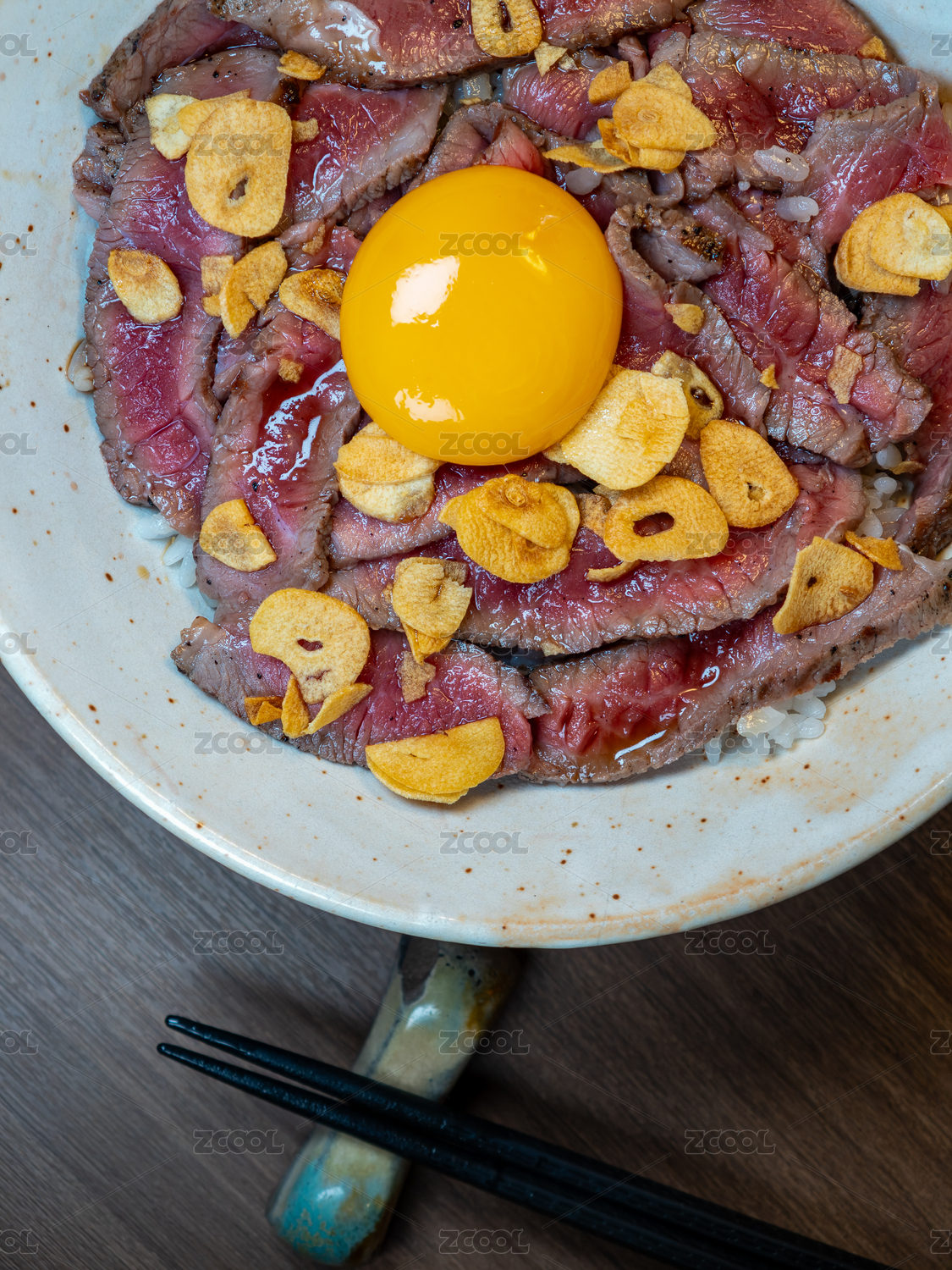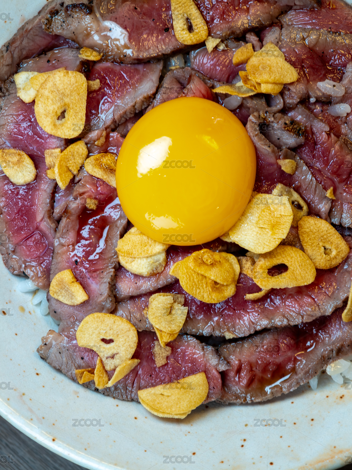 頂上放有生蛋黃和香脆蒜片的日式烤牛肉丼飯