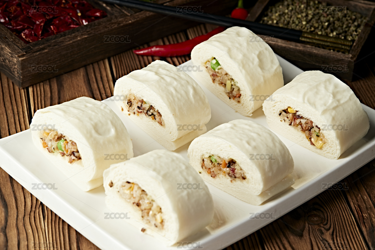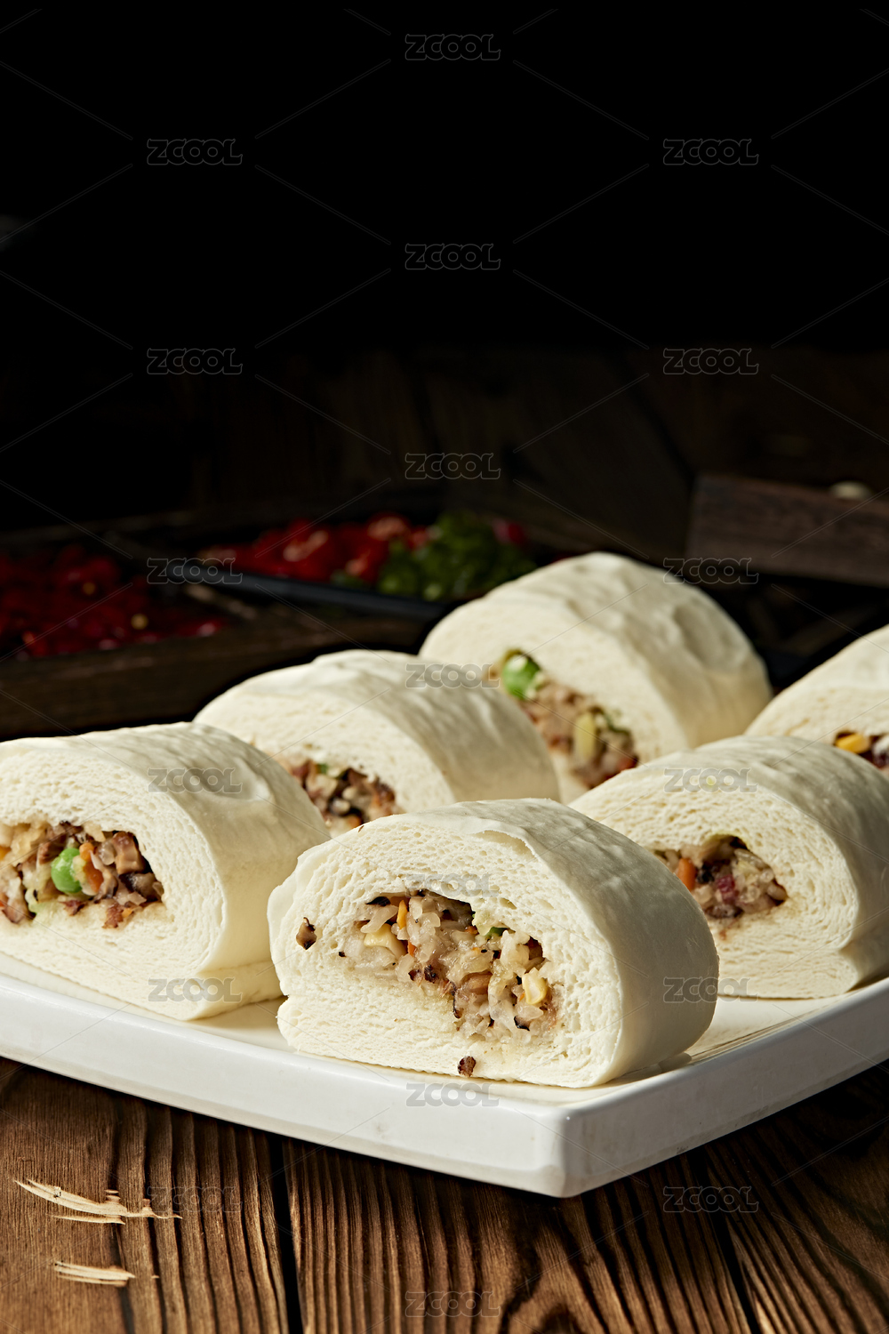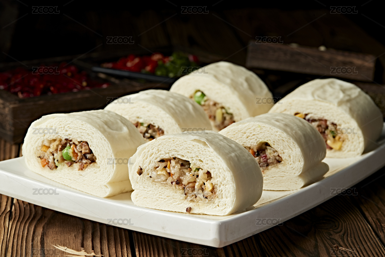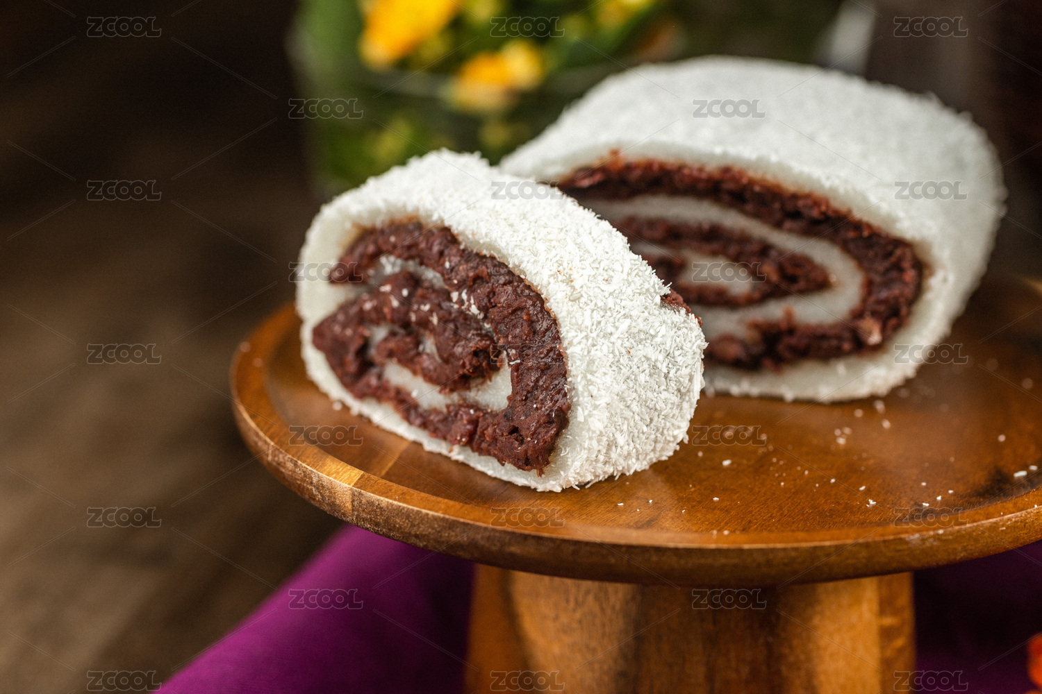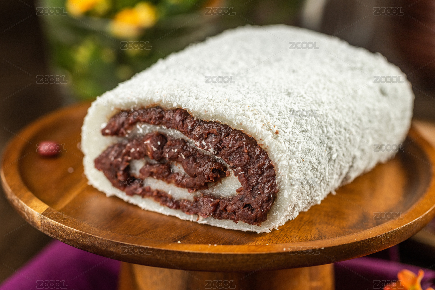 瓷碗里放著一塊椰蓉豆沙糯米卷