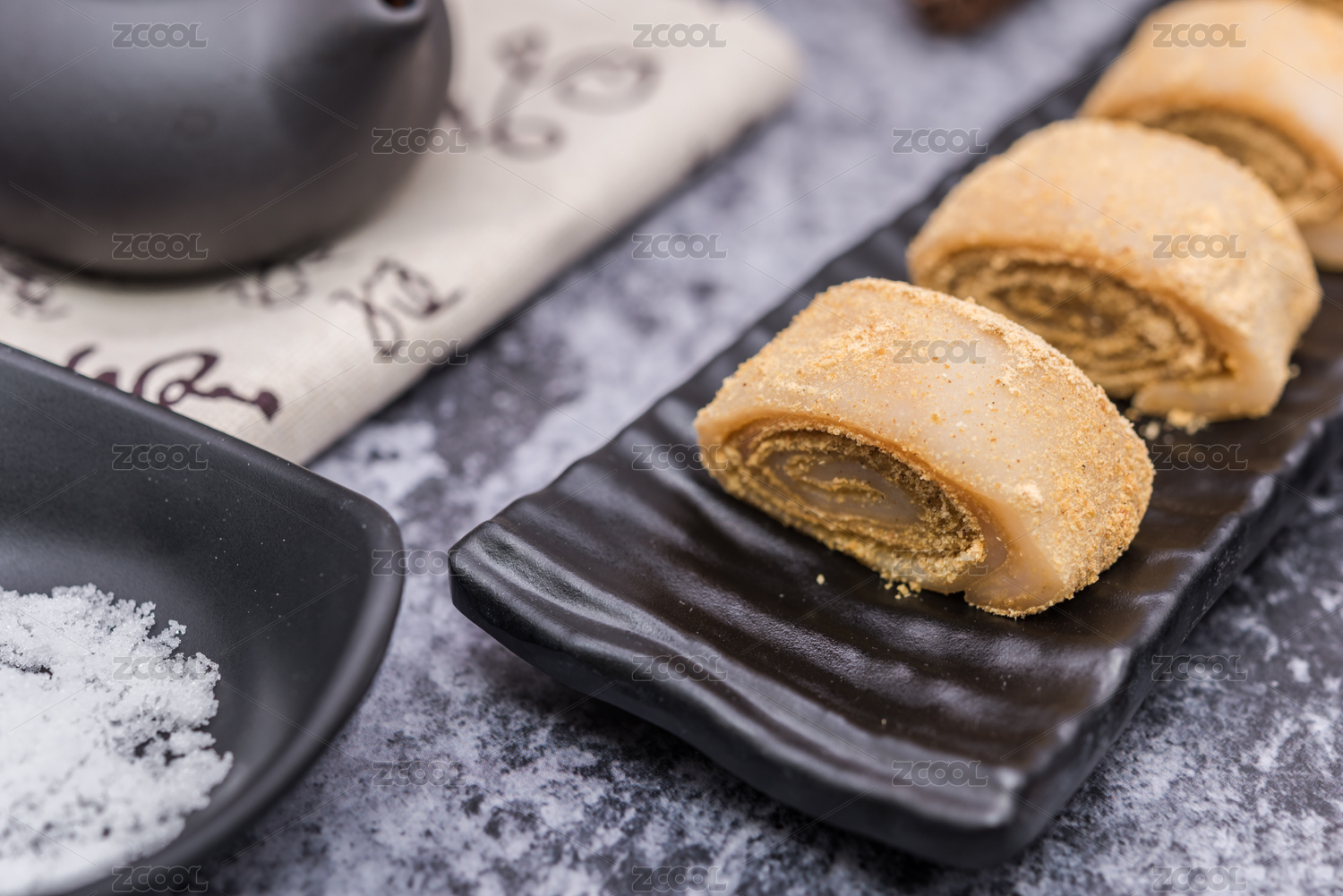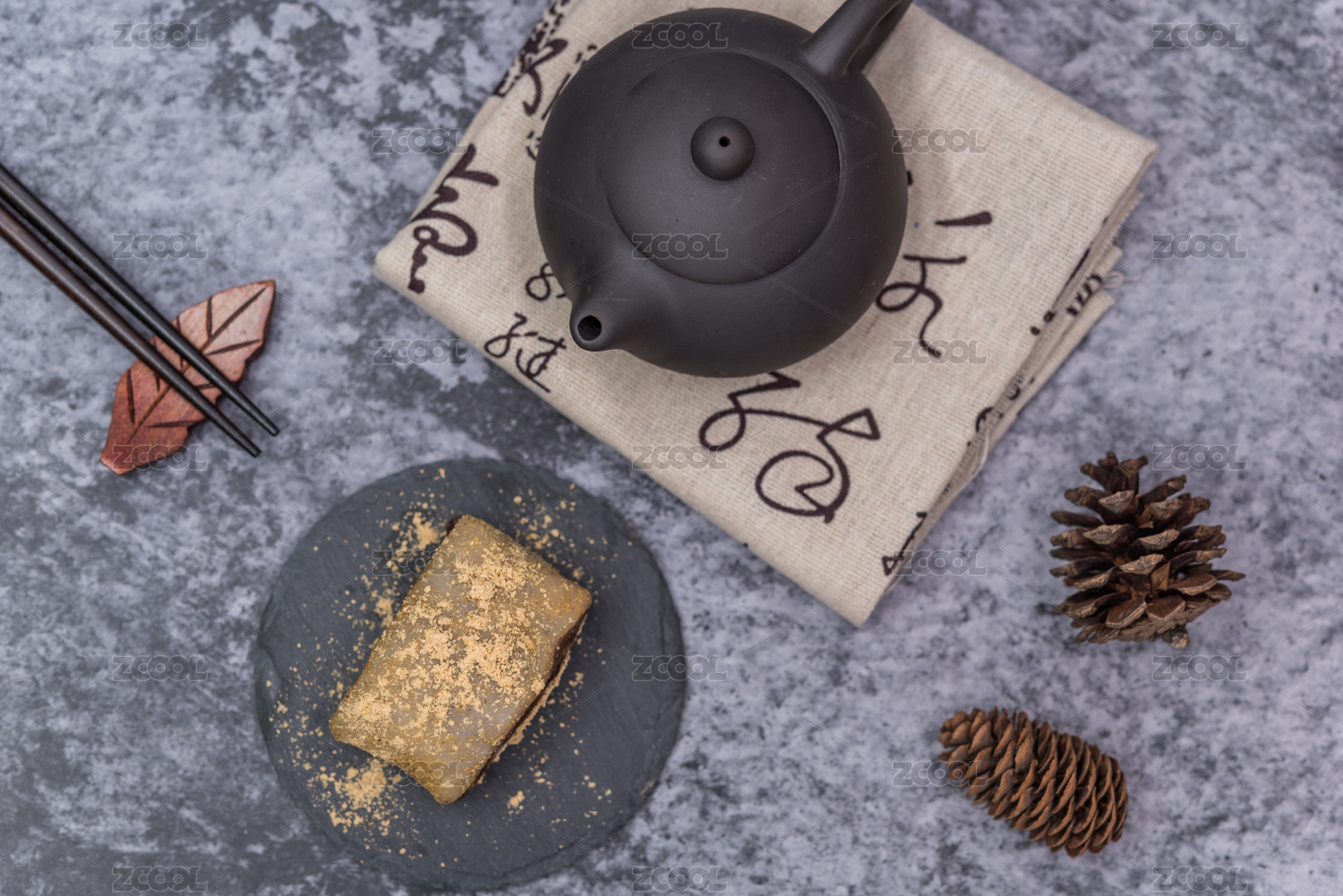 在紫砂壺和書法的中國(guó)風(fēng)背景前有一盤中式小吃驢打滾