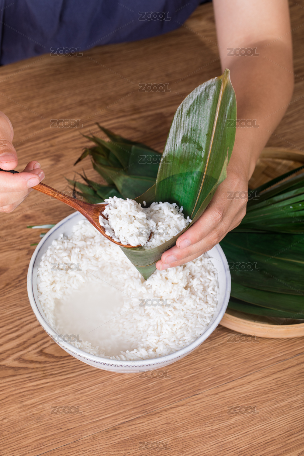 裝有糯米的木勺正在往卷好的粽葉里倒糯米