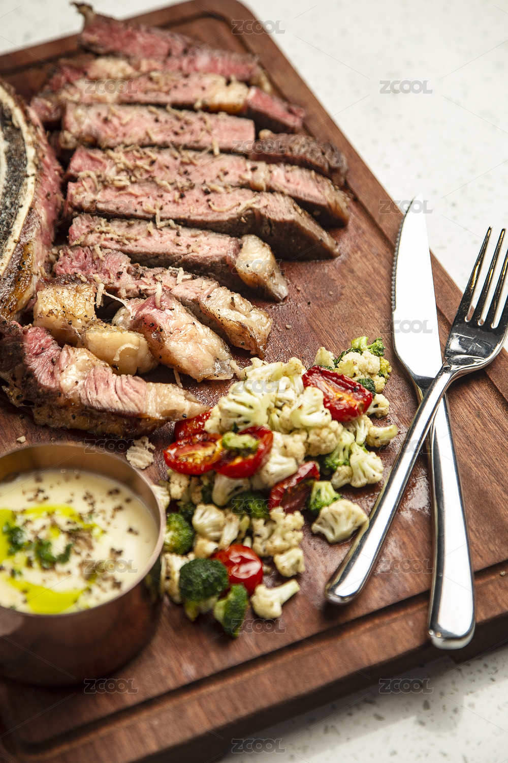 八成熟的戰(zhàn)斧牛排套餐拼盤