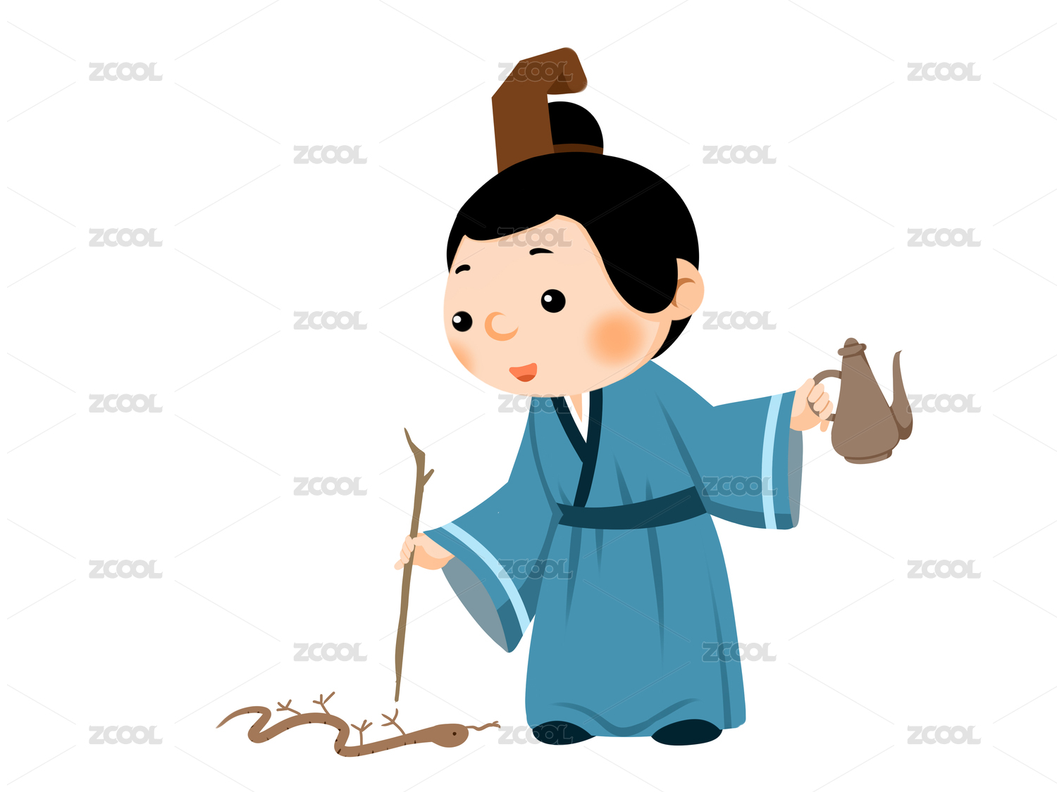 成語畫蛇添足古裝藍色衣服男孩在地上畫蛇