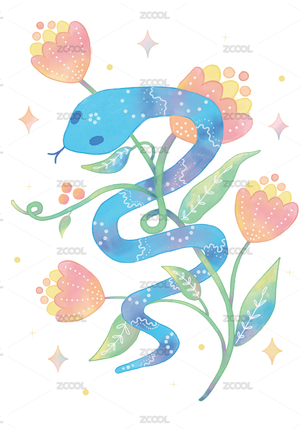 蛇與花原創(chuàng)手繪蛇年水彩夢幻清新裝飾插畫